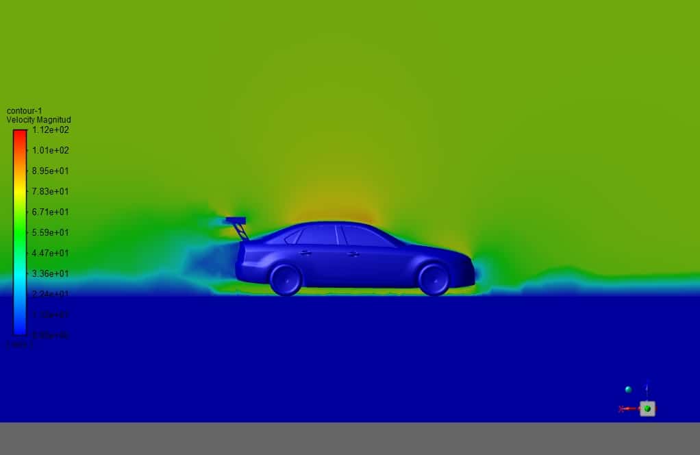 The considered speeds are 22, 46, and 70 meters per second (m/s), and at the highest speed, the car’s stability in the case in which a spoiler has been added is examined.
