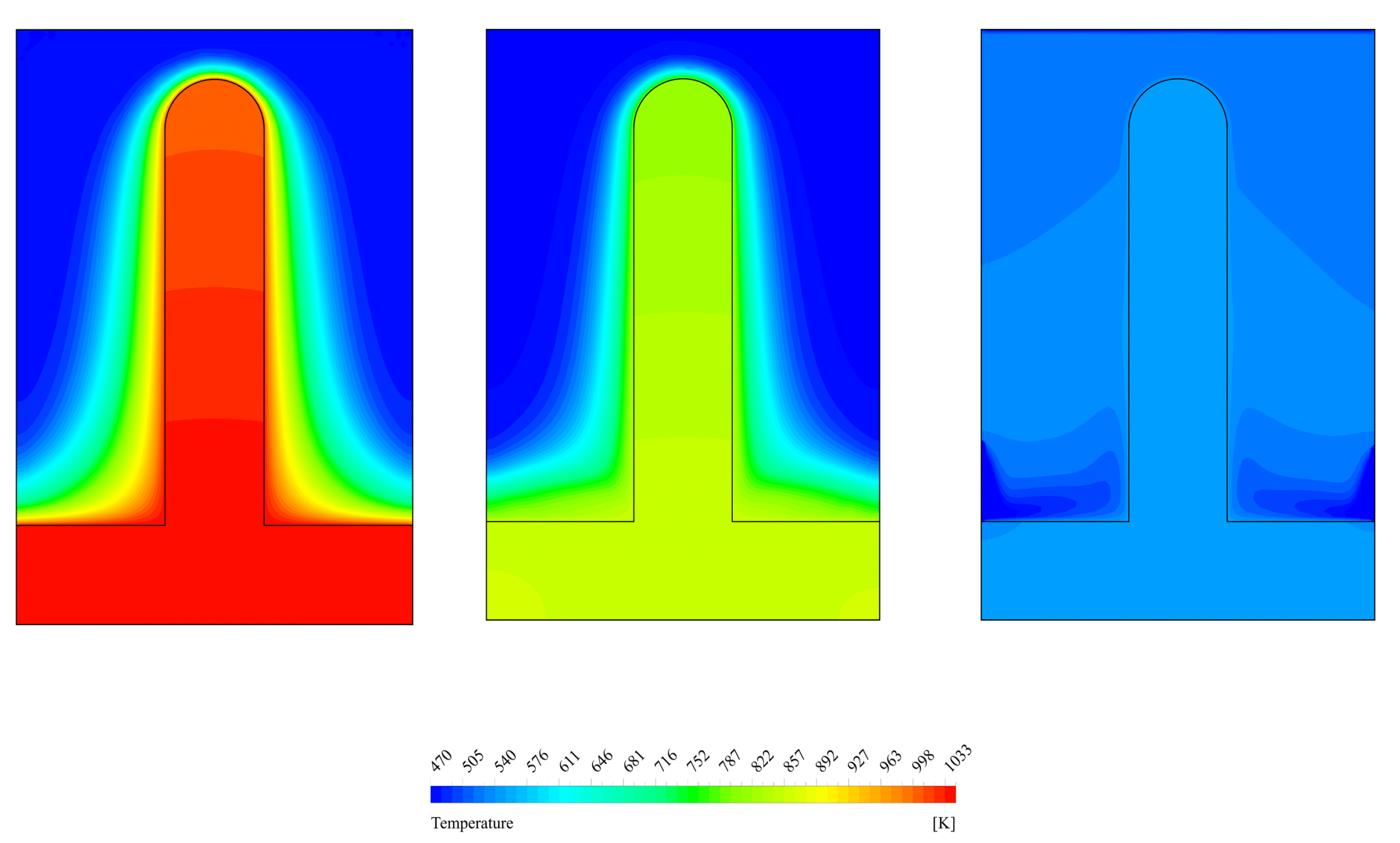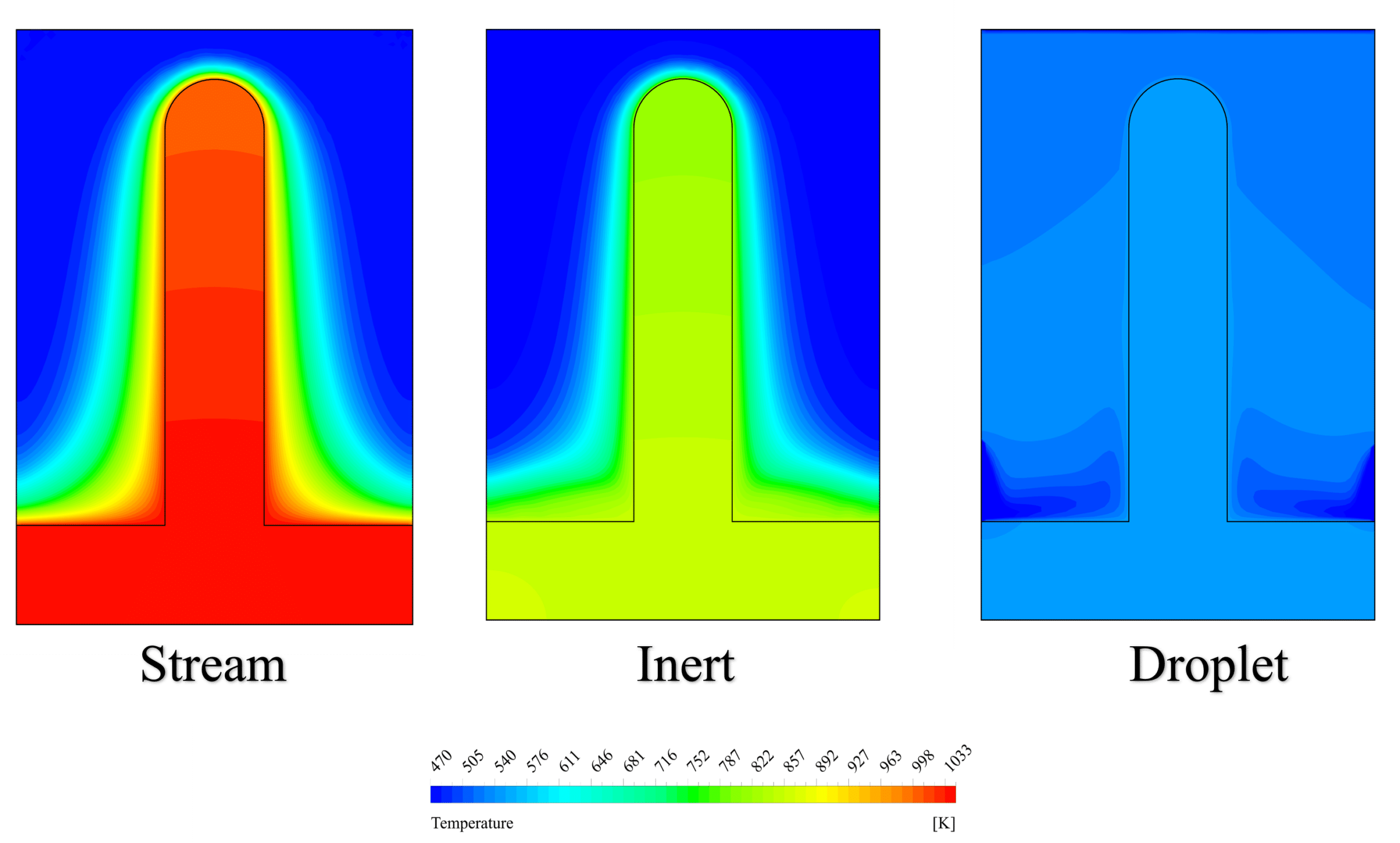 The most remarkable results were observed with Case 3 using the droplet DPM model, which achieved the most substantial cooling effect. In this case, the solid zone temperature decreased dramatically to 546 K, representing a 47.1% reduction from the baseline case. Similarly, the fluid zone temperature dropped to 524 K, showing a 15.2% reduction. This superior performance can be attributed to the comprehensive physical modelling incorporated in the droplet DPM approach.