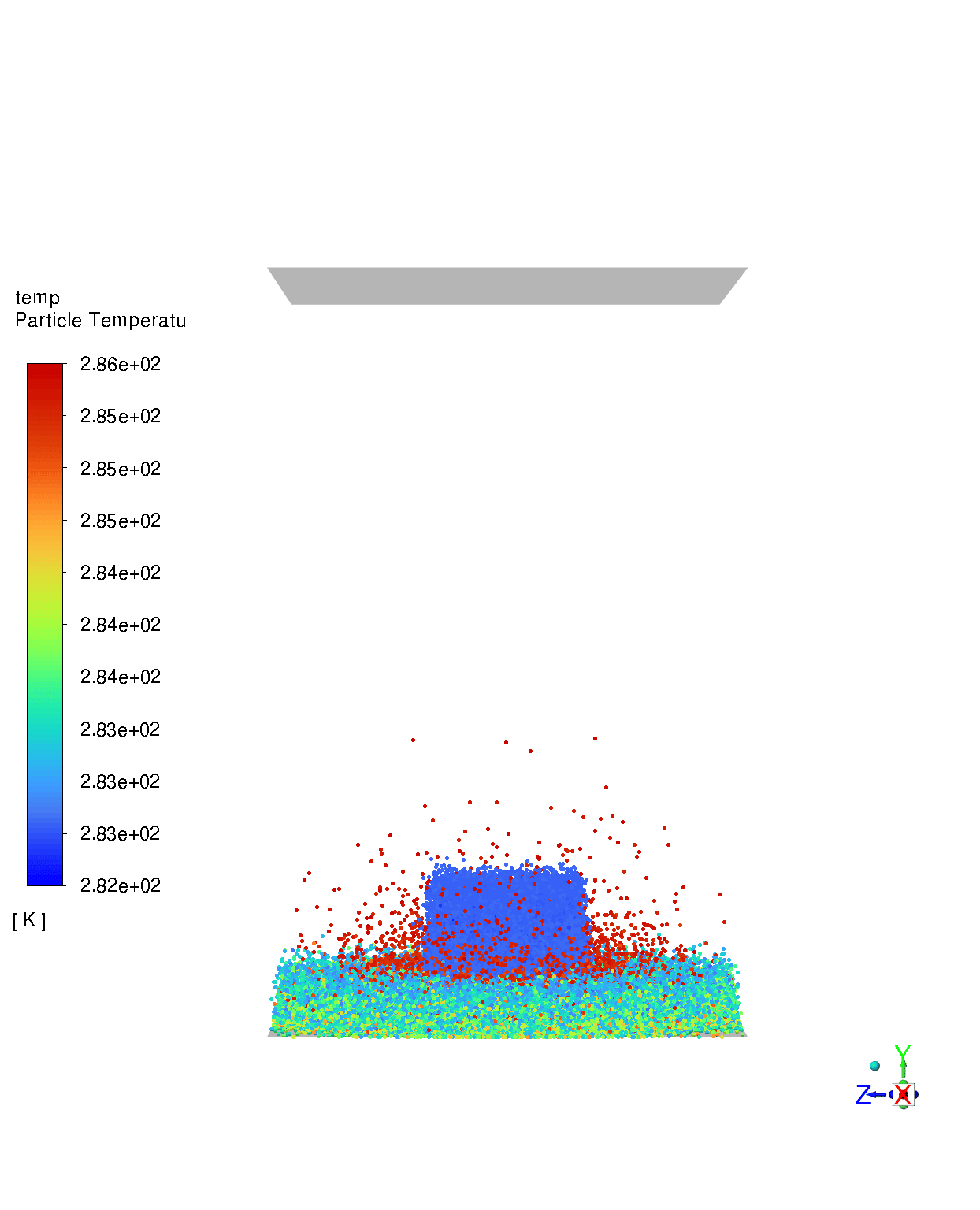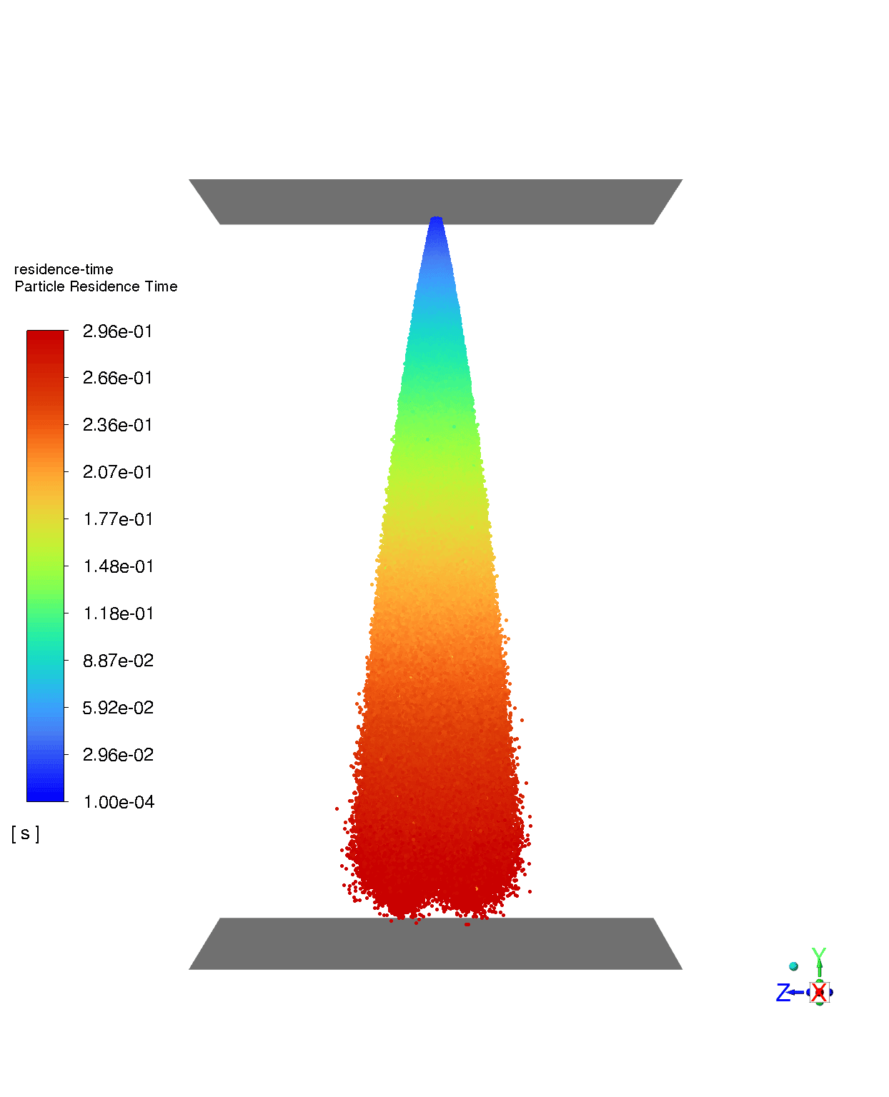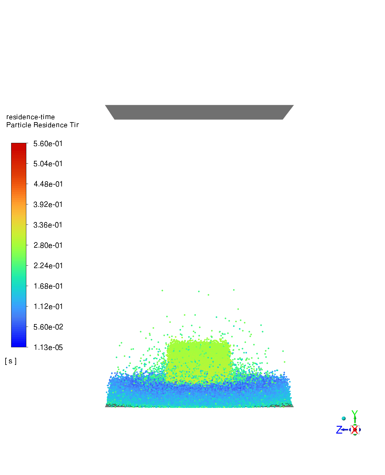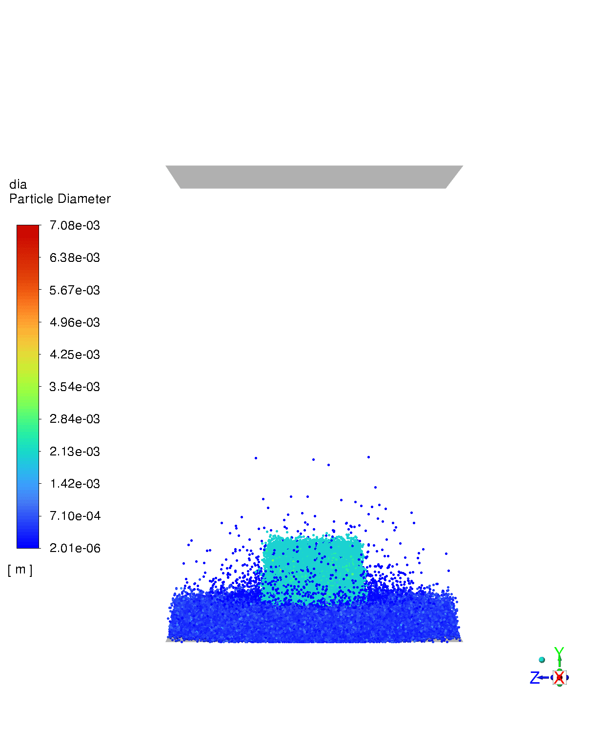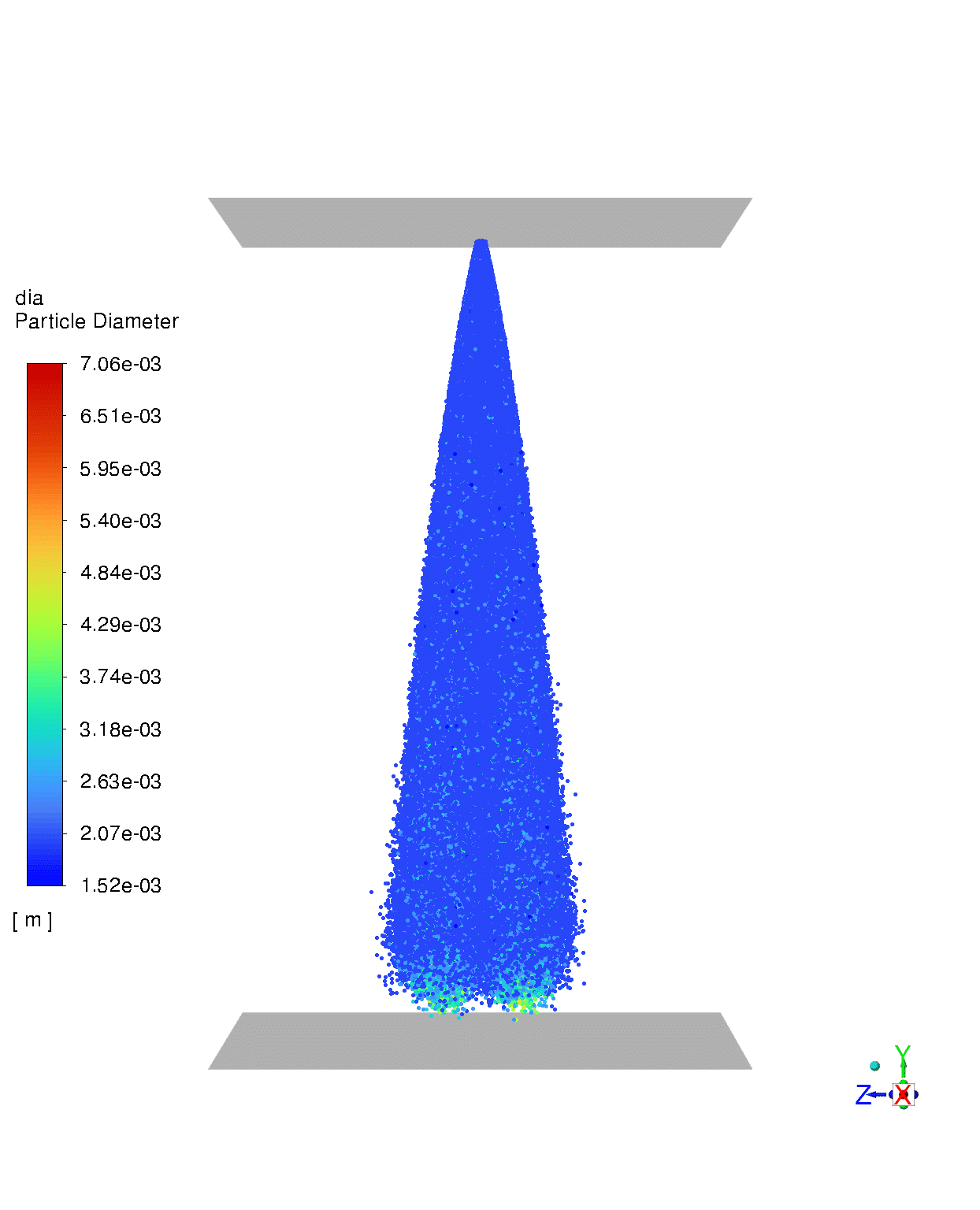 In the spraying process, the droplets are distorted and their shape doesn’t remain spherical. On the other hand, the drag coefficient strongly depends on droplet shape. Thus, dynamic-drag drag law and Discrete Random Walk Model are used. Furthermore, the floor has a Wall-film DPM boundary condition leading to film formation instead of terminating trajectory calculations.