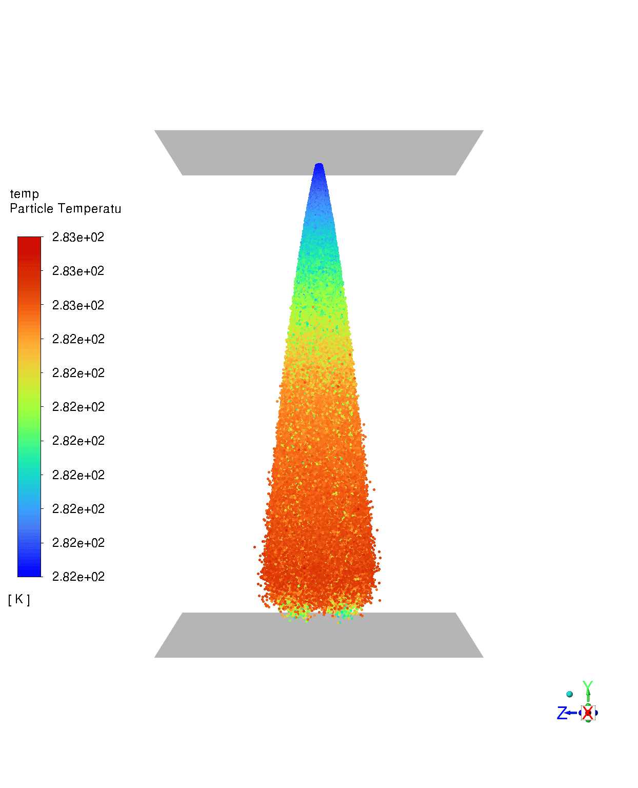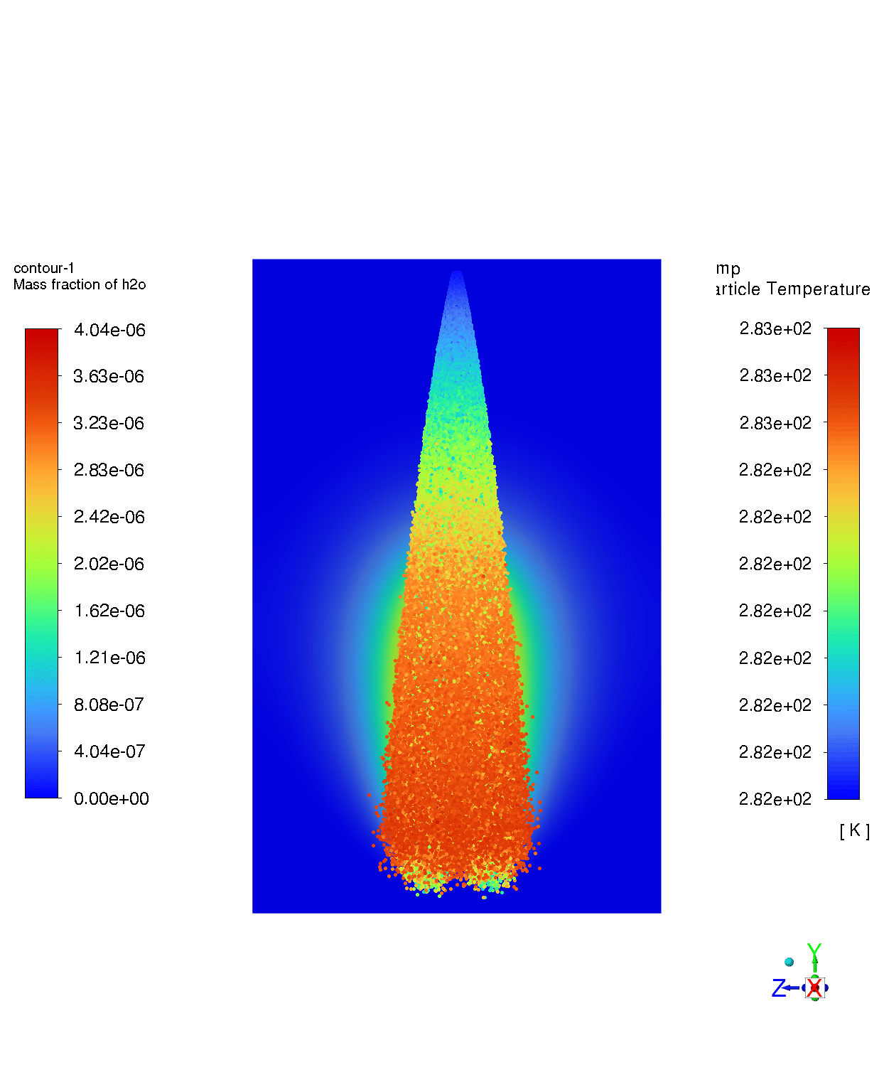 The 2 mm diameter water droplets are injected with 1.25 m/s velocity from the nozzle. The environment is warmer than the droplets, so when the temperature of the droplet reaches 282.5K, evaporation takes place. In addition, stochastic collision & coalescence, and droplet breakup are considered by using the Taylor analogy breakup model (TAB).