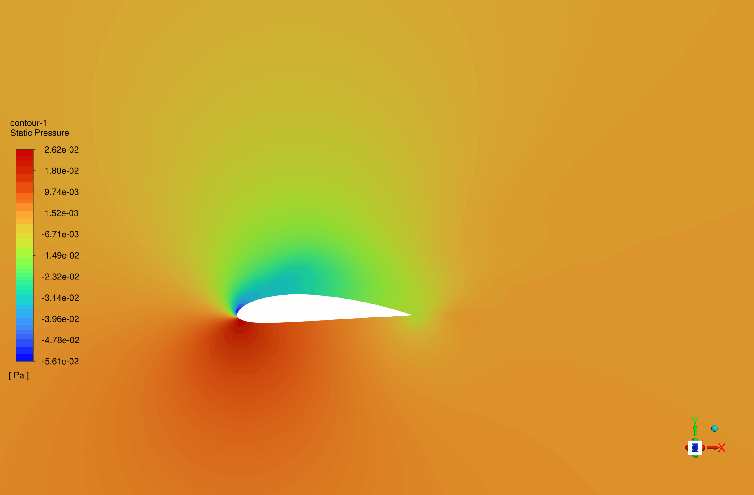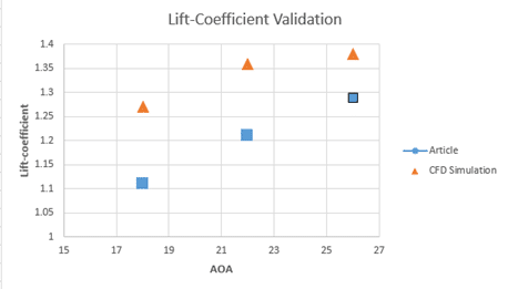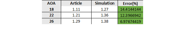 After the convergence, 2d contours were extracted, and the lift coefficient is reported. As seen in the table and plot below, in 18, 22 & 26 degrees AOA, the error is 14.4%, 12.4% & 6.97%, respectively, below 15%.