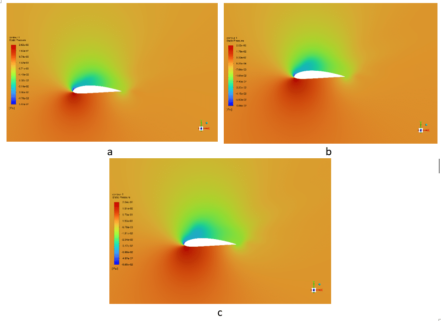 Also, velocity and pressure contours are depicted below to understand better fluid behavior in different angles of attack around the airfoil. The flow separation on the suction side is clearly visible in velocity contours.
