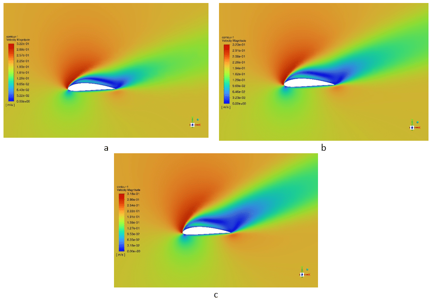 Figure 4- Velocity contours around the airfoil at a) AOA 18, b) 22 AOA, c) 26 AOA