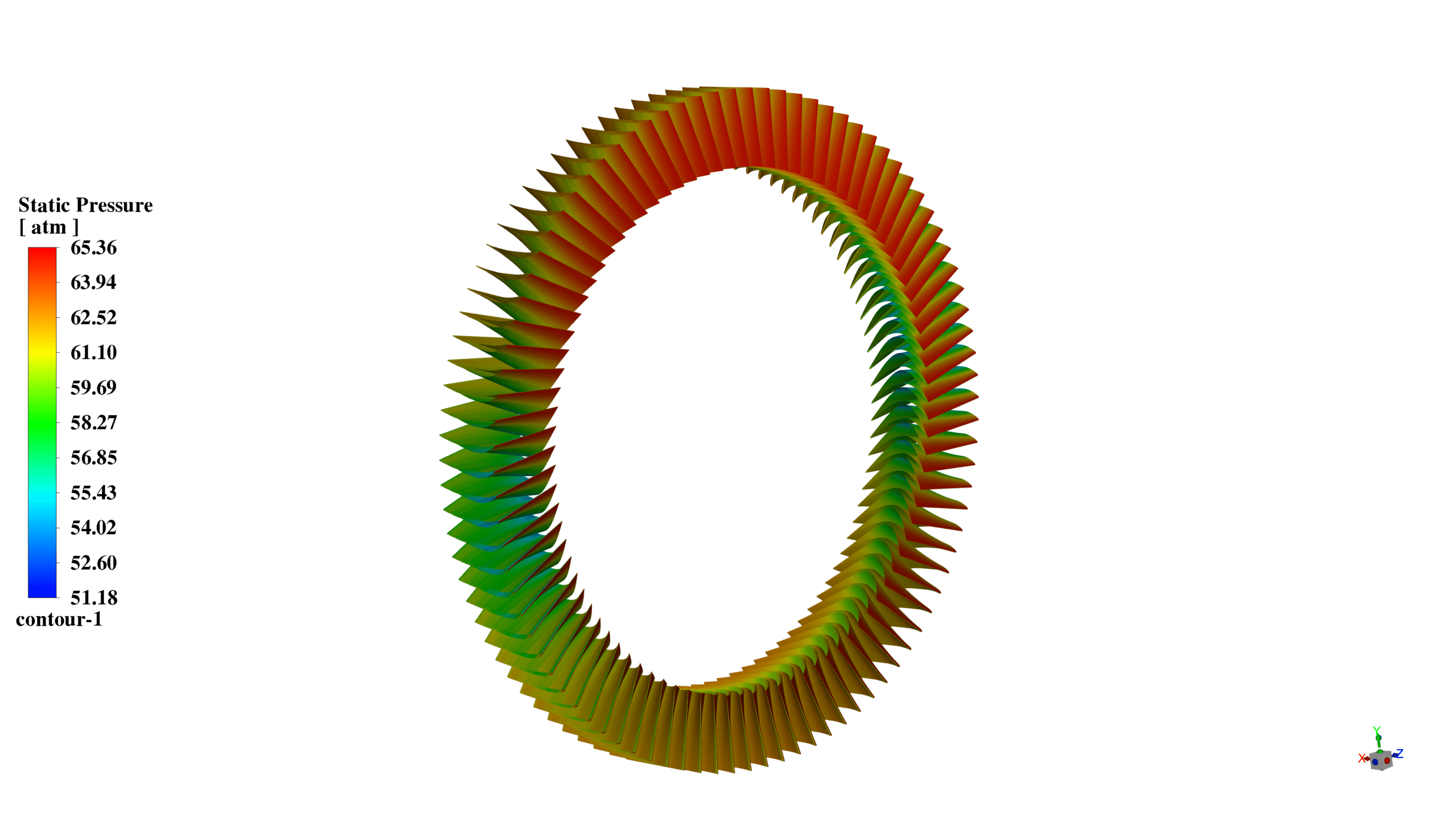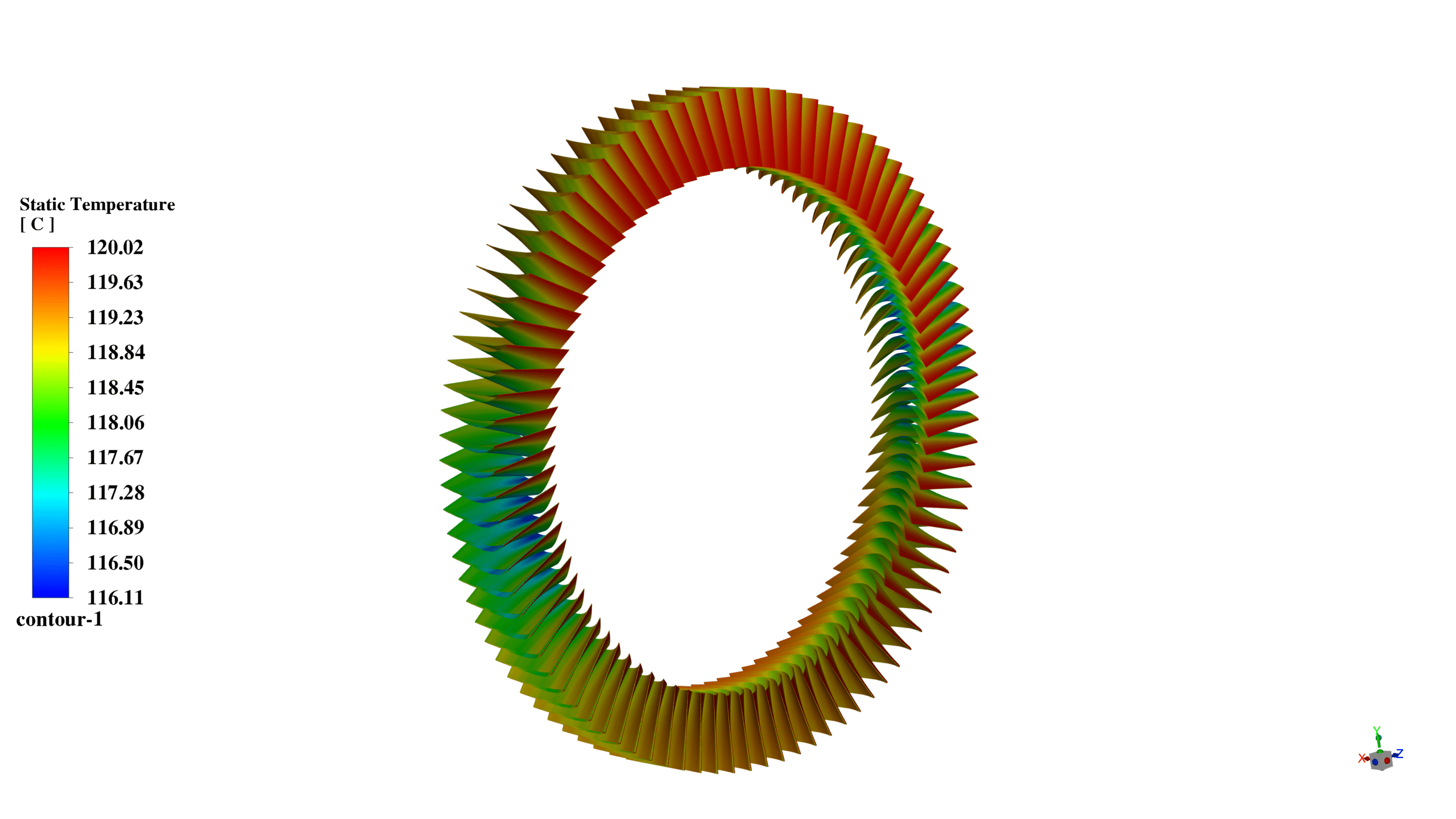 The simulation results demonstrate the intricate flow behavior within the steam turbine. The pressure and temperature distributions provide insights into the energy conversion process, while the velocity profiles reveal the flow acceleration through the blade passages. At the Inlet, the pressure is higher than in other regions, and it gradually decreases toward the outlet. In the temperature contour, you can see that the temperature is also highest near the Inlet. Between the blades, the temperature reaches its minimum, and in this region, the pressure is also low. For the velocity contour, you can see that in the same region where the pressure and temperature are lowest, the velocity is higher than in other areas. This behavior is consistent with the flow acceleration through the blade passages.