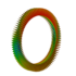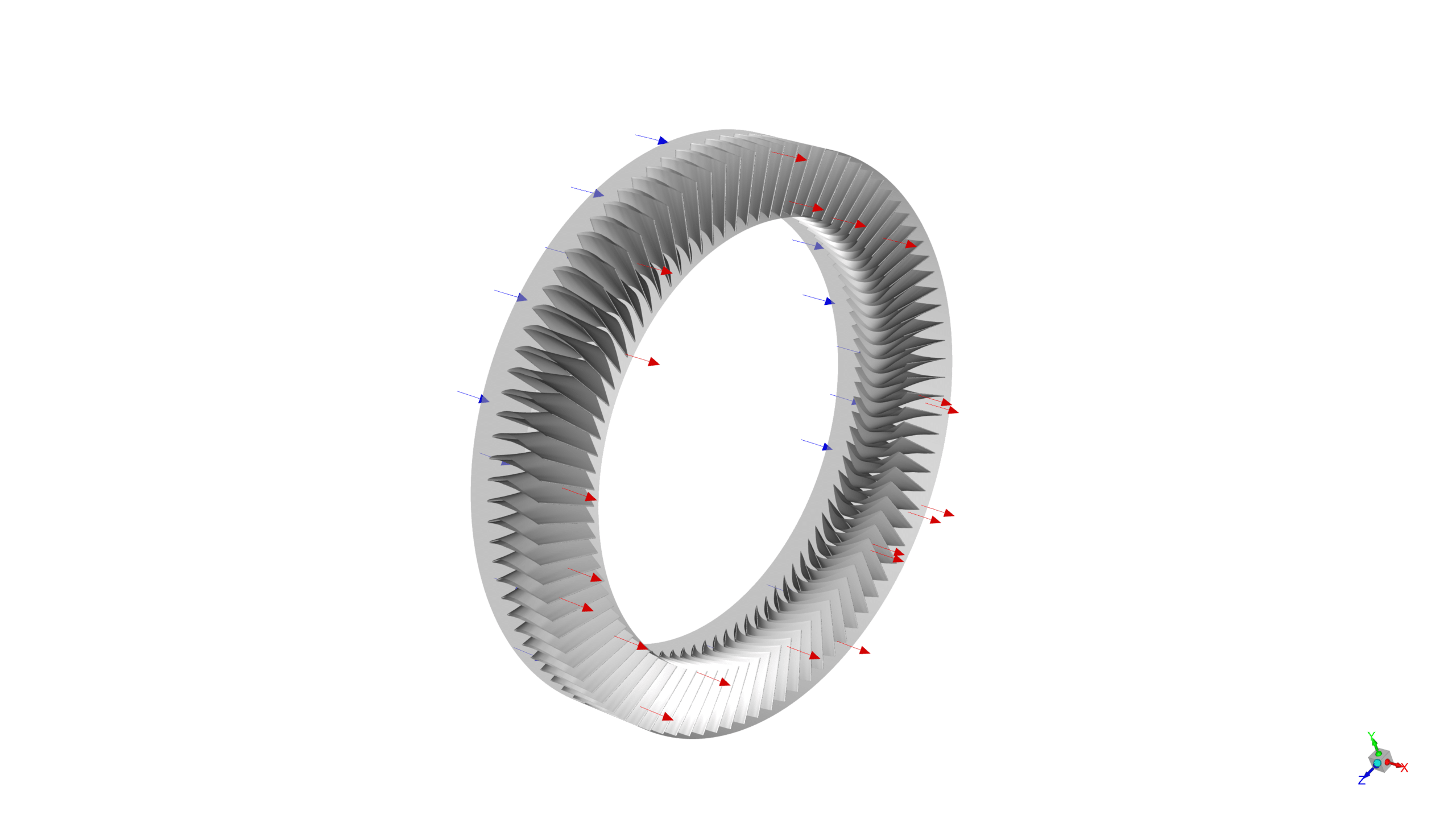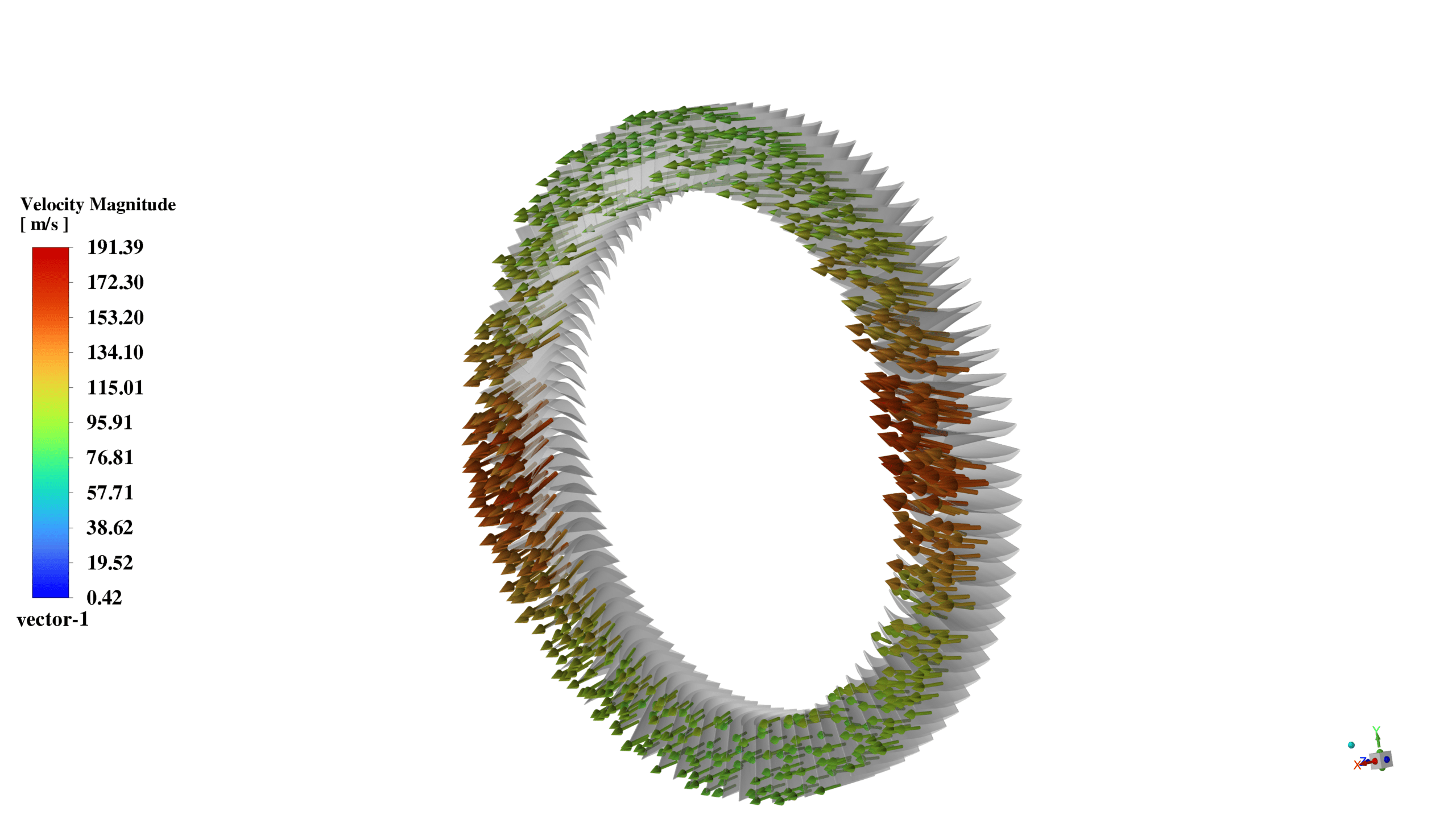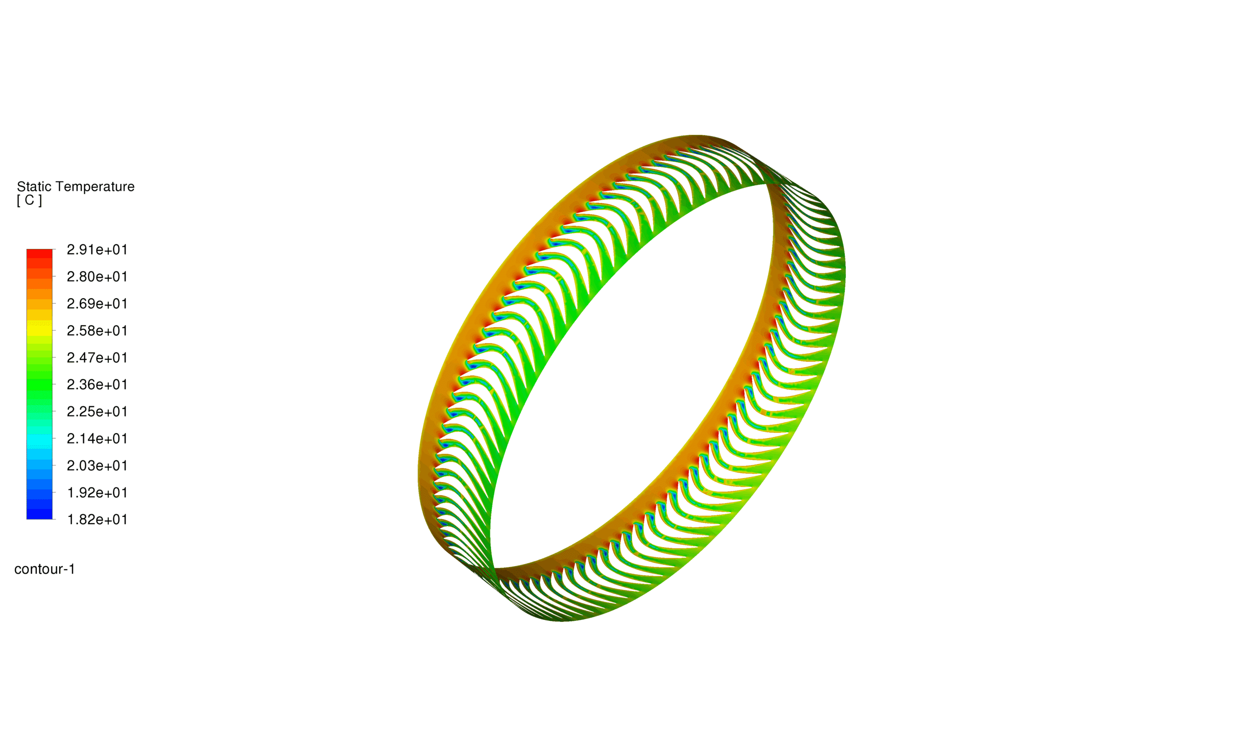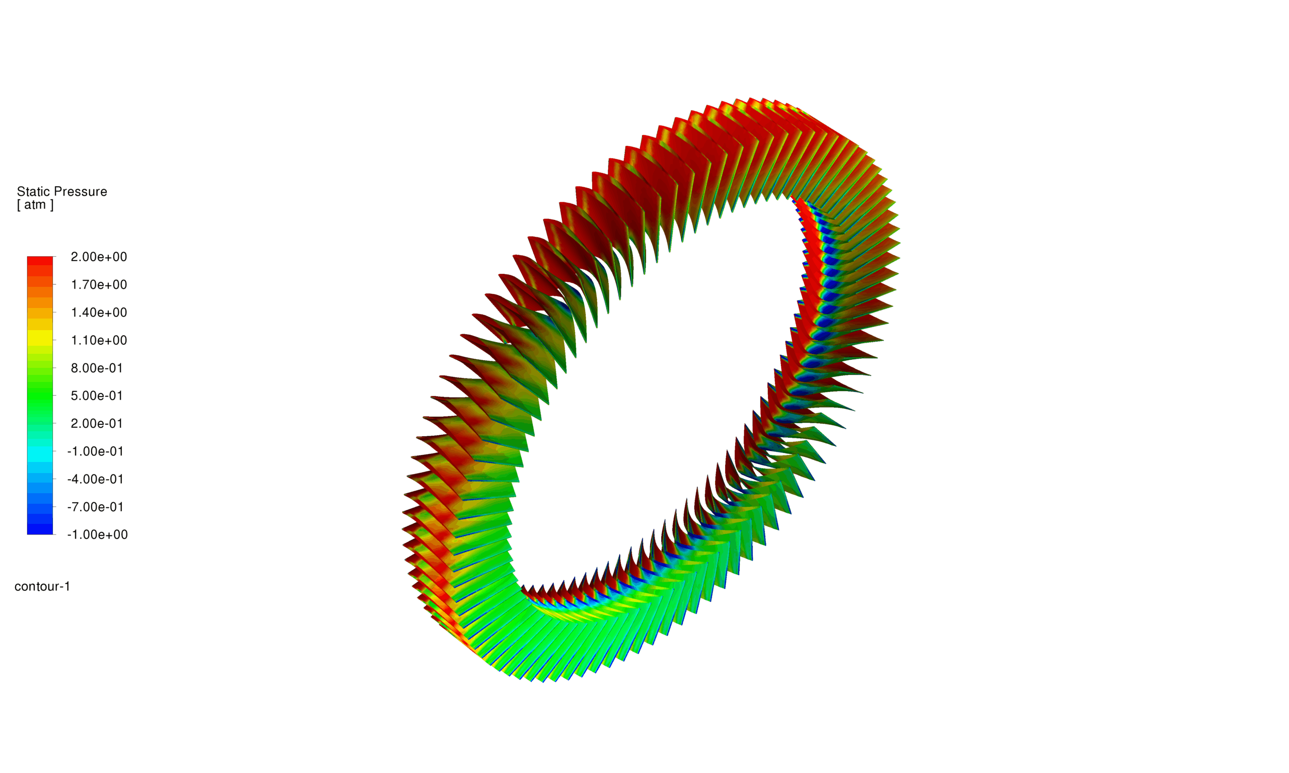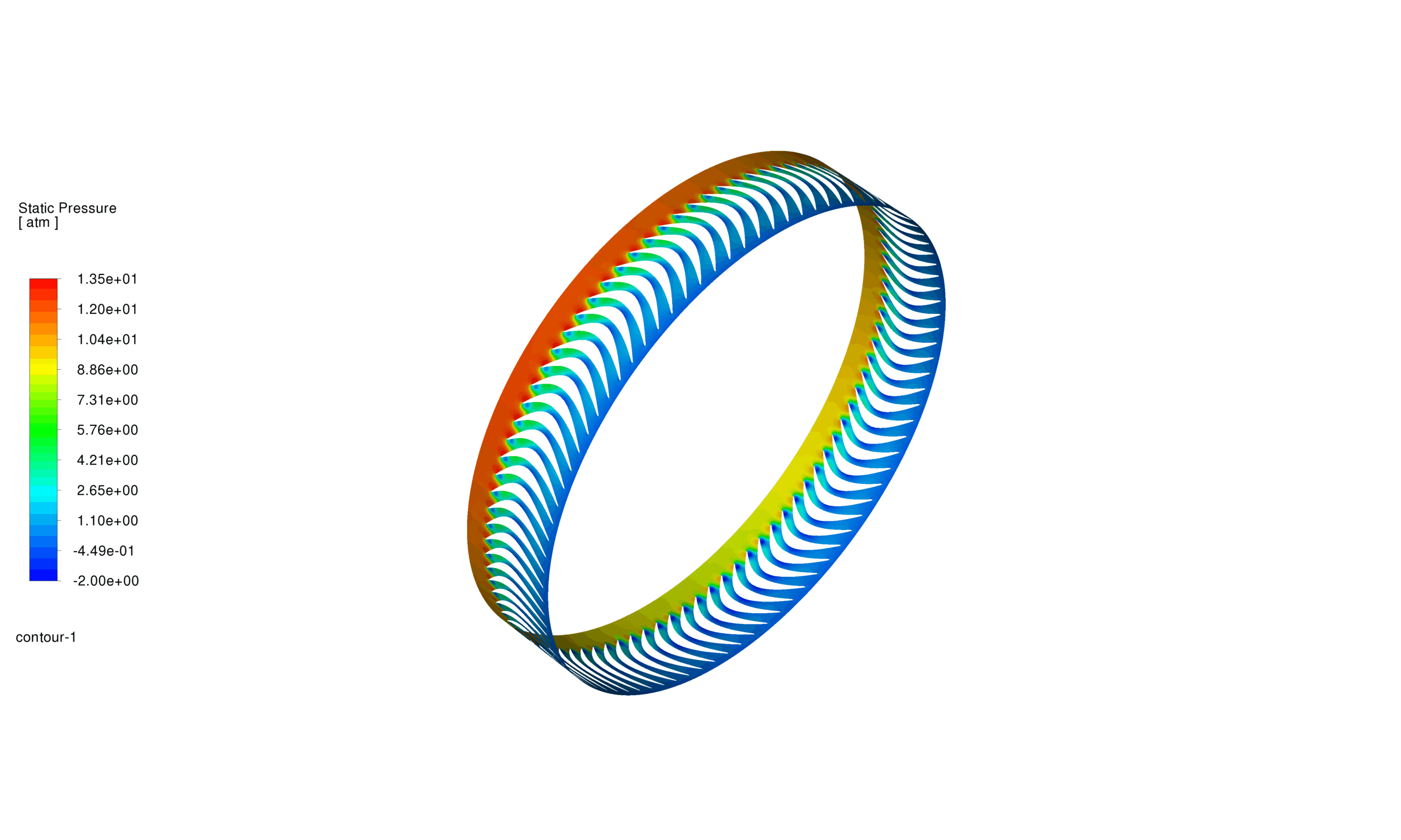 A density-based solver is employed for the solution and is suitable for compressible flow simulations. For turbulence modeling, the Realizable k-ε model with standard wall function is utilized, known for its robustness in predicting complex turbulent flows. The energy equation is enabled to solve for temperature distributions and heat transfer effects. The working fluid is air, with real-gas-peng-robinson model is employed for compressible flow, and a moving reference frame is activated for the rotating zone at 100 rpm to capture rotational effects. We employ an implicit formulation for numerical stability and efficient convergence.