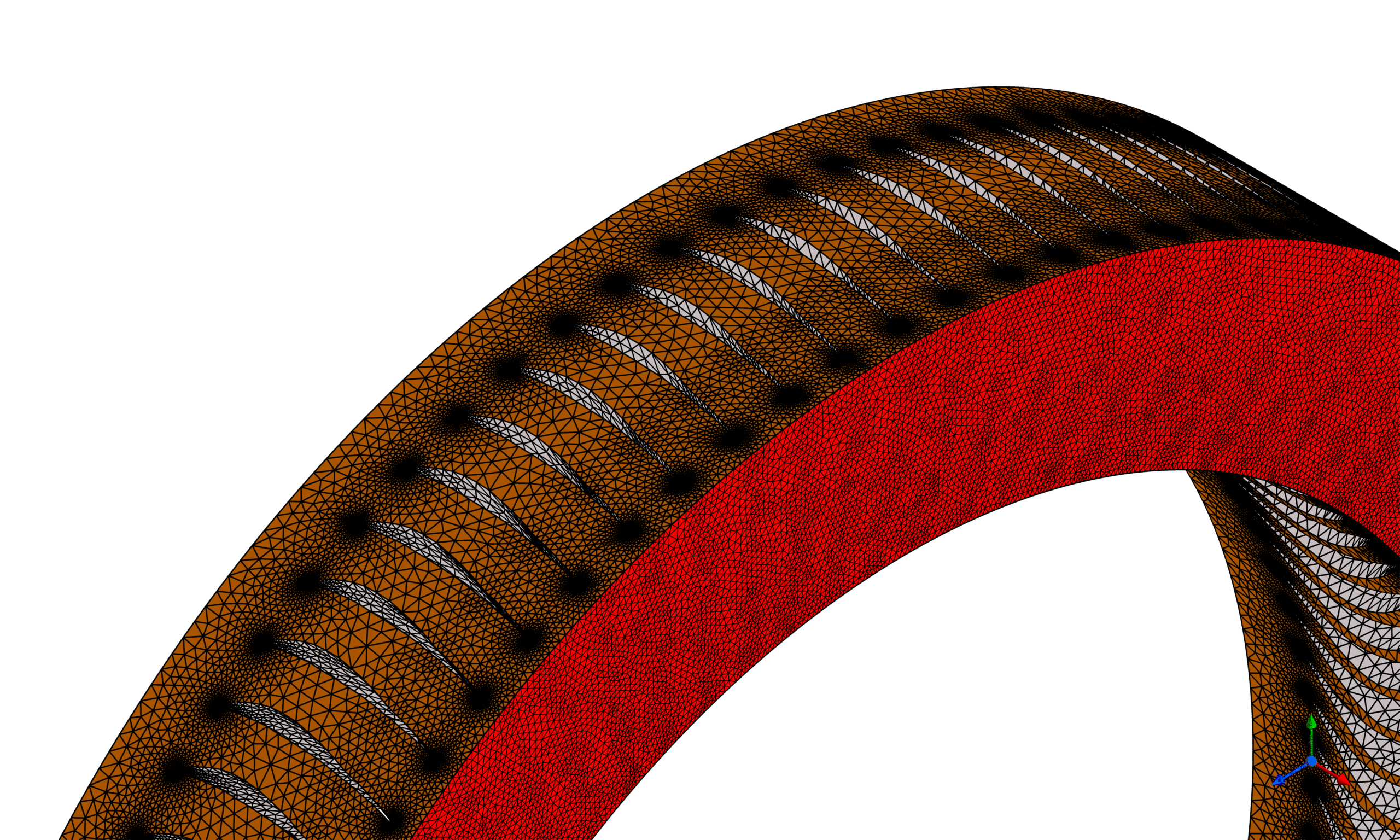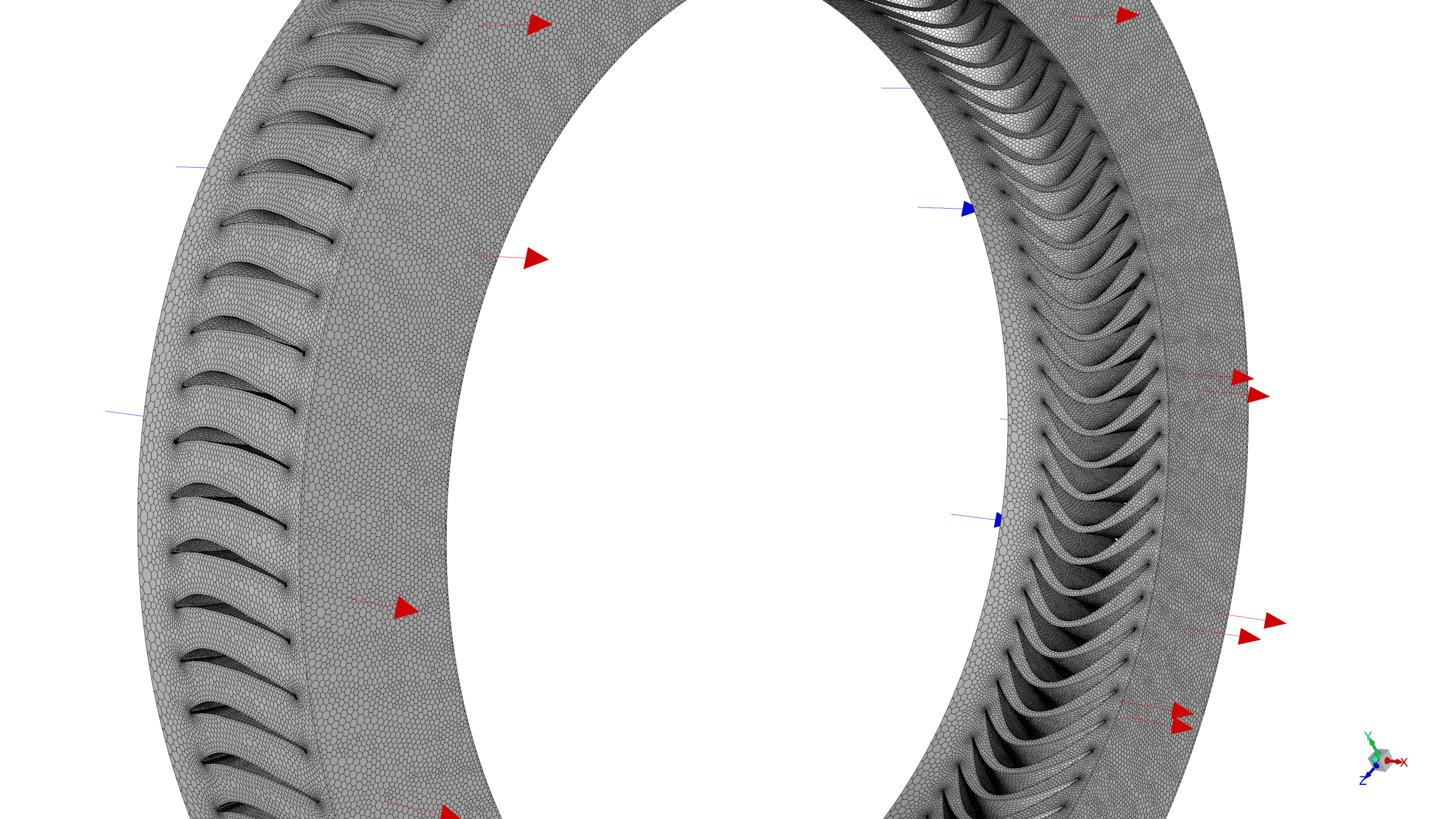The CFD simulations were conducted using ANSYS Fluent software. The geometry, which is designed in Spaceclaim, represents a 3-dimensional steam turbine configuration, with the mesh generated in ANSYS Meshing. The mesh consists of about 19 million tetrahedral elements, providing a high-quality representation of the complex turbine geometry.