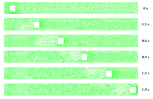The horizontal movement of the submarine robot inside the water channel creates a disturbance in the fluid’s flow patterns. As the robot moves, it introduces an obstruction to the natural flow, causing the water to redirect around the robot’s body. The presence of the robot leads to the formation of a high-pressure zone behind the robot and a high-velocity zone in front of it. Additionally, the robot’s movement may induce turbulence and vortex shedding in the water. Detailed simulations using dynamic mesh allow engineers to analyze these effects and understand the fluid-structure interactions involved.