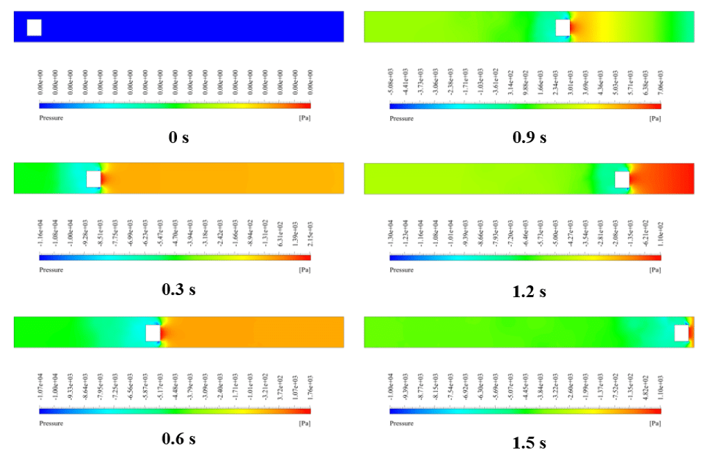 At the end of the solution process, we obtain two-dimensional contours related to velocity and pressure. Because the simulation is transient, we obtain contours at different times to compare the results over time. The contours show well that the robot in the channel has a horizontal movement and, over time, moves inside the channel containing the water flow. Also, due to the presence of the submarine robot body as a barrier in the flow of water inside the canal, a high-pressure area is created behind the submarine robot, and a high-speed area is created in front of it.