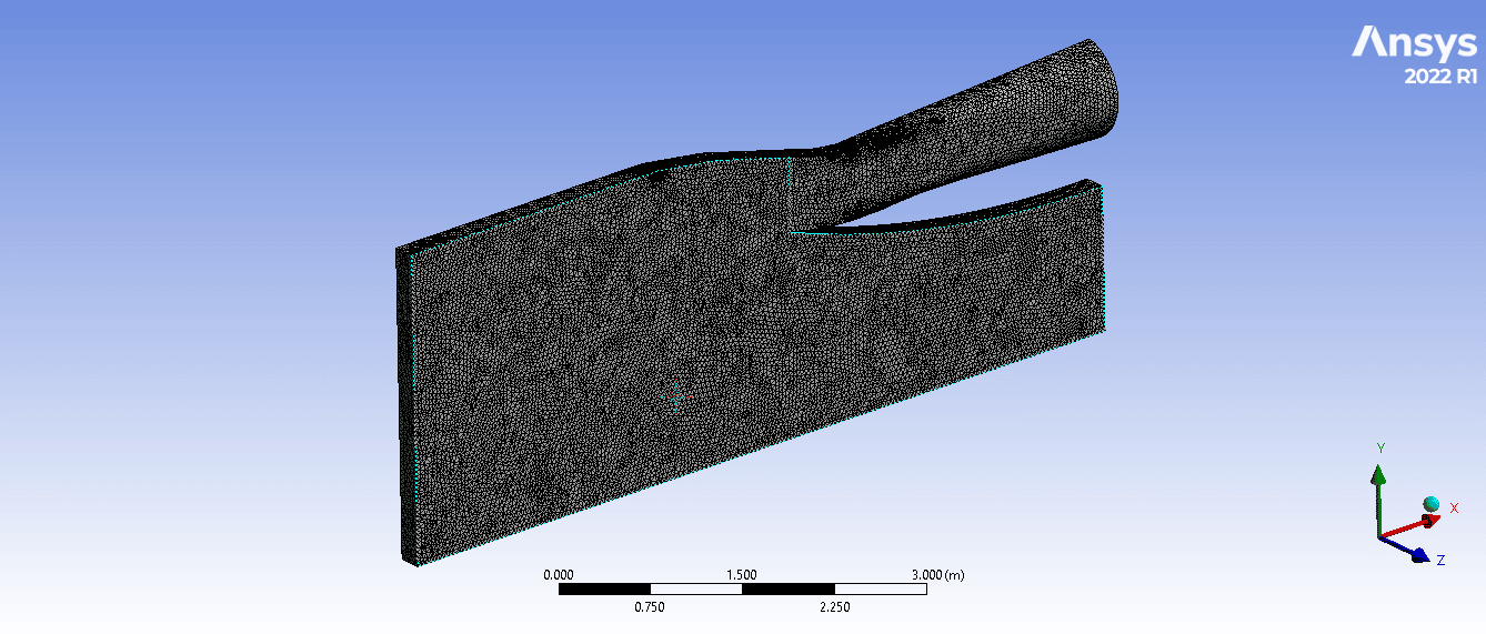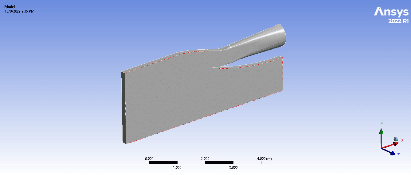 In this case, it is modeled from an Intek with a ramp, and its model is taken from the geometry of the F-15 Intak. And this inlet is placed in a supersonic flow with a speed of Mach 1.4, and the changes in speed and pressure and the speed profile along the channel are investigated.