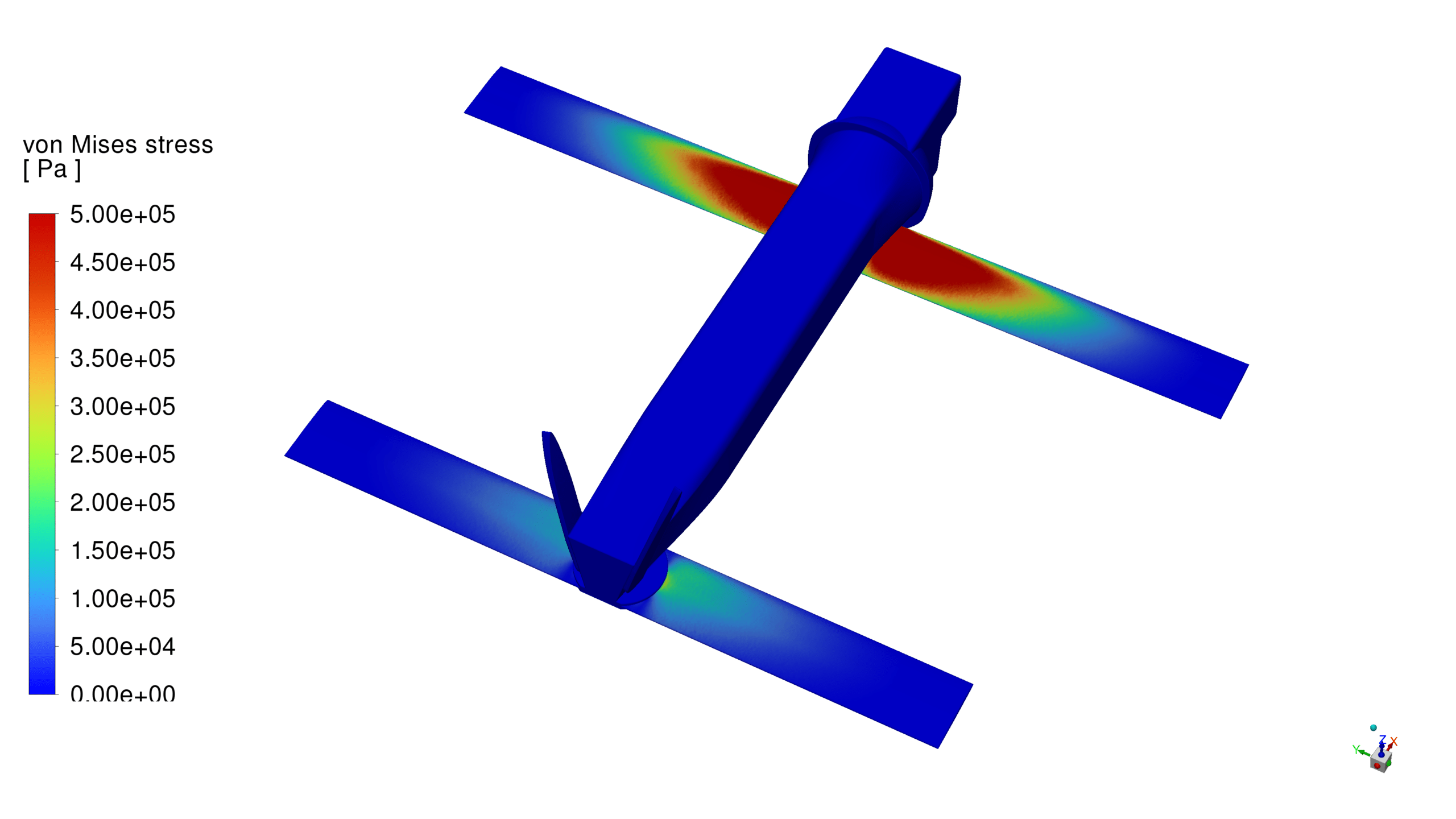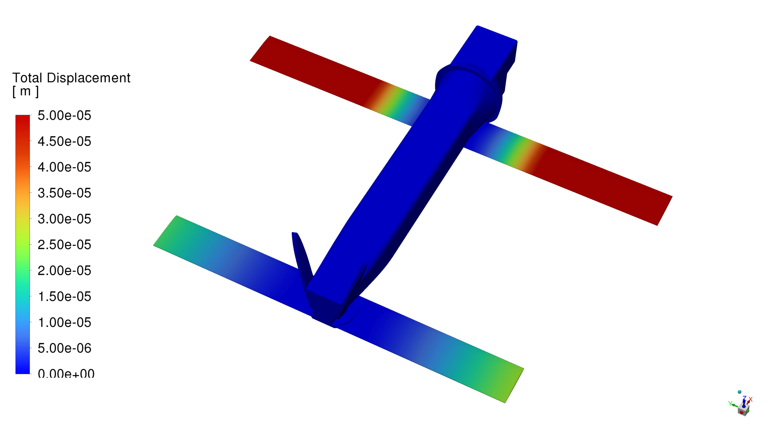 According to the extracted contours, it is observed that, as expected, the greatest displacement occurs at the wing tips of the UAV and the greatest stress is at the wing-body connection.