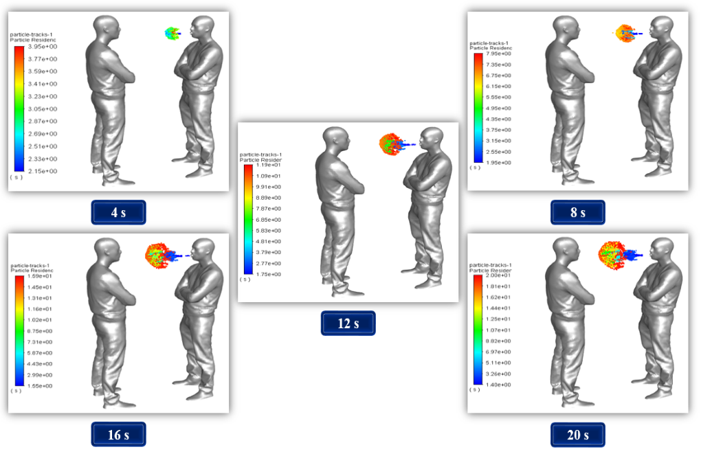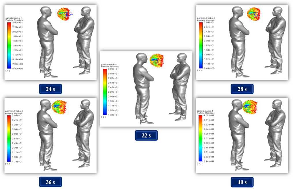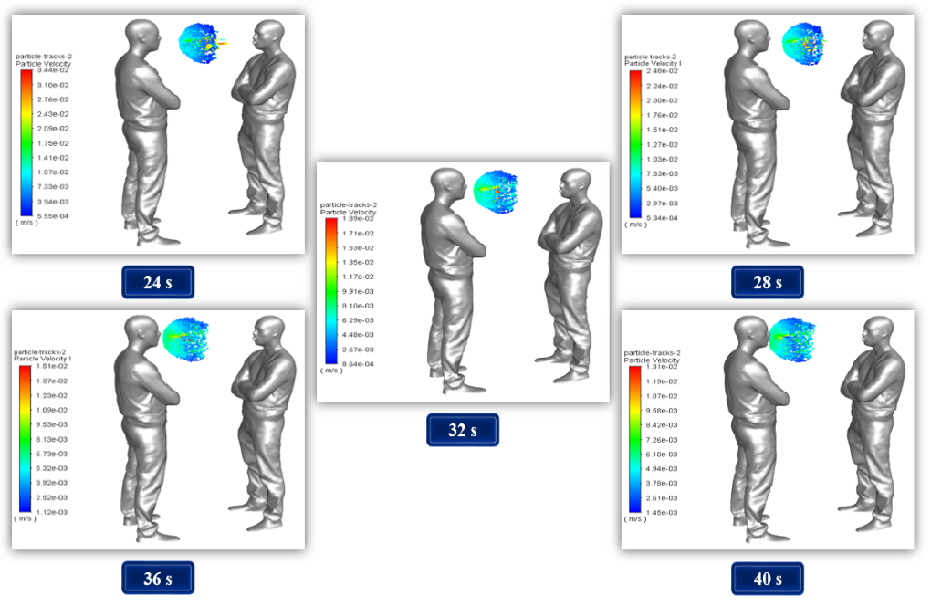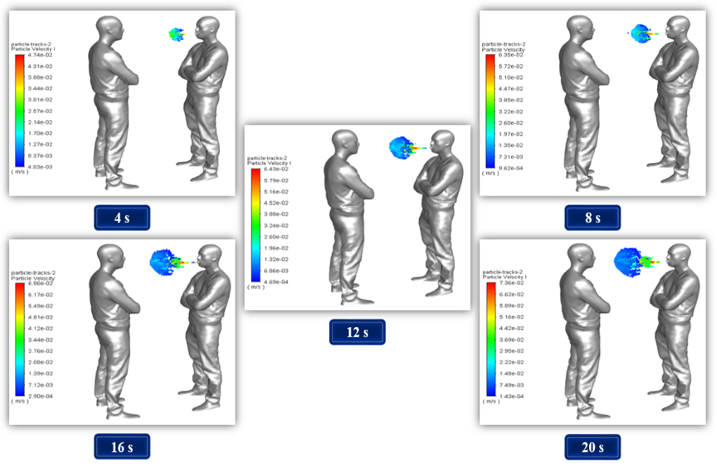 According to the simulation results, the virus particles were expelled from the patient’s mouth in the first 20 s. In the second 20 s, only the particles in the space between the patient and the healthy person continue their transitional movement.