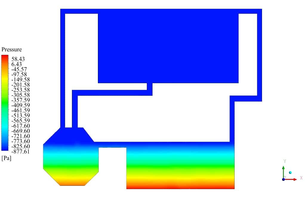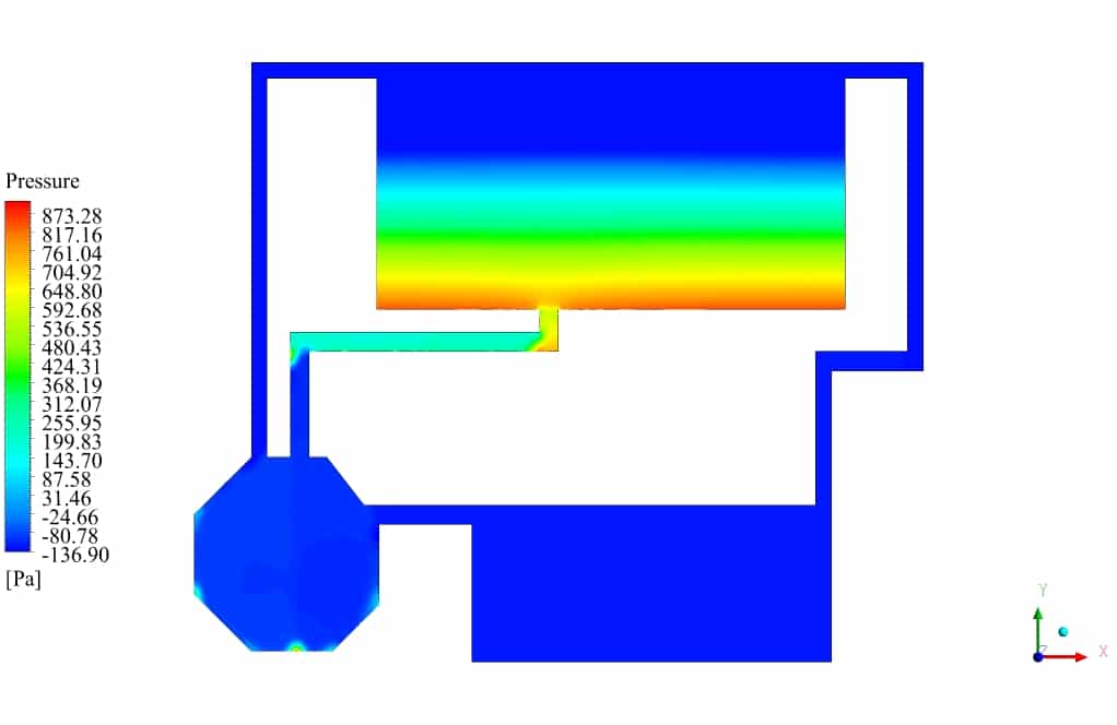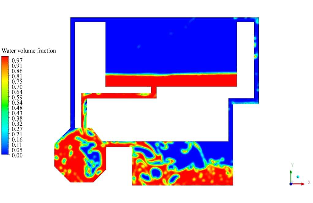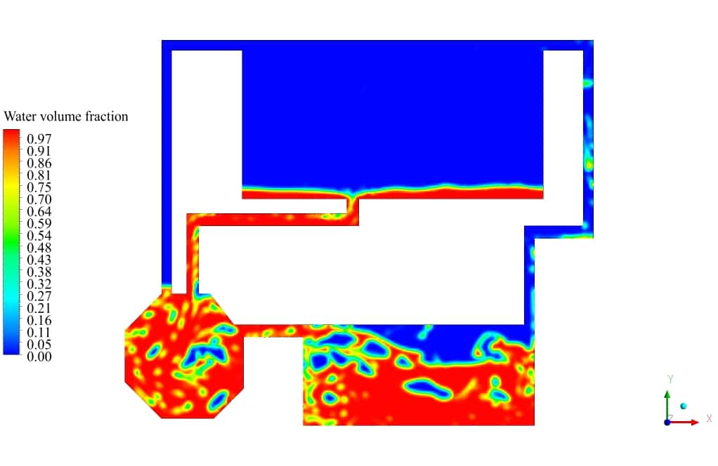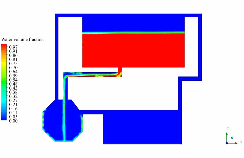 After the solution process is completed, contours of Volume fraction, Pressure, Velocity, and Streamlines are extracted and presented below. As can be observed, the water discharges from the primary tank to the secondary tank, which has insufficient volume for storing water. After a while, water starts to fill the third tank, connected to the second tank. Some pipes are for air circulation inside the tanks. This phenomenon can be seen in the velocity and streamline contours.
