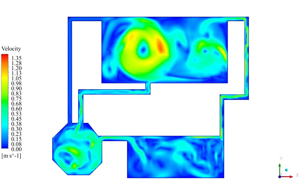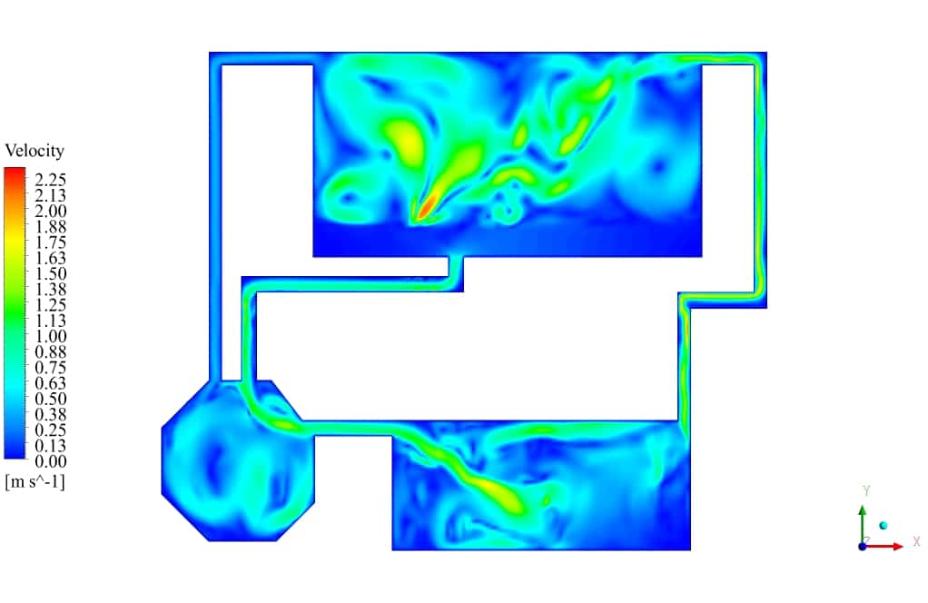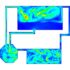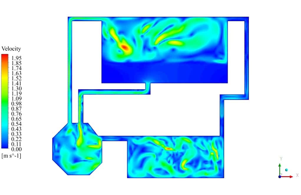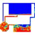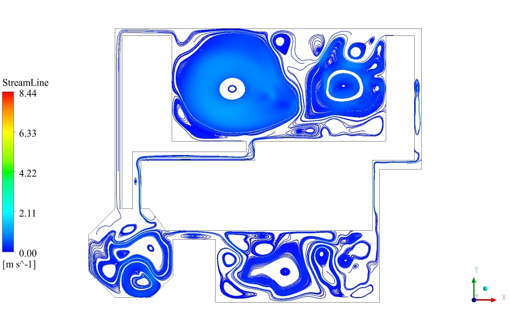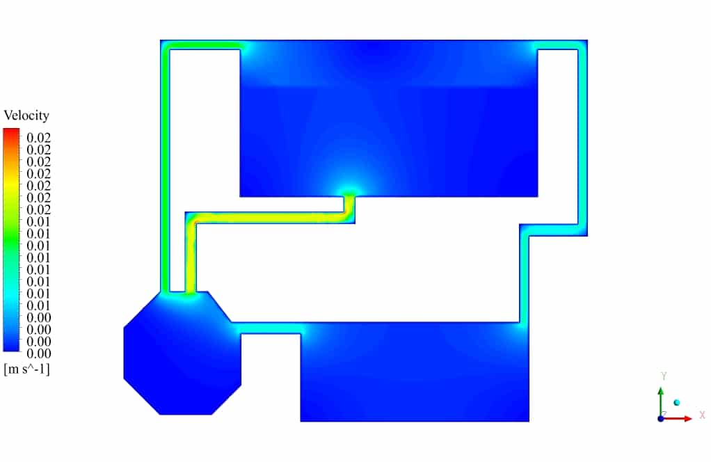 After the solution process is completed, contours of Volume fraction, Pressure, Velocity, and Streamlines are extracted and presented below. As can be observed, the water discharges from the primary tank to the secondary tank, which has insufficient volume for storing water. After a while, water starts to fill the third tank, connected to the second tank. Some pipes are for air circulation inside the tanks. This phenomenon can be seen in the velocity and streamline contours.