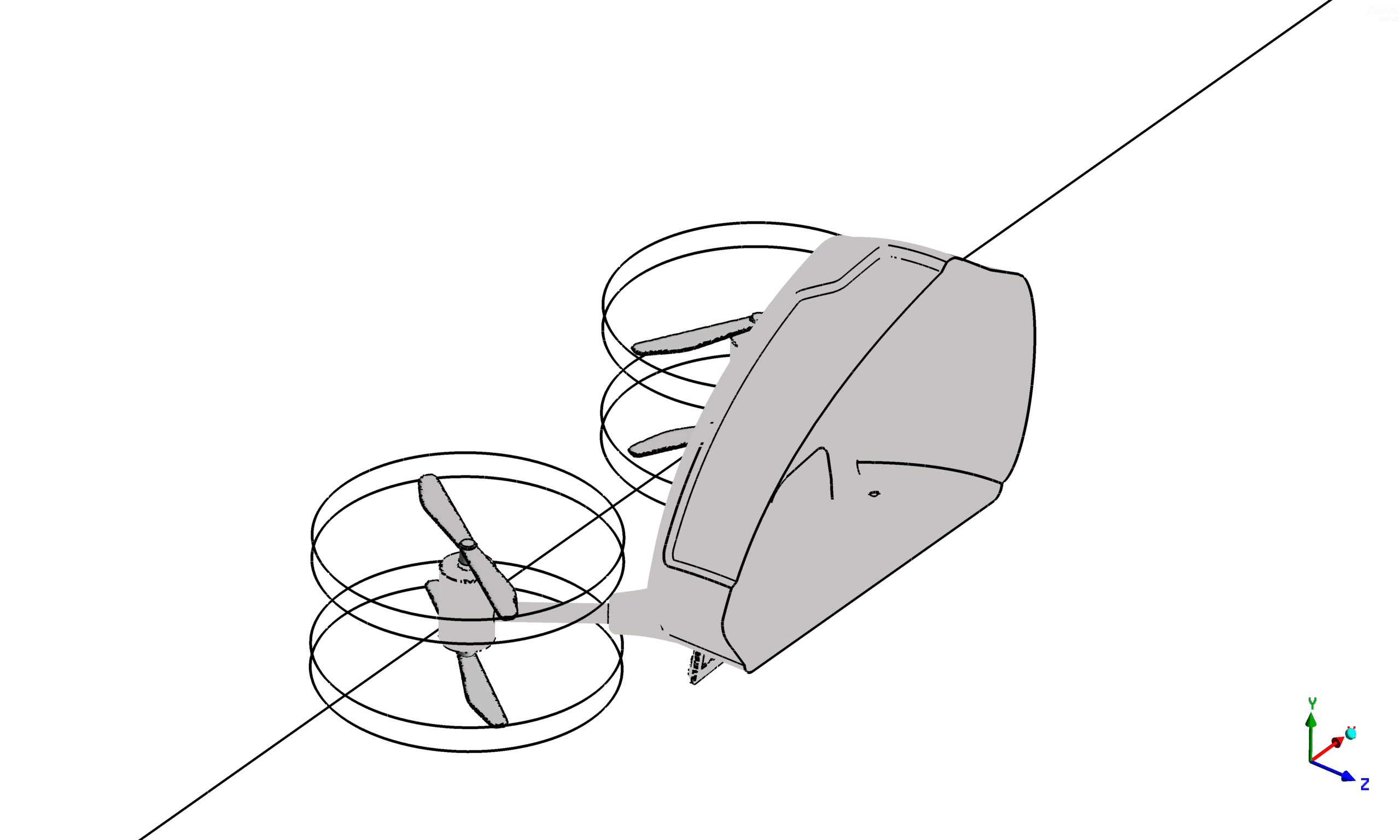 The geometry of the taxi drone was designed using ANSYS SpaceClaim as shown in Fig. 1. This geometry captures the essential features of the drone, which includes the upper and lower rotors. The mesh was generated using ANSYS Meshing, resulting in a total of 2,829,977 elements, as depicted in Fig. 2. The mesh is conformal, ensuring a high-quality discretization suitable for accurate simulation results.