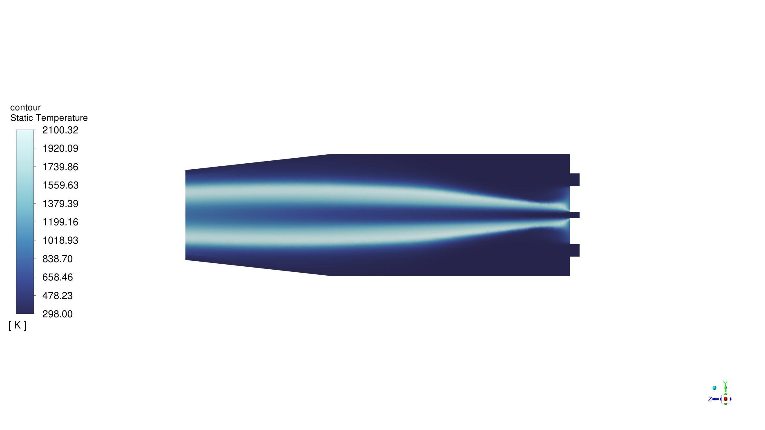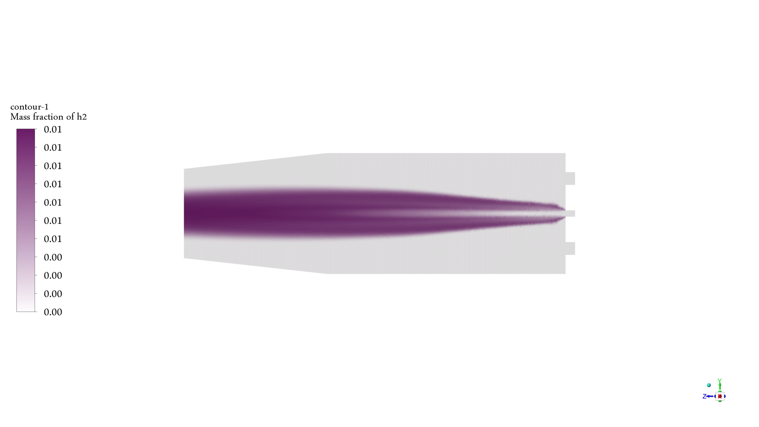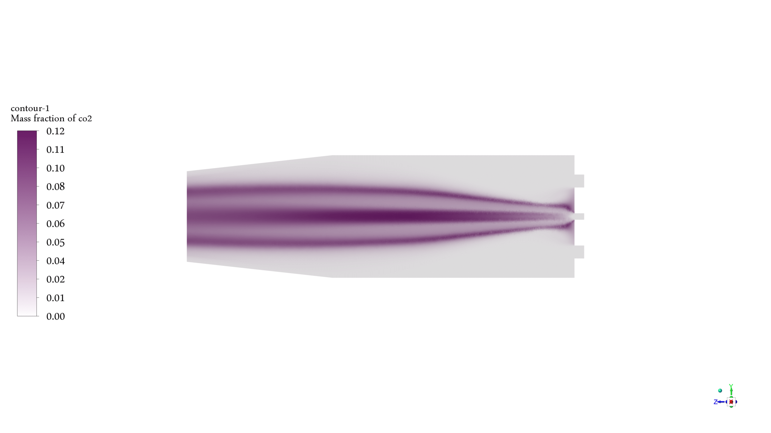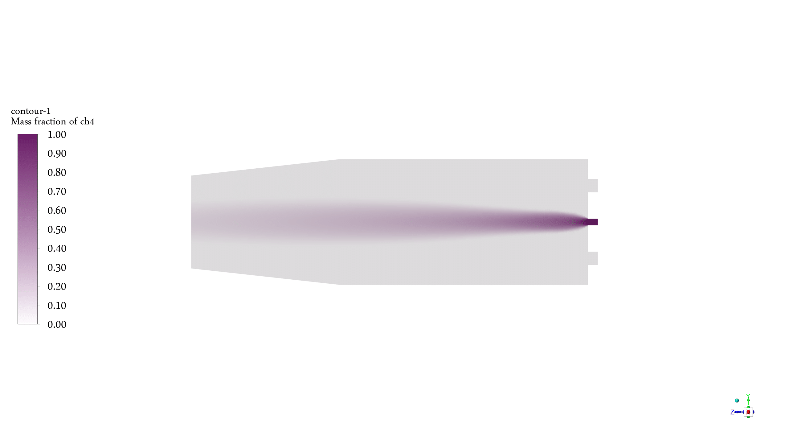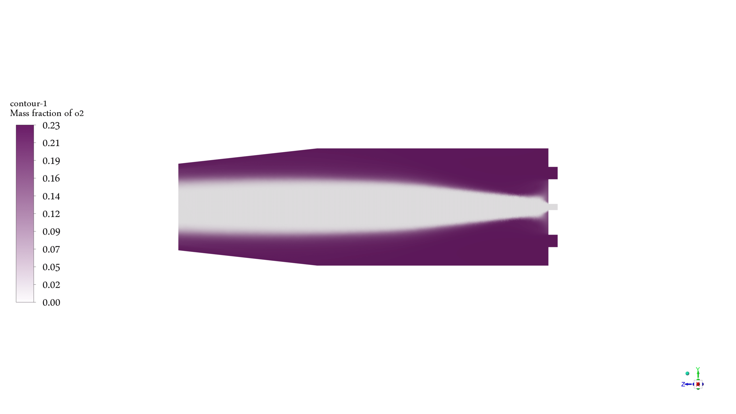 The figures extracted from ANSYS Fluent software show the different contours of various parameters. The mass fraction of the material indicates its entry into the domain from the center of the inlet plate. Additionally, air with a mass fraction of 0.23 oxygen and the rest of the nitrogen enters the zone surrounding the fuel inlet. Also, the mass fraction contours of and, which are the products of the reaction, are visible.