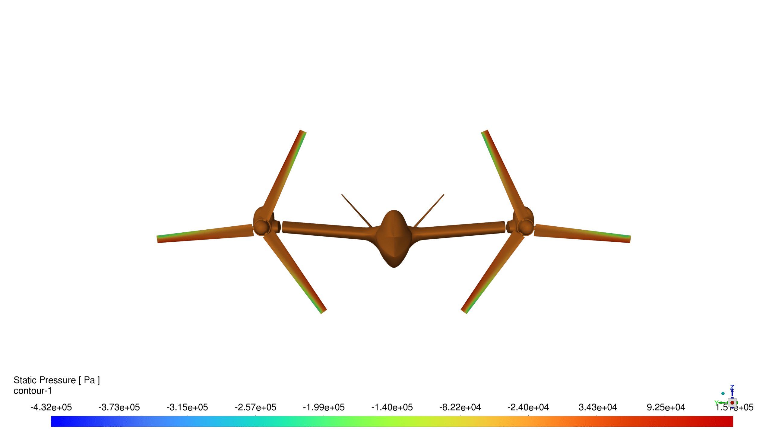 - Maximum negative pressure zones were concentrated at propeller tips