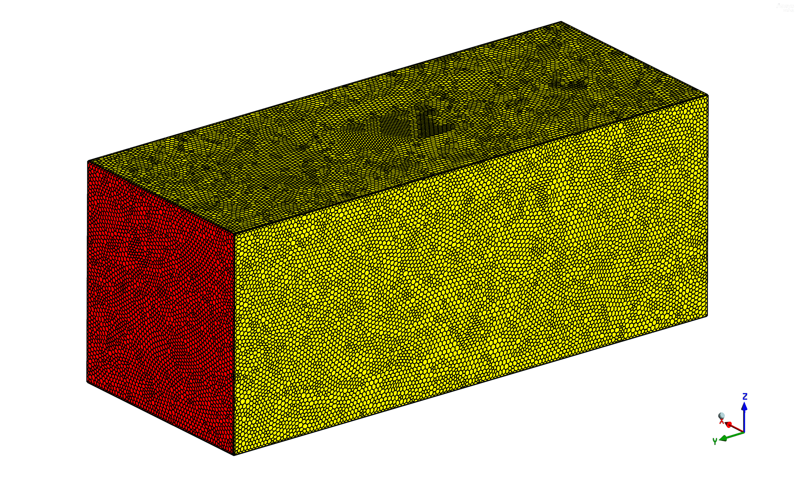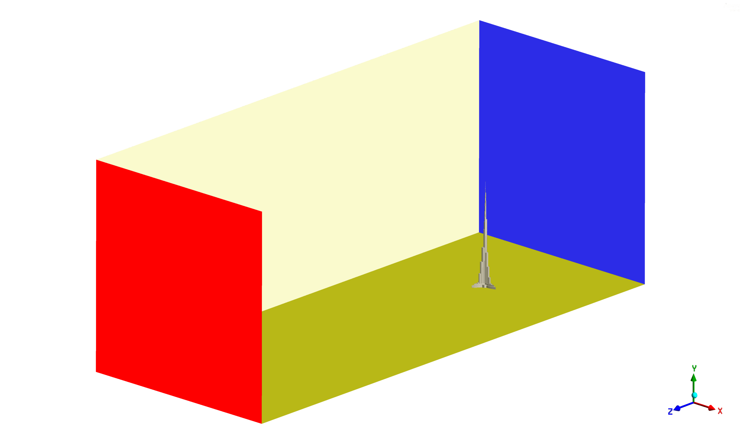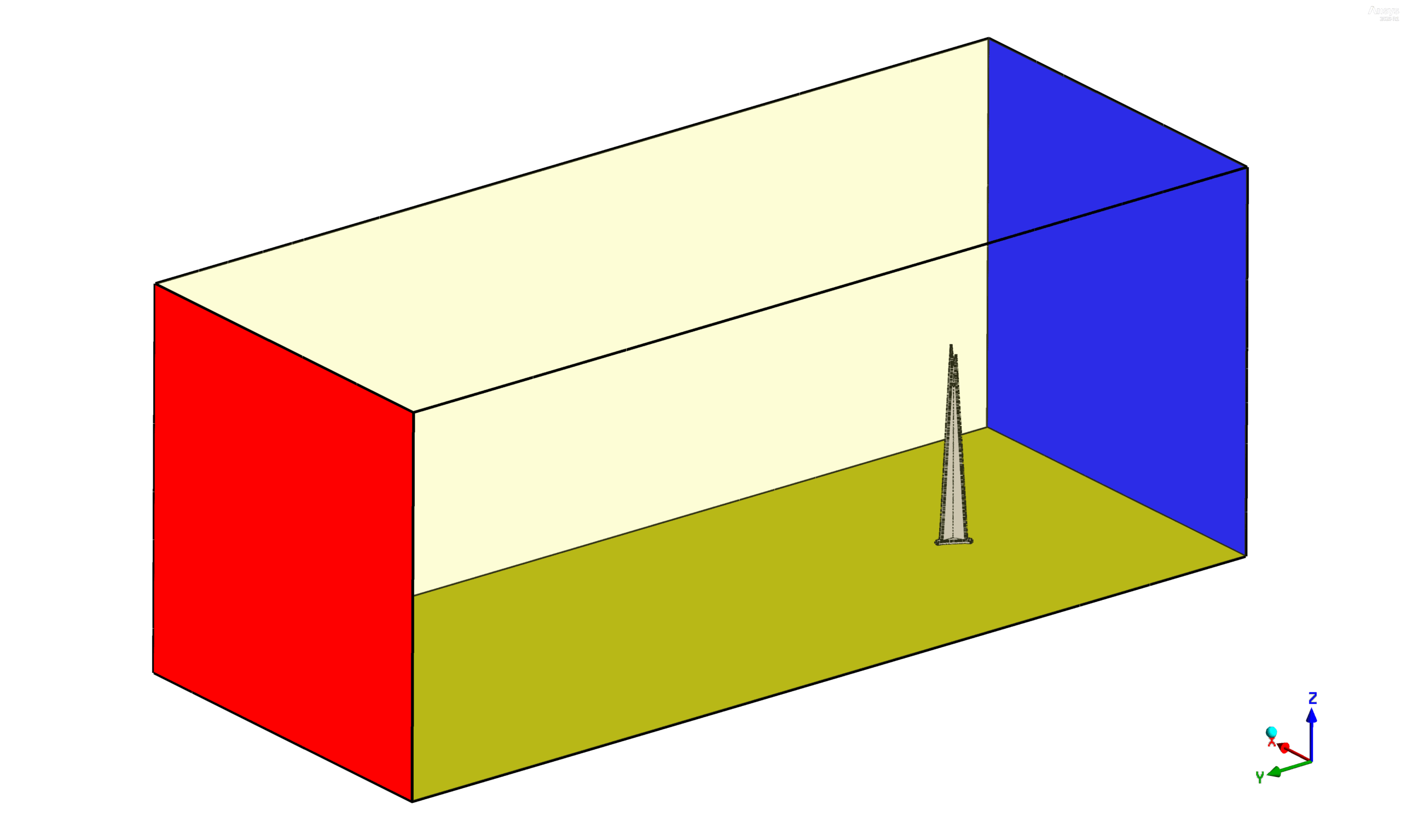 Two software programs used for tower aerodynamic project, ANSYS Design Modeler and SpaceClaim, were used to create the geometries of both problems. The domain is considered a rectangular cube with a length, width, and height of 2h*2h*5h (h is the tower’s height). Also, the tower’s distance from the entrance area is one h, as shown in Figure 1.