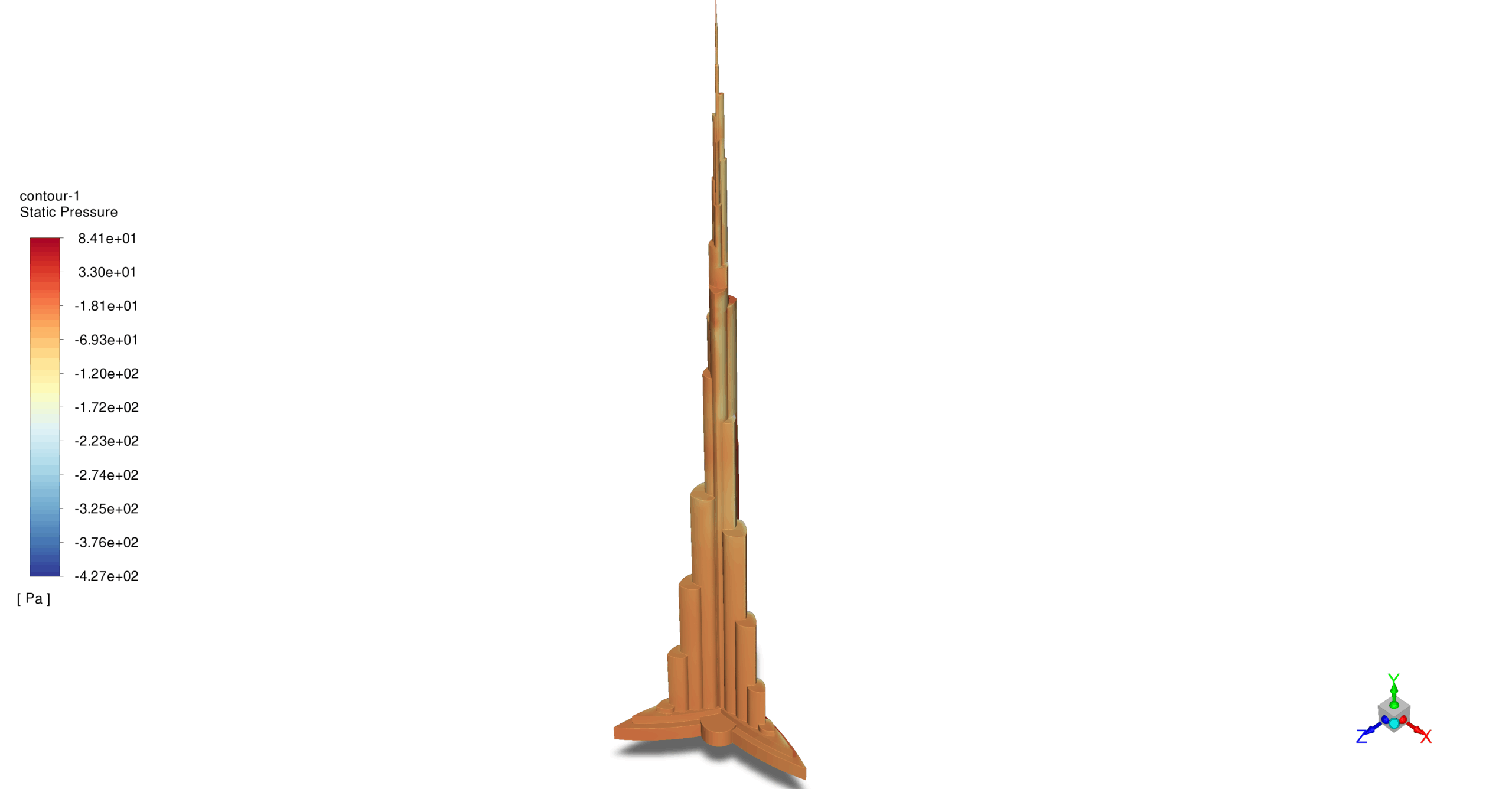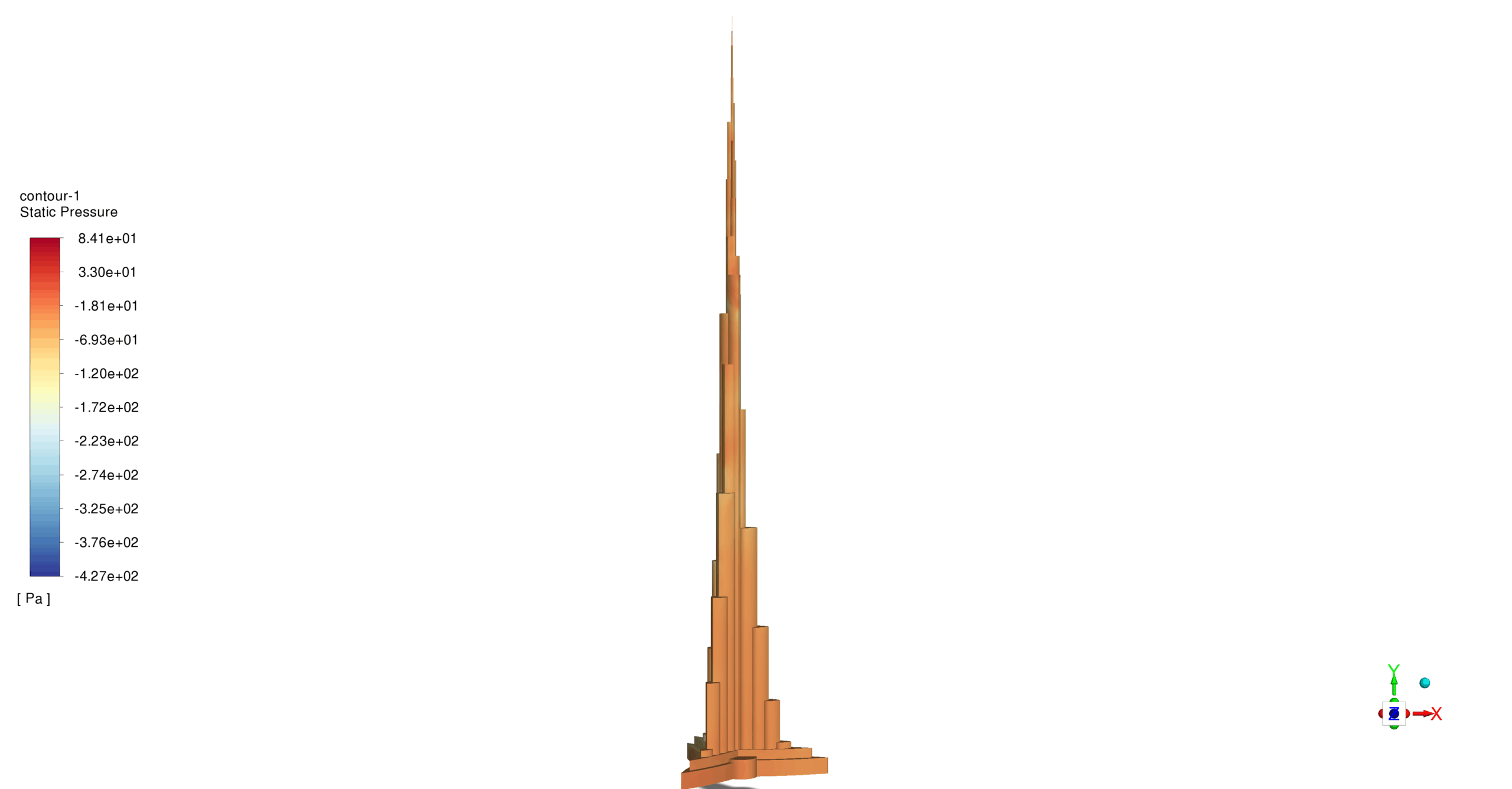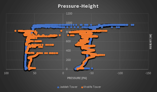 In the results of tower aerodynamic project, we saw that the compressive drag on the Burj Khalifa is about 2 meganewtons, and the compressive drag of the Jeddah Tower is 6 meganewtons. At the same time, the height of the Jeddah Tower is only 180 meters higher than the Khalifa. In the graph below, the pressure changes with height on the tower’s two front and back surfaces (relative to the direction of the wind), which are plotted for both towers. The blue graph for the Jeddah Tower shows pressure variations with a nearly constant gradient up to a height of 900 meters. This behavior is very similar at the front and back of the tower. For this reason, at any height, the pressure difference between the front and back of the tower is at its maximum. In contrast, the pressure distribution in the Burj Khalifa is entirely variable. This is related to the curvature of the sides and the change in cross-sectional areas at each floor, which has reduced this pressure difference.
