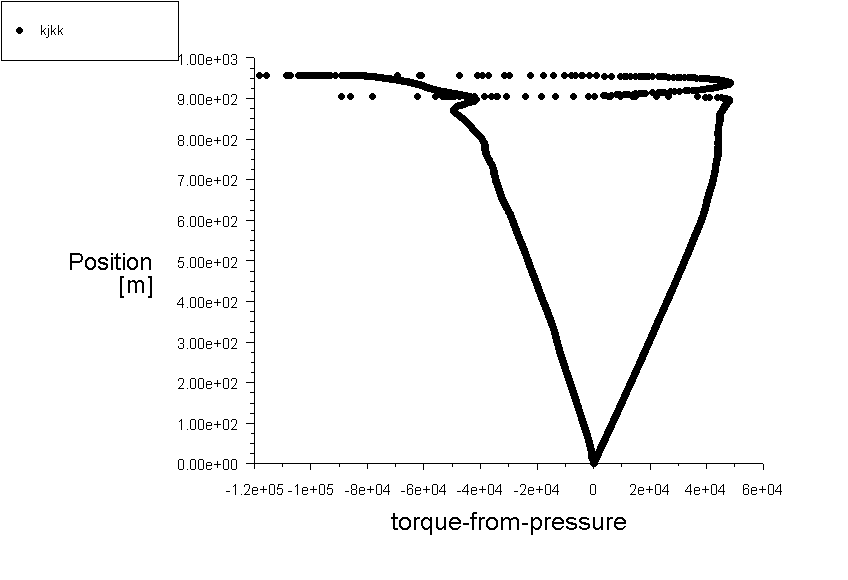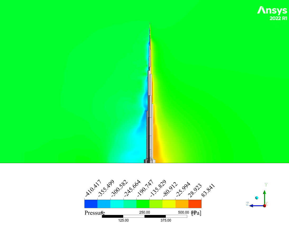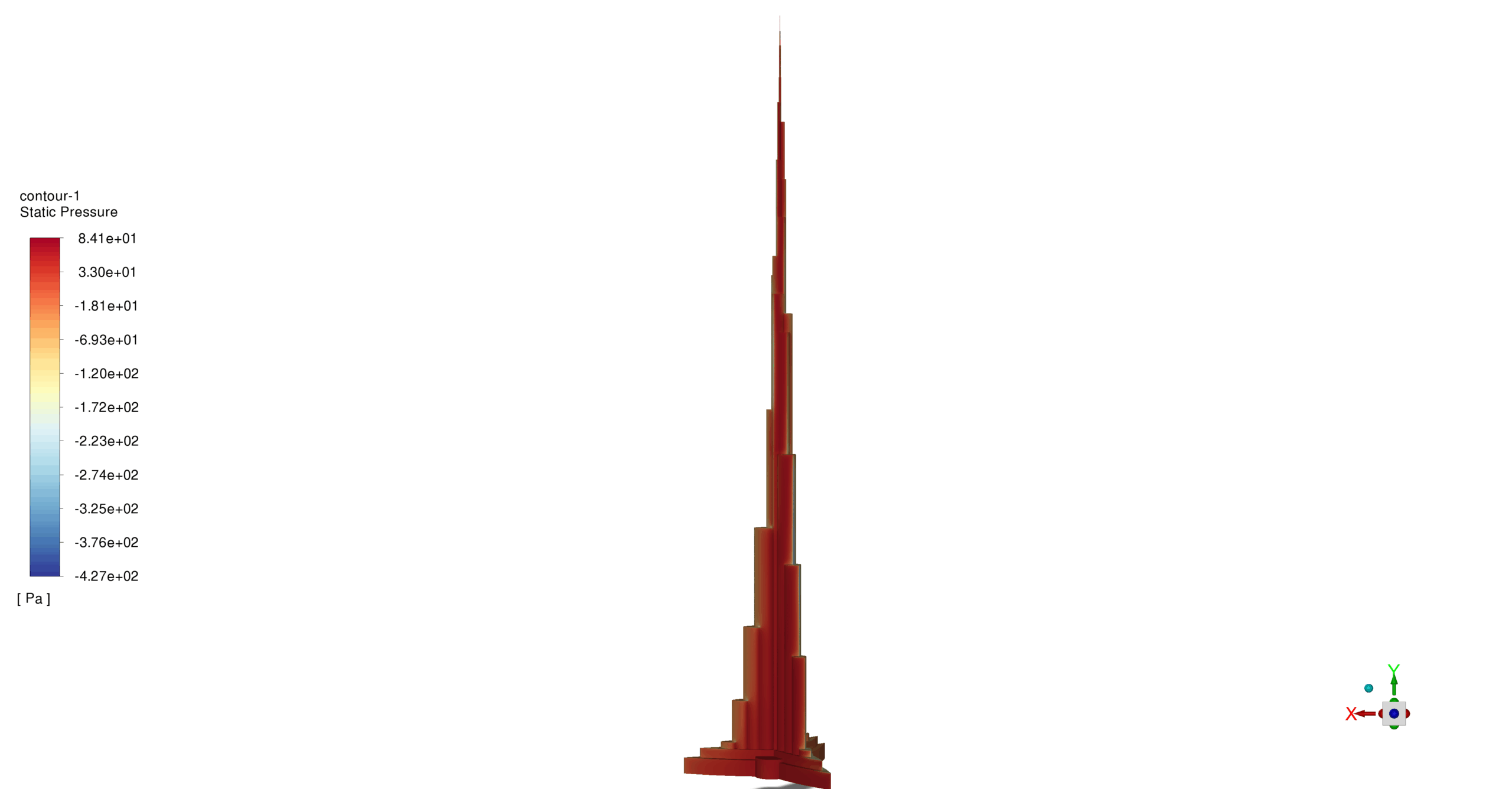 As can be seen in Figure 7, the drag force values are reported separately in Fluent software. Given the large dimensions of the tower, we expect the pressure drag to dominate in this case as well. The viscous drag force is 2502 Newtons, and the pressure drag is 2012954 N in this case. In other words, the pressure drag contribution is 0.12% of the total applied force and can be ignored in the calculations. On the other hand, given the 828-meter height of the tower, the torque generated can be very impressive, which, according to the software report, is 4e+8 N · m! We know that the torque is the product of the force multiplied by the perpendicular distance from the fulcrum. So, with increasing distance from the ground, the moment applied to the building increases greatly. For this reason, the tower is designed so that its cross-sectional area decreases with increasing height, and the curvature of the walls is directed towards the same. To better understand the pressure drag force at each point, the pressure-distance diagram is plotted on the centerline on the surface exposed to the wind flow and the corresponding back surface (Figure 7).