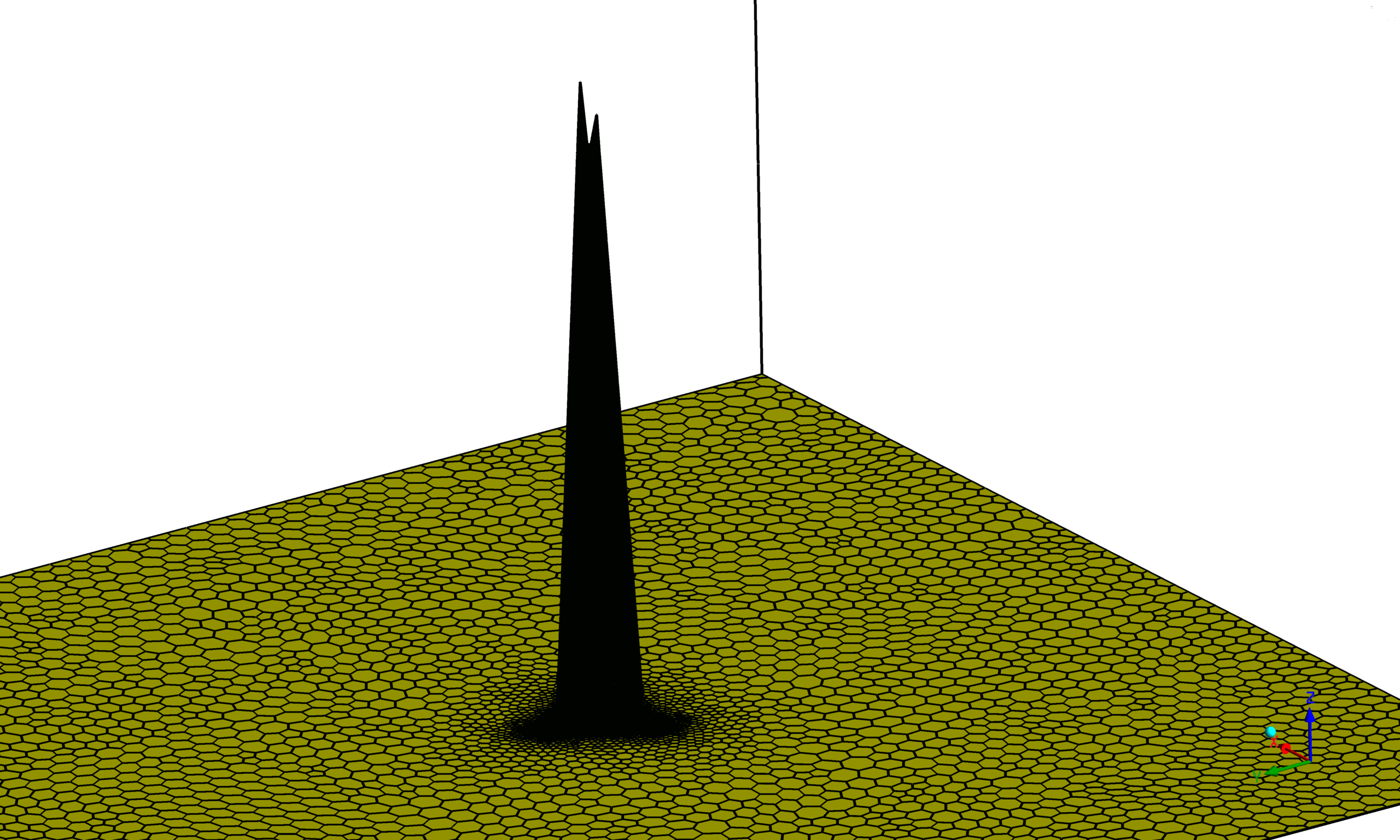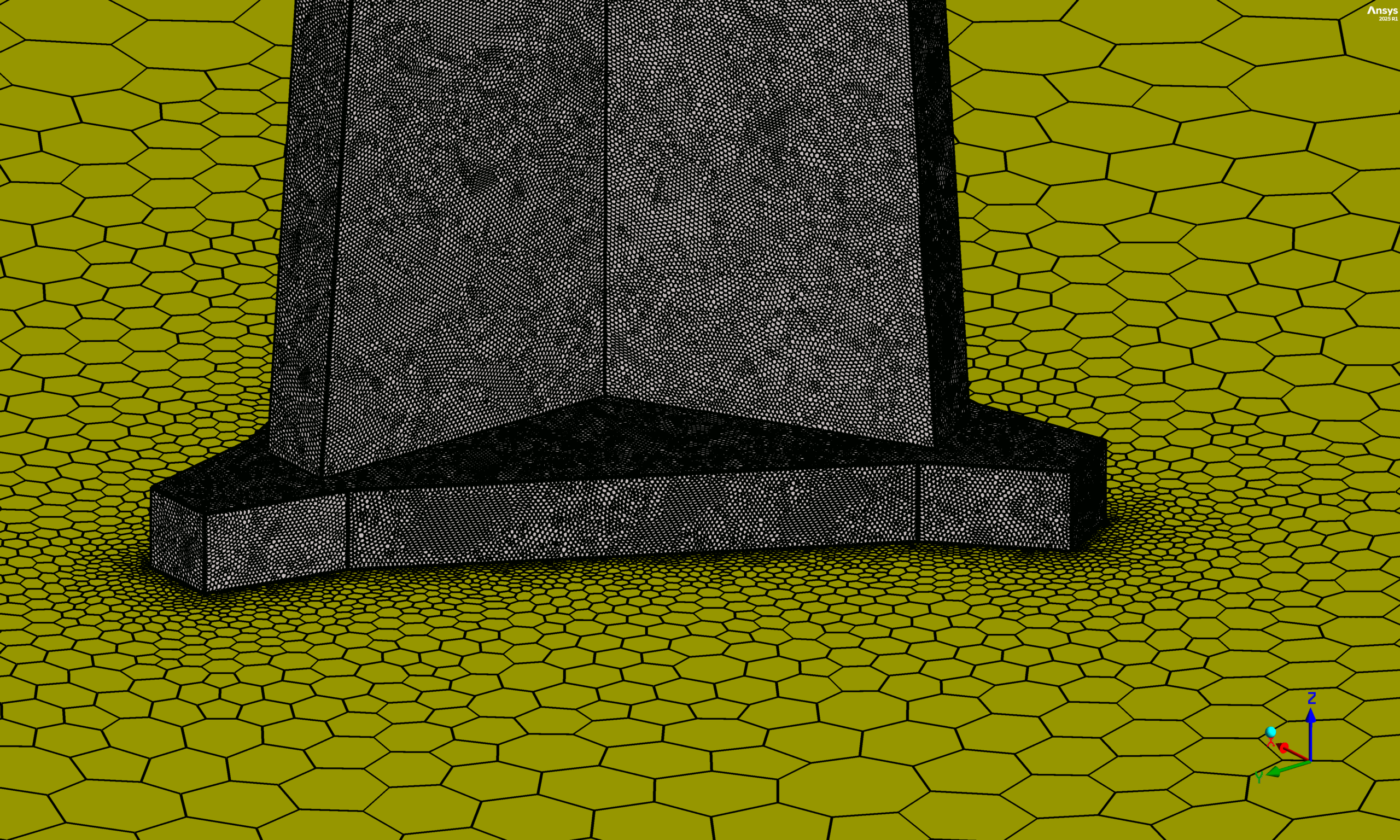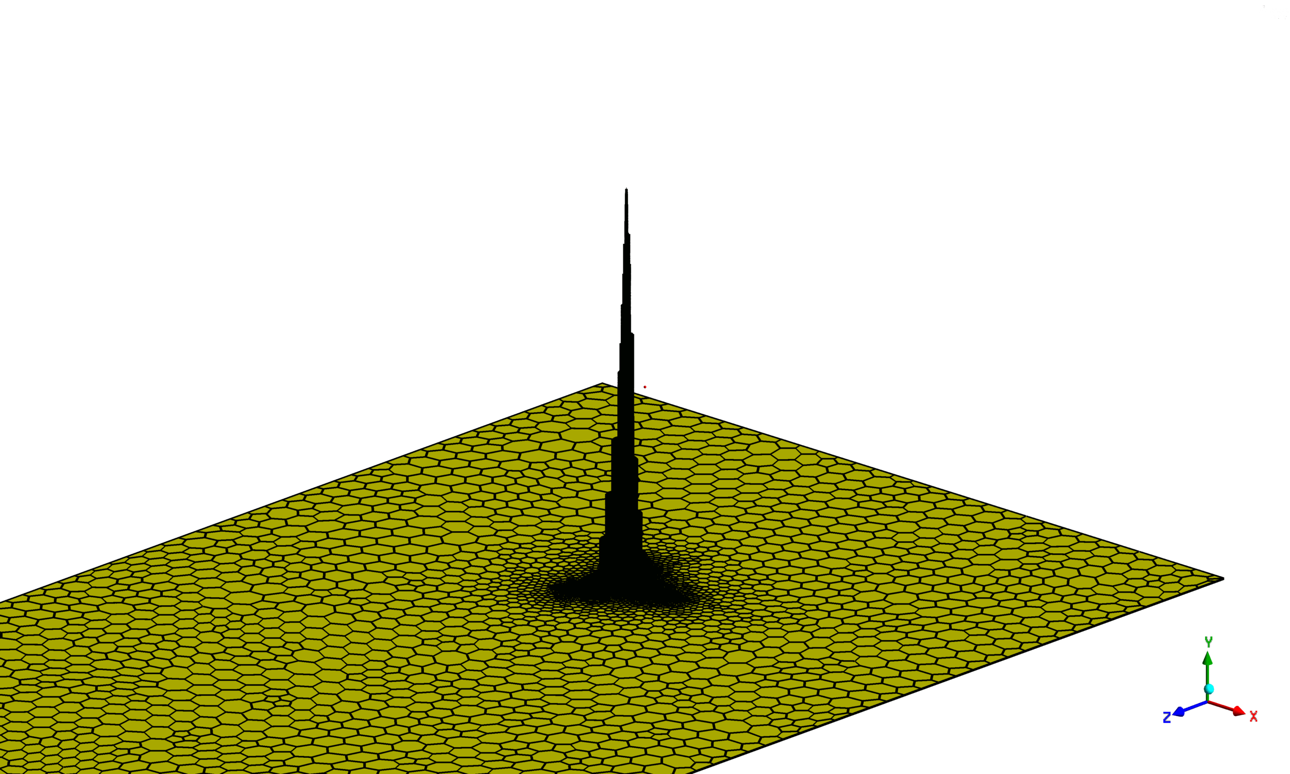 Ansys Meshing software was used to mesh the tower aerodynamic problem. The tower aerodynamic mesh was generated in an unstructured manner with triangular elements at first, and considering the sensitivity and complexity of the fluid behavior near the tower walls, we used a boundary layer mesh with a first layer thickness of 2 cm (Figure 2). The number of initial elements for the Khalifa tower problem is 14,668,281, and for the other problem, 31,299,717. However, after using the capabilities of Ansys software and converting the elements to Polyhedral, without reducing the mesh quality, we achieve a smaller number of elements, significantly reducing the computational load. It is worth noting that the mesh quality control parameters report very high quality.