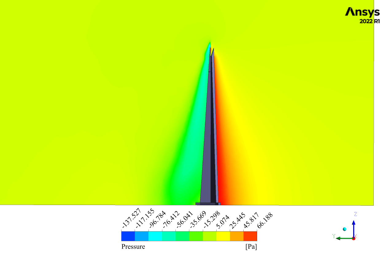 As can be seen in Figure 3, the drag force values are reported separately in the Fluent software. Given the large dimensions of the tower, we expect the compression drag to dominate in this problem. The viscous drag force is 1545 Newtons, and the compression drag is 6002140 in this case. In other words, the contribution of compression drag is 0.025% of the total applied force and can be ignored in the calculations. On the other hand, due to the very high height of the tower, the torque generated can be very impressive, which, according to the software report, is 2e+9 N · m. We know that the torque is the product of the force multiplied by the perpendicular distance from the fulcrum. So, with increasing distance from the ground, the moment applied to the building increases greatly. For this reason, the tower is designed to decrease its cross-sectional area with increasing height, and sharp points are used. To better understand the pressure drag force at each point, the pressure-distance diagram is plotted on the centerline on the surface exposed to the wind flow and the corresponding back surface (Figure 4).