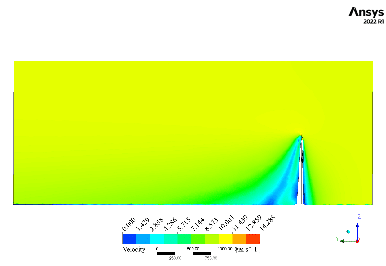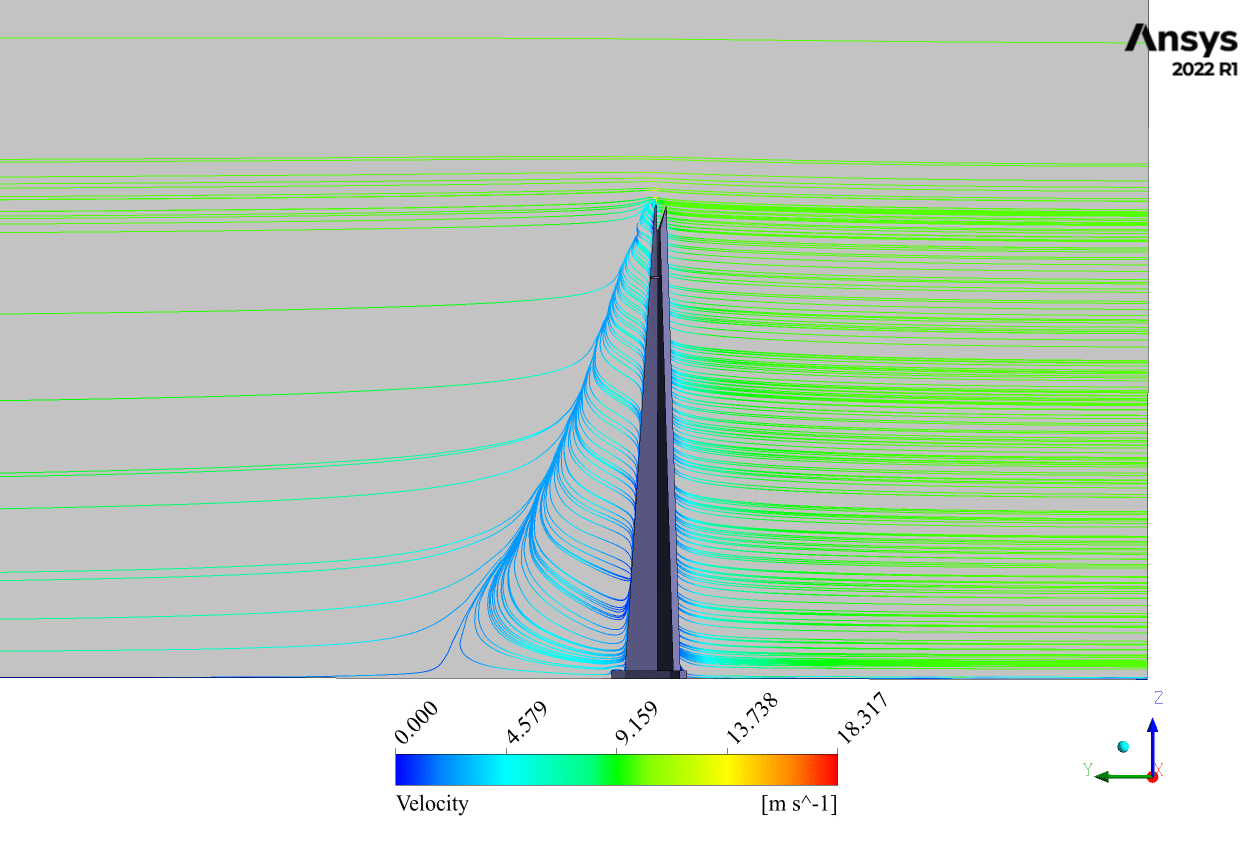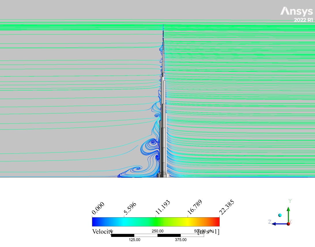 As can be seen in the diagram, the positive values are related to the front of the tower, where the pressure increases as the flow hits the tower wall and its velocity becomes zero (stagnation point). The negative values are related to the back of the tower. This extreme pressure difference in front and back of the tower is the cause of pressure drag. In the contours below, this pressure gradient and also the vortices formed behind the tower can be clearly seen using the contours of the streamlines and velocity lines. (Figures 8 – 9).