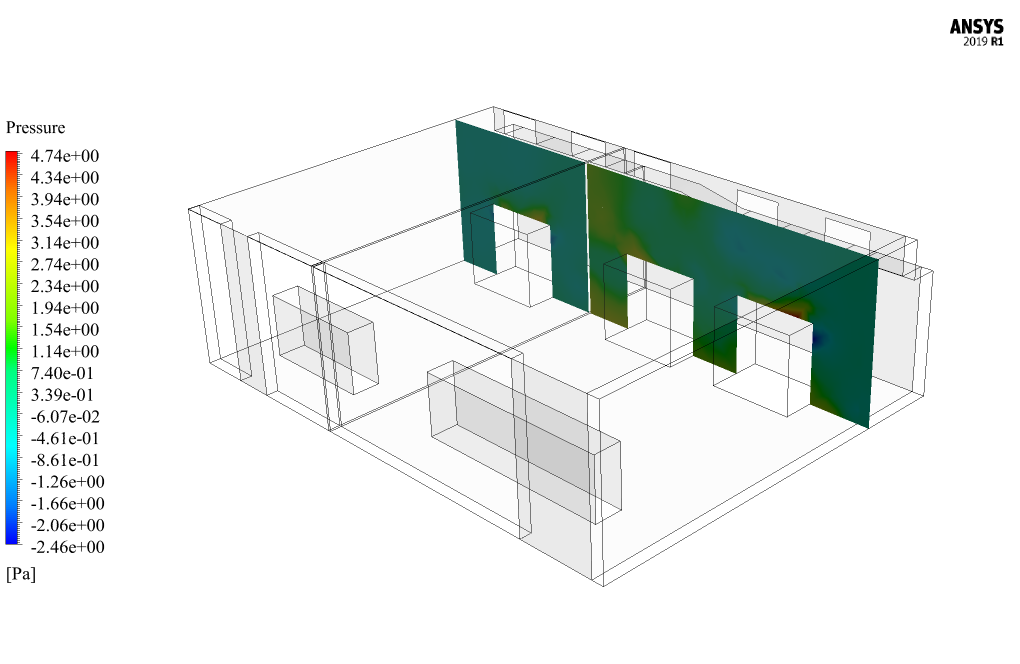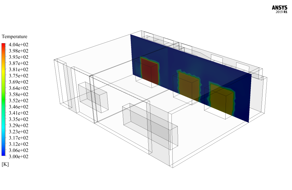 At the end of the solution process, two-dimensional contours related to pressure, temperature, and velocity were obtained. As seen in the temperature contour, the overall temperature will decrease due to the forced convection and airflow motion within the transformer room.