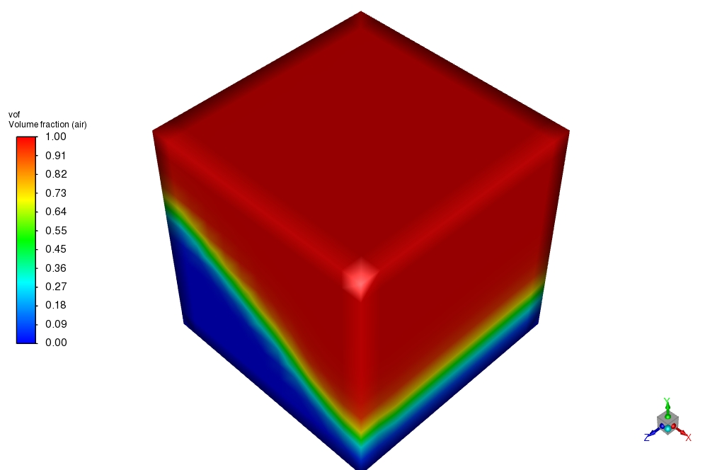 The interaction of water and air inside the cube is modeled using the Volume of Fluid (VOF) multiphase approach. VOF multiphase approach is considered since it is an efficient and precise approach for capturing the interface location between phases.