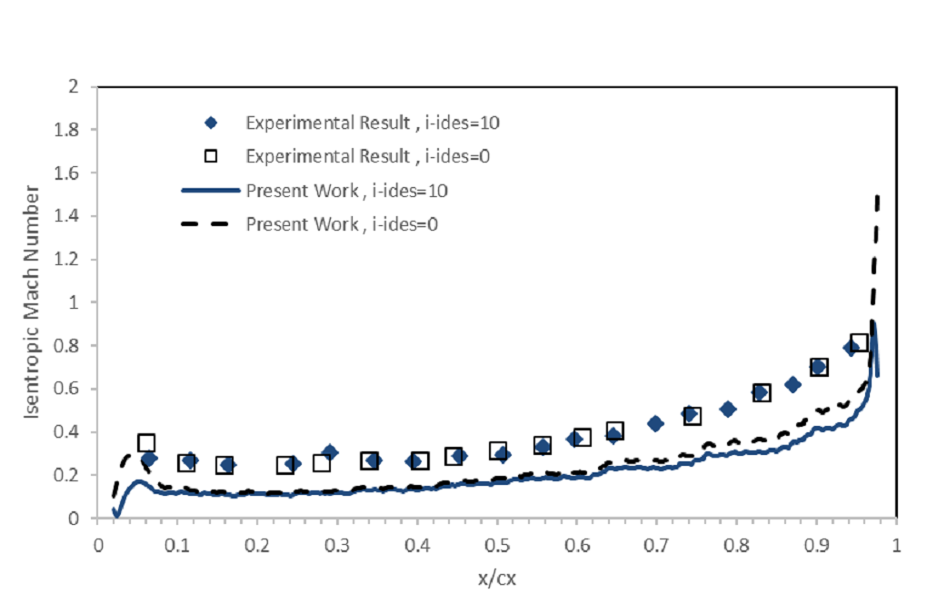 I am thoroughly impressed by the detailed comparison between the current work simulations and the experimental results in the paper. Understanding how the experimental and numerical exit Mach numbers align across different pressure ratios and incidences, reflects the quality of the CFD analysis. The use of the structured mesh around the blades to improve accuracy is something I found particularly insightful. Great job!