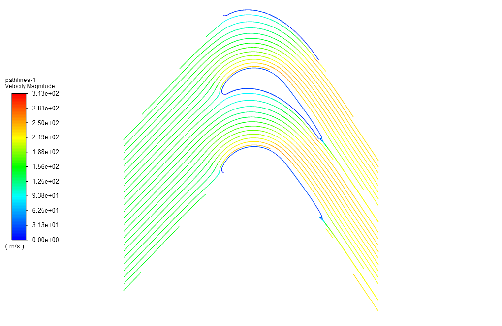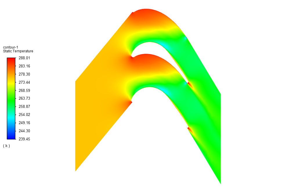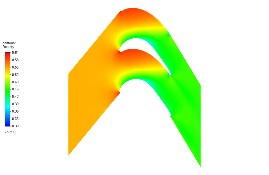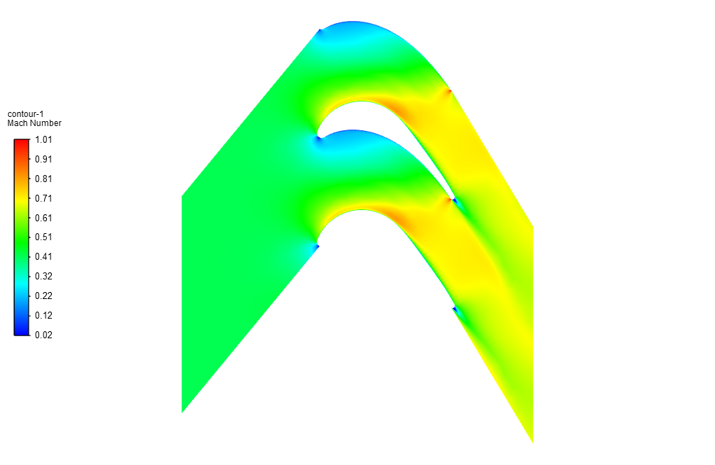 The present problem simulates the two-dimensional compressible flow field through a transonic linear turbine cascade. The present project’s results are compared with the experimental results of the paper “Midspan Flow-Field Measurements for Two Transonic Linear Turbine Cascades at Off-Design Conditions.” Turbulence modeling and Computational procedures (boundary conditions, etc.) are simulated based on the article “Numerical study of the flow field through a transonic linear turbine cascade at design and off-design conditions.” In this project, inlet and outlet boundaries were considered as pressure inlet and pressure outlet, respectively, and Periodic boundary conditions were applied to simulate flow through the cascade.
