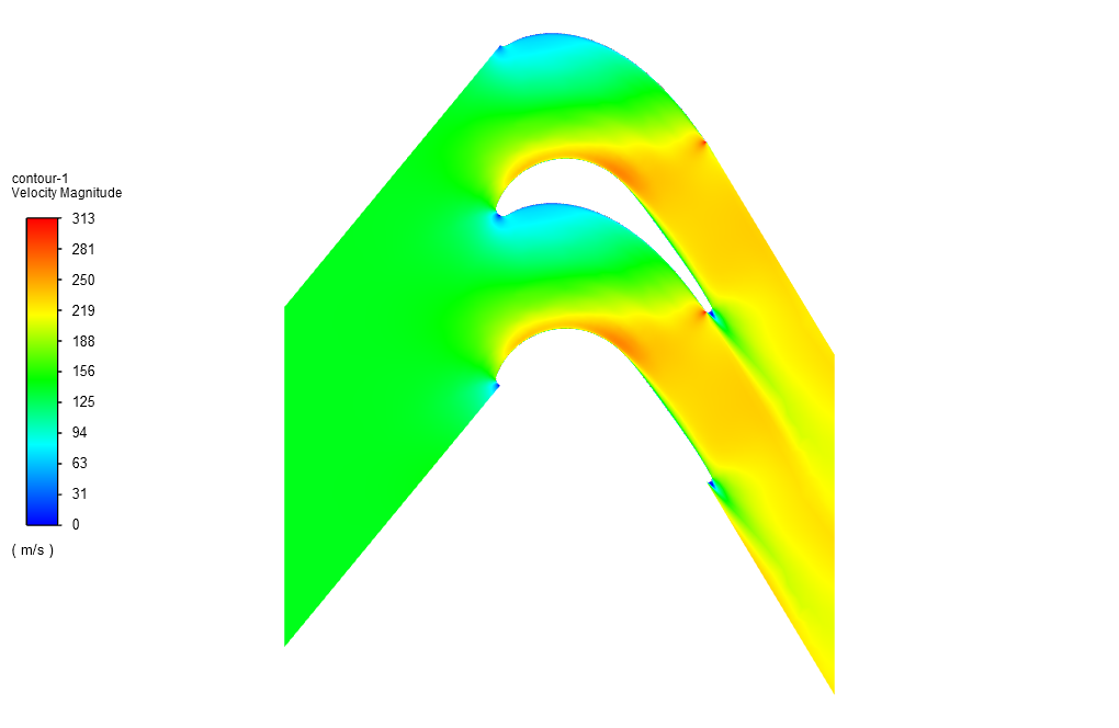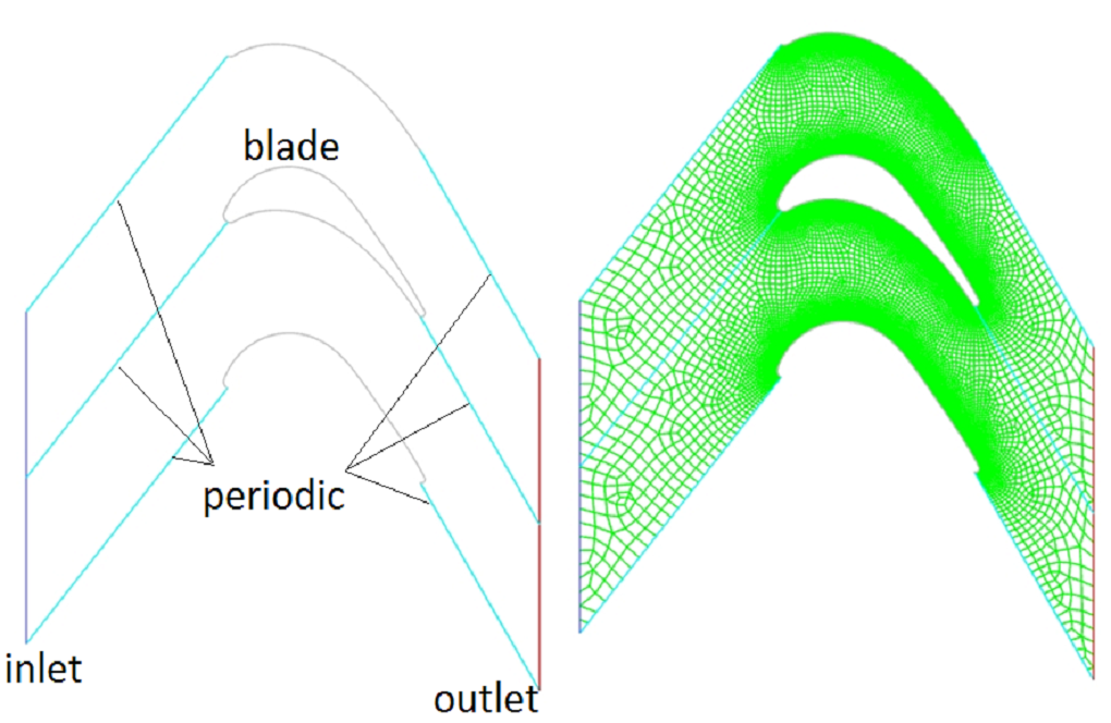 In this simulation, we chose a structured mesh around the turbine blades due to its ability to provide more accurate results in capturing the boundary layer phenomena and flow gradients, especially in the high-gradient regions around the blades that are critical for the analysis of transonic flows.