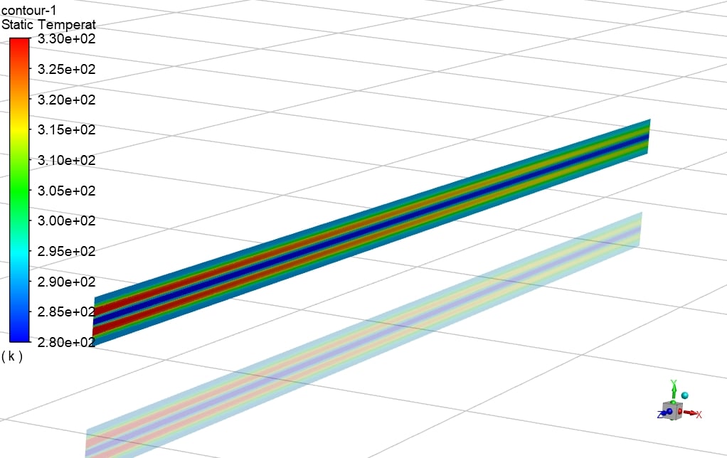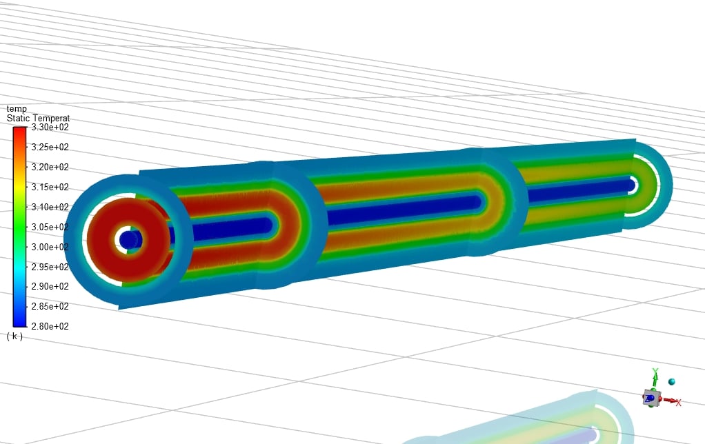 For analyzing temperature gradients within the three pipes in the triple heat exchanger simulation, several post-processing steps including the creation of 2D and 3D temperature contours were conducted. These steps allowed for a detailed understanding of how heat transfer occurred between the concentric tubes – evaluating the changes in temperature along the length of the triple heat exchanger and across its cross-section to ensure the effectiveness of heat transfer processes.