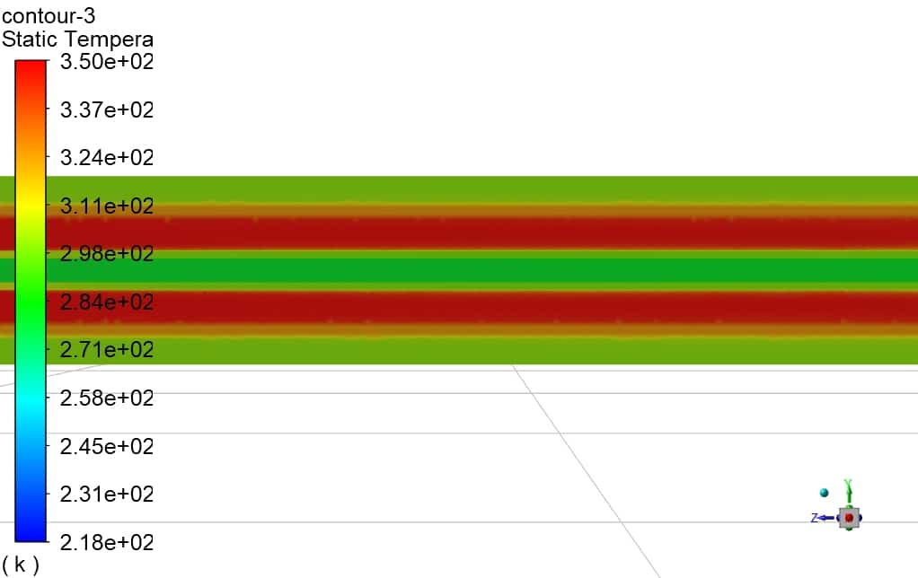 The outcome of such a detailed simulation is truly remarkable. The meticulously rendered temperature contours eloquently illustrate the efficiency of the triple heat exchanger design, providing clear insight into thermal management capabilities in complex systems.