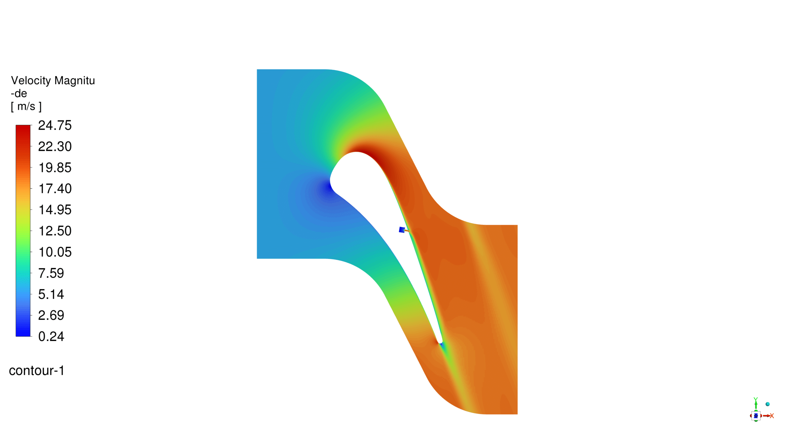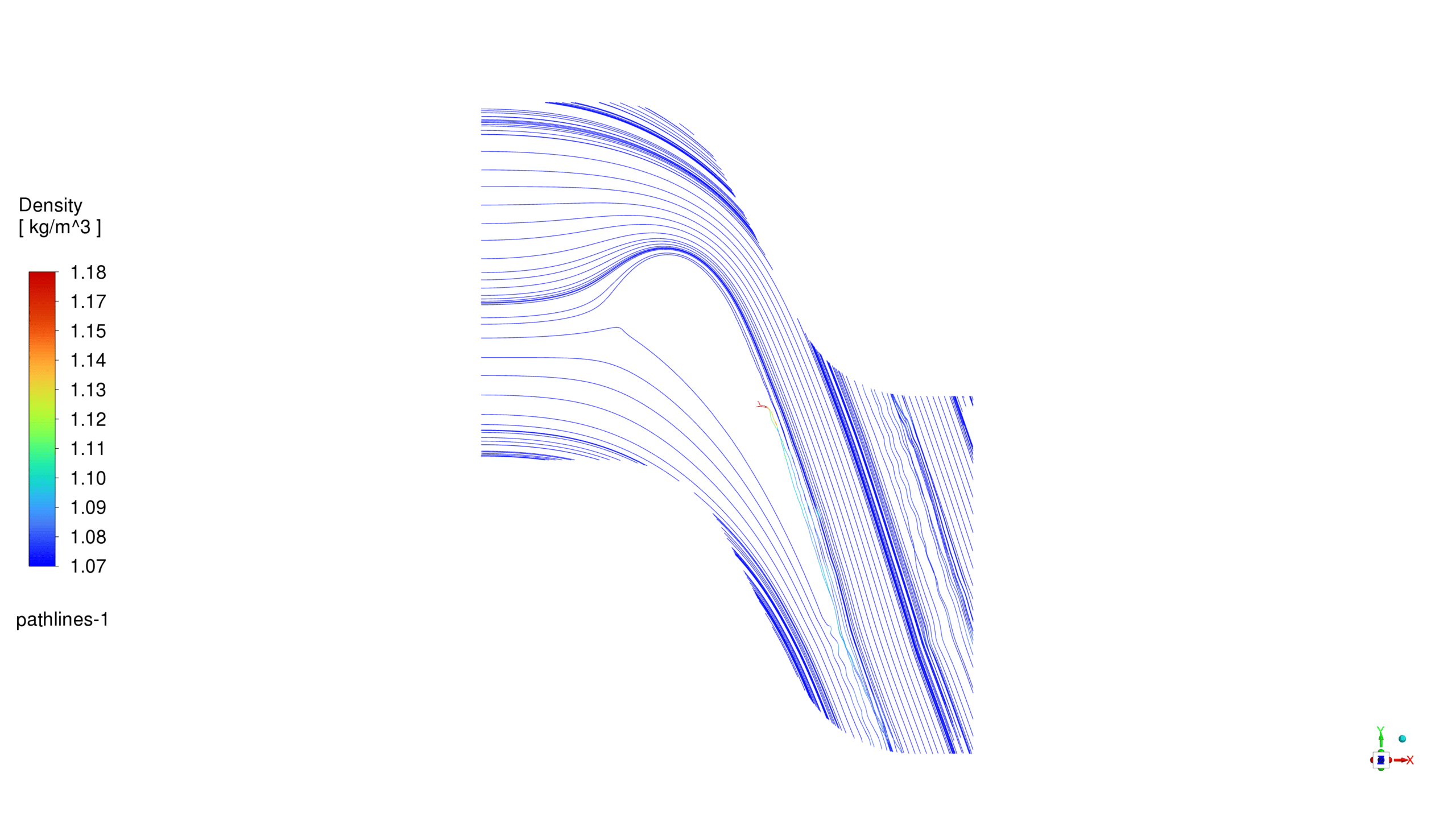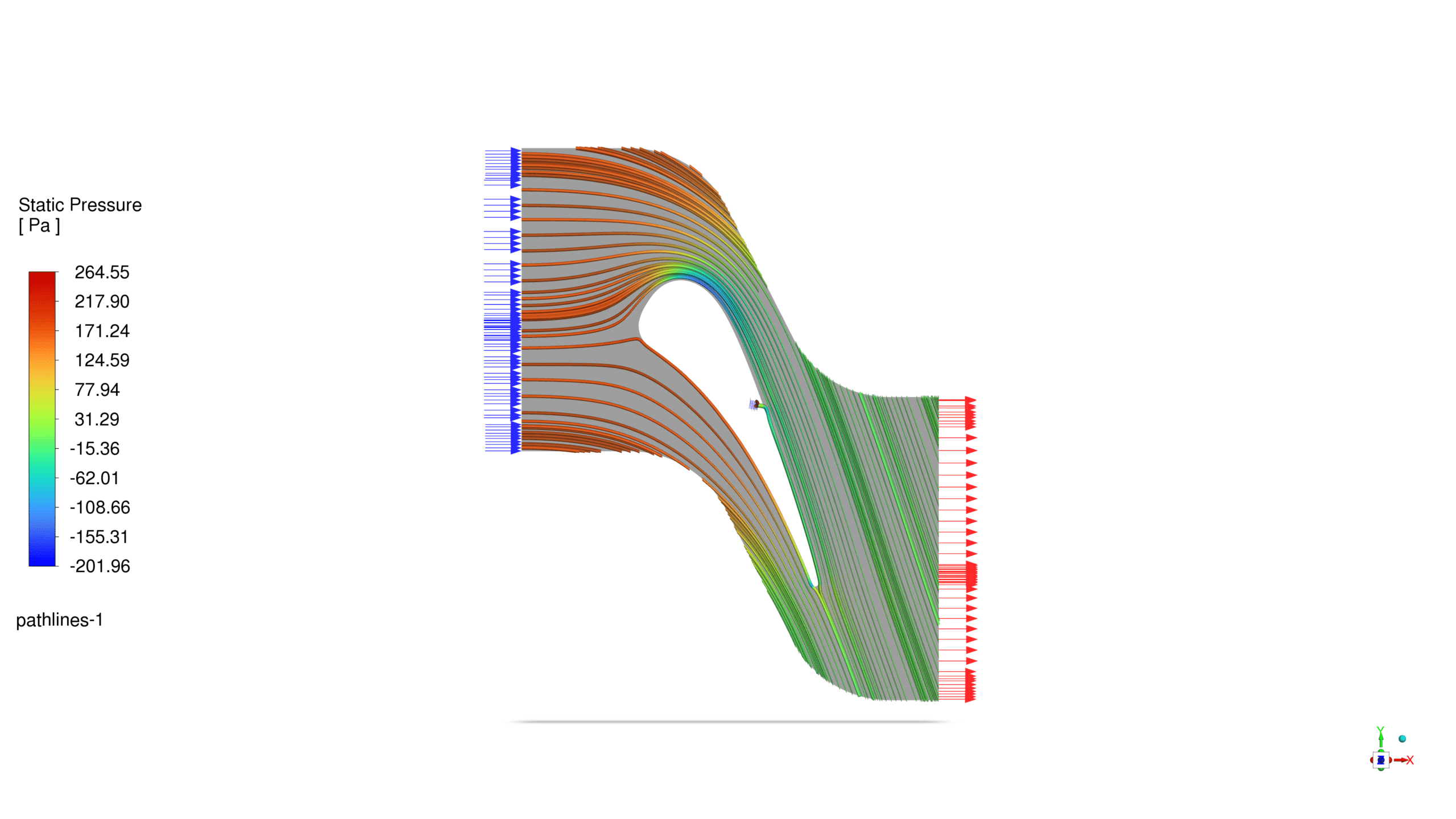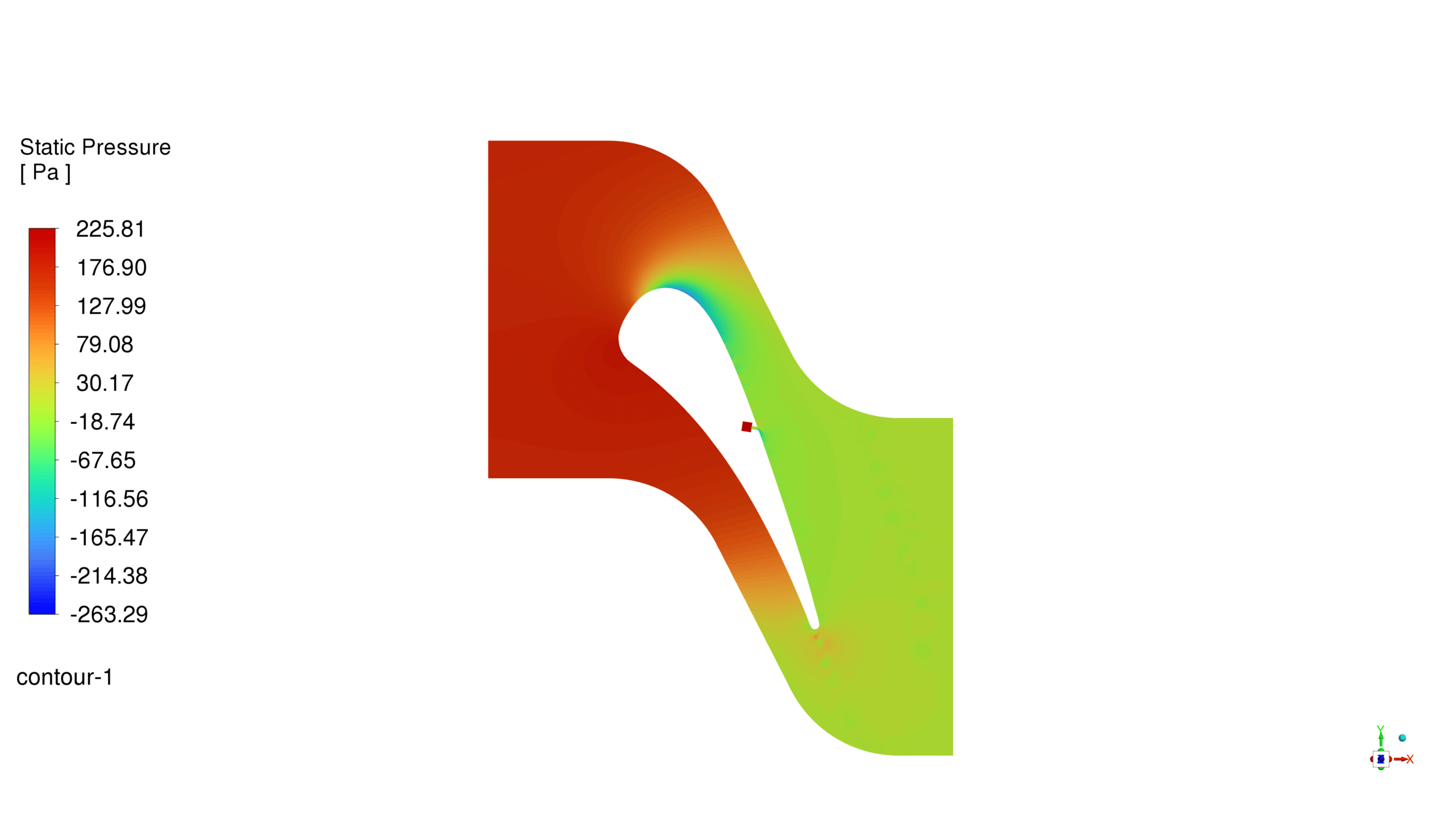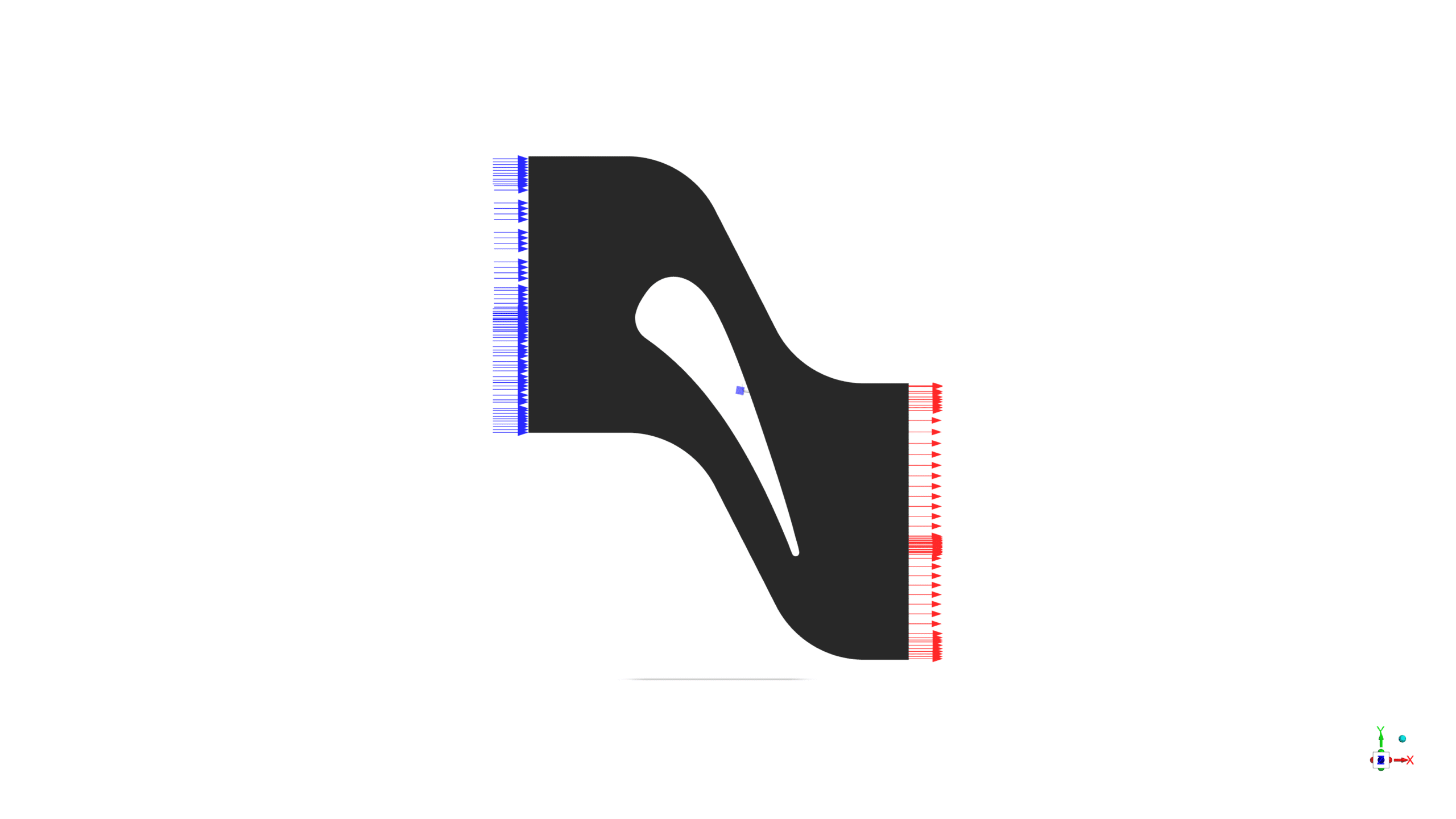 The simulation of Turbine Vane setup included a pressure-based solver in steady-state conditions. The energy equation was enabled to account for compressibility effects. Air was modeled as an incompressible ideal gas, entering from the left boundary and exiting through the right vertical boundary.