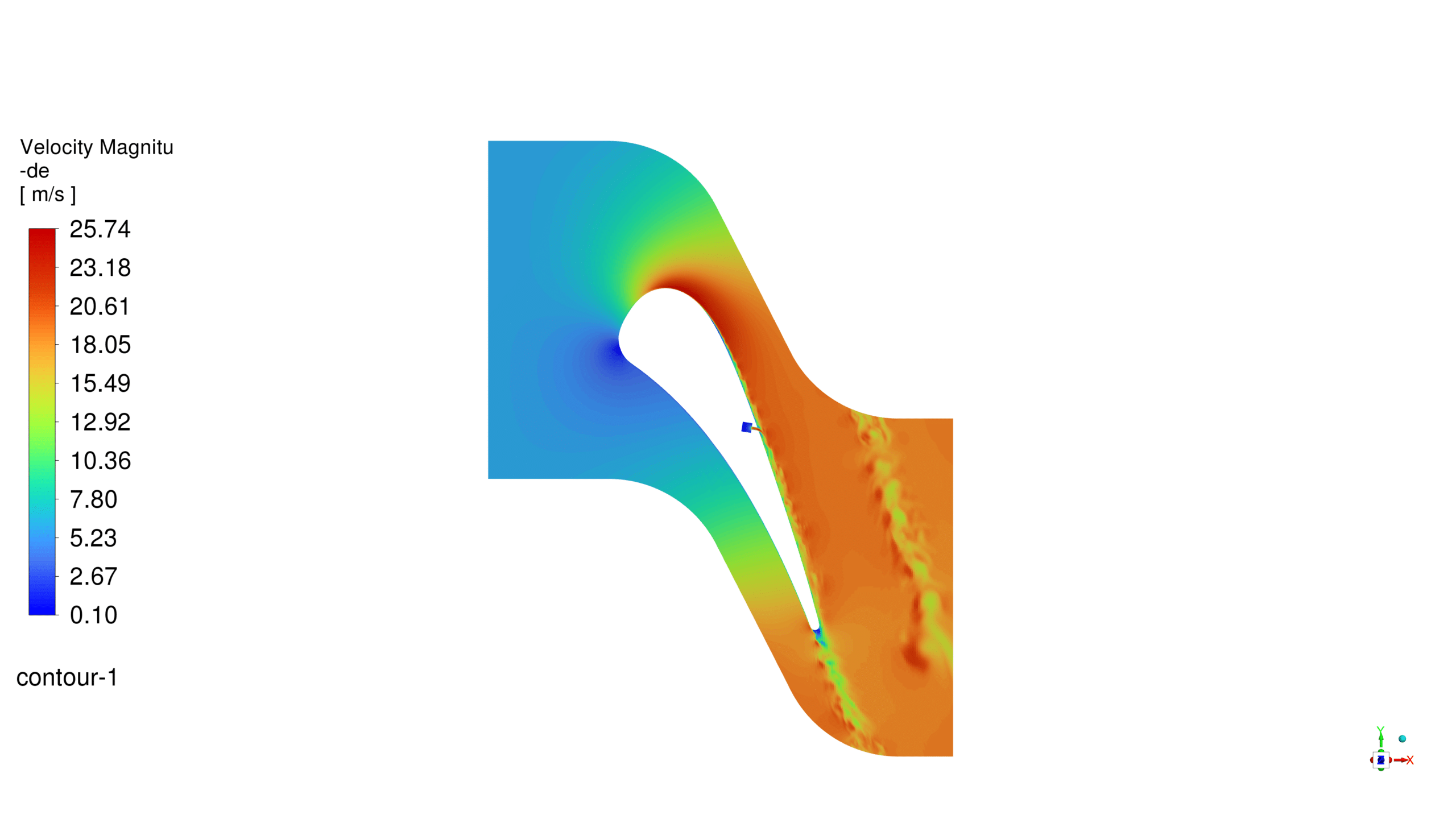 Velocity contours show acceleration of flow around the vane, with maximum velocities occurring near the trailing edge. The LES model captures higher velocity gradients and more complex flow structures, suggesting better resolution of turbulent eddies compared to the k-Omega SST model.