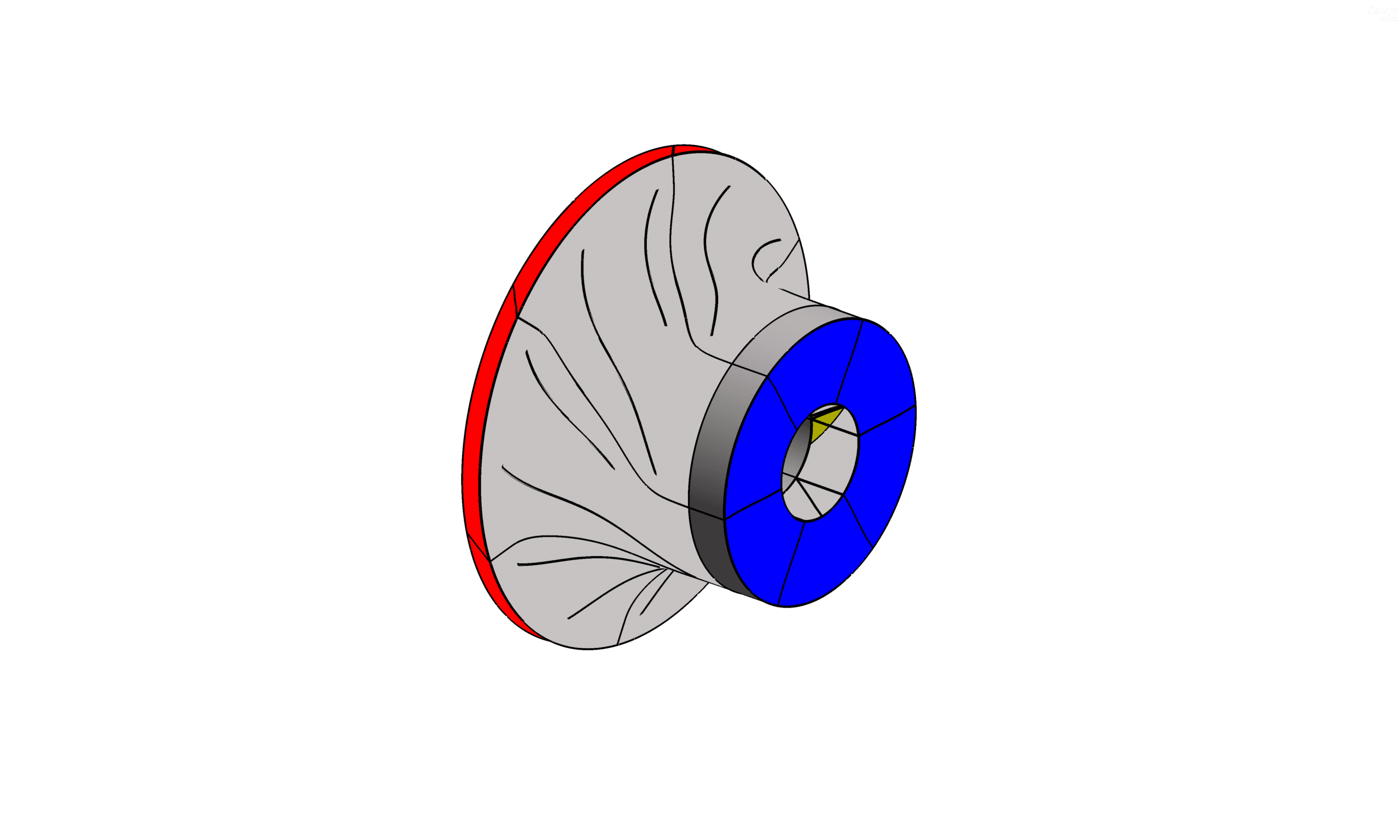 The simulation employs a pressure-based solver, with air modeled as an ideal gas to capture compressible flow behavior typical of turbocharger applications. A steady-state approach is adopted to represent continuous operation under constant inlet conditions. The SST k-ω turbulence model is used to accurately resolve the complex flow structures within the turbocharger, while the energy equation is enabled to account for temperature distribution and heat transfer. To reduce computational cost without sacrificing accuracy, periodic boundary conditions are applied, allowing simulation of only one-sixth of the geometry; accordingly, the total mass flow rate of 0.1 kg/s is scaled to 0.01666666 kg/s. The inlet temperature is set to 350 K. Additionally, the Frame Motion model is employed to simulate blade rotation at 92,000 rpm, ensuring accurate representation of the turbocharger’s high-speed operation.