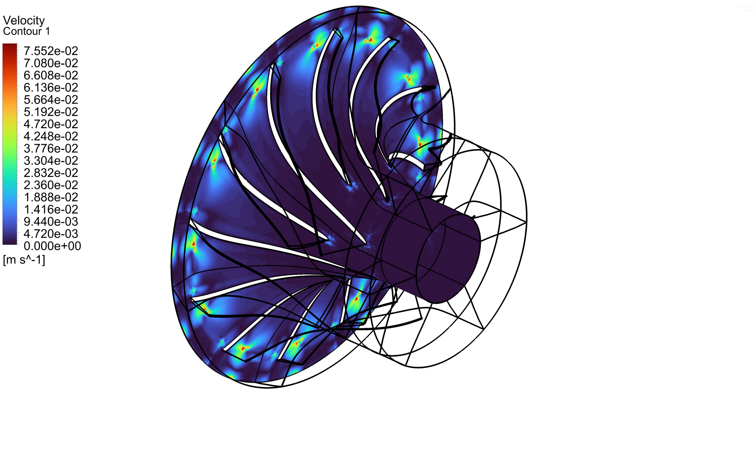 The results show that the turbocharger impeller accelerates the flow through the blade passages, creating localized high-velocity regions near the blade leading edges and flow channels, while lower velocities remain near the hub and blade surfaces. The pressure contours indicate a clear pressure rise across the impeller, with higher pressure on the pressure side and outlet region and lower pressure near the inlet and suction side, confirming effective energy transfer and compression of the fluid.