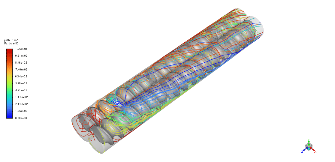 - This complex simulation, involving dynamic meshing and high computational demands, reveals insights into particle tracking and residence time as the extruder operates at 300 rpm with a 60-degree rotation scope.