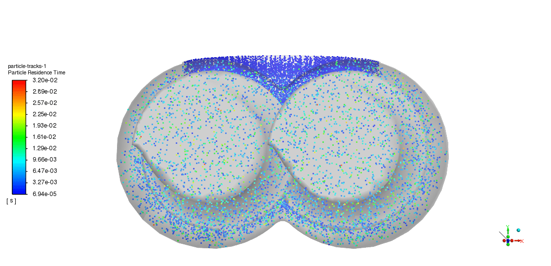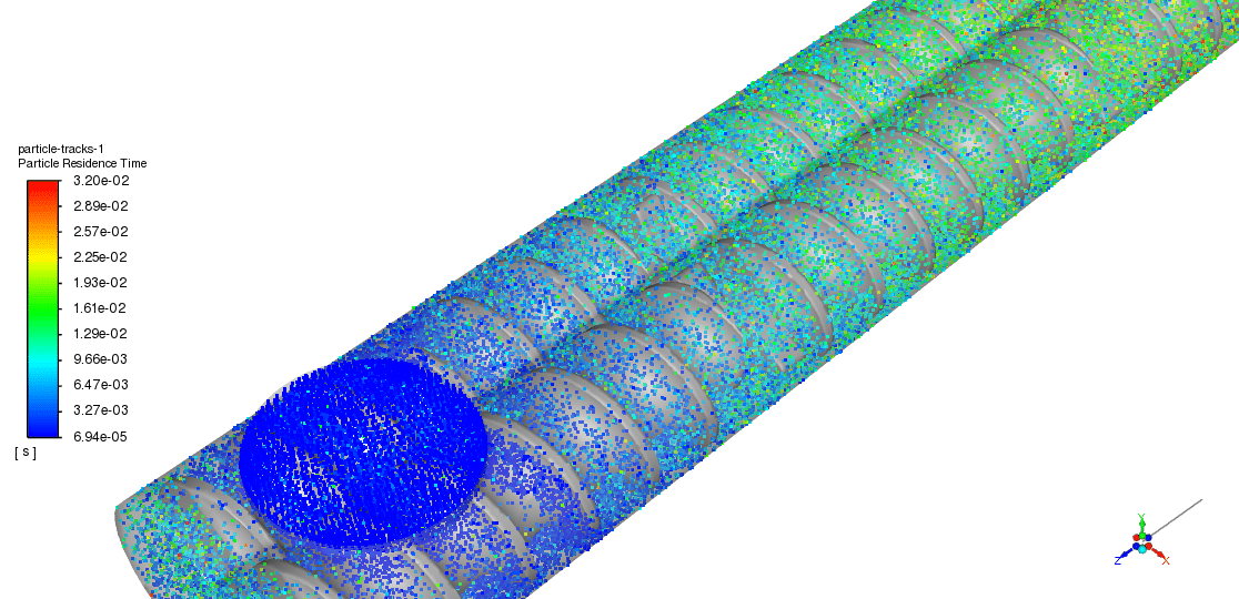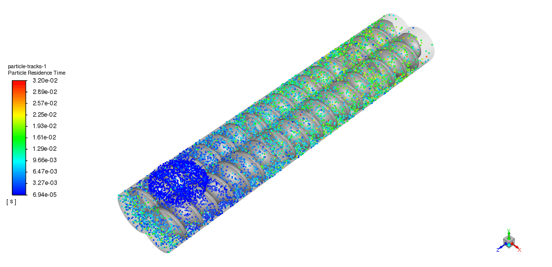 After the simulation process, the particle tracking was extracted as shown in the figure. Note that, the twin screw was covered by 60-degree rotation. In the following, the particle’s residence time contours are shown from different views.
