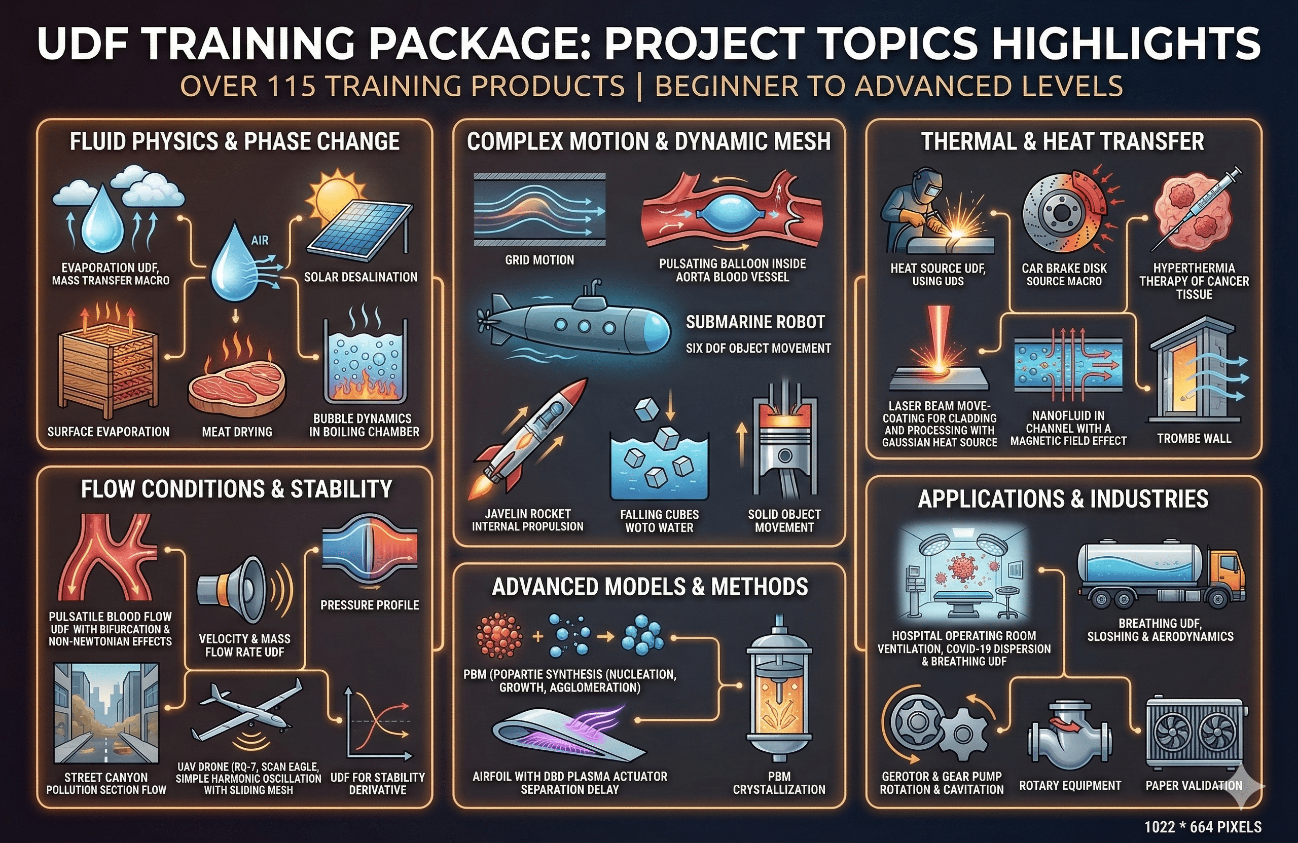 Empower your engineering team with MR CFD’s extensive “User Defined Function (UDF) GOLDEN Training Package.” Designed for university professors, CEOs, managers, institutes, and major companies, this collection of more than 115 ANSYS Fluent tutorials turns beginners into proficient users, ready to tackle projects in the advanced UDF applications in the related engineering fields and industries.