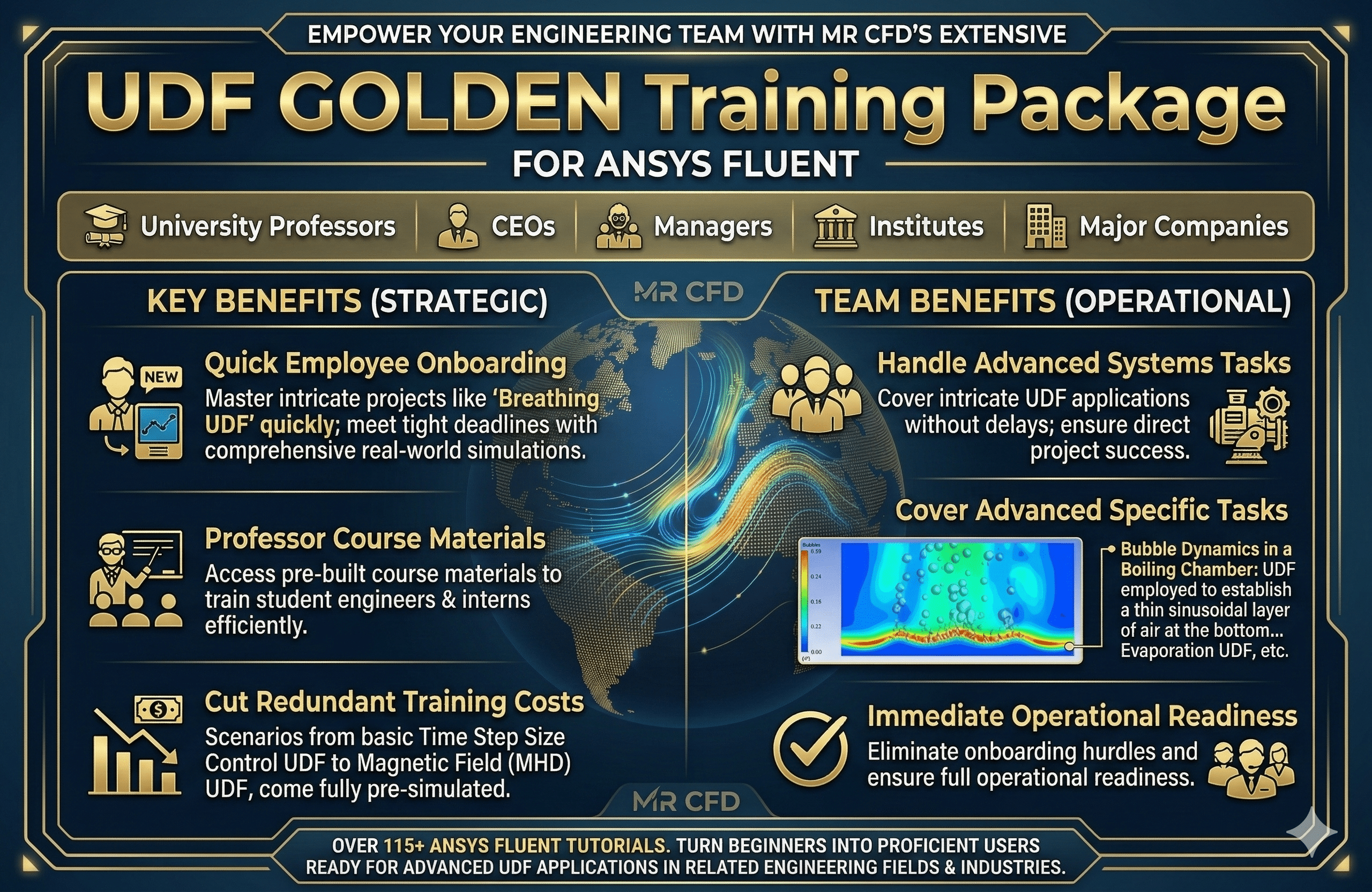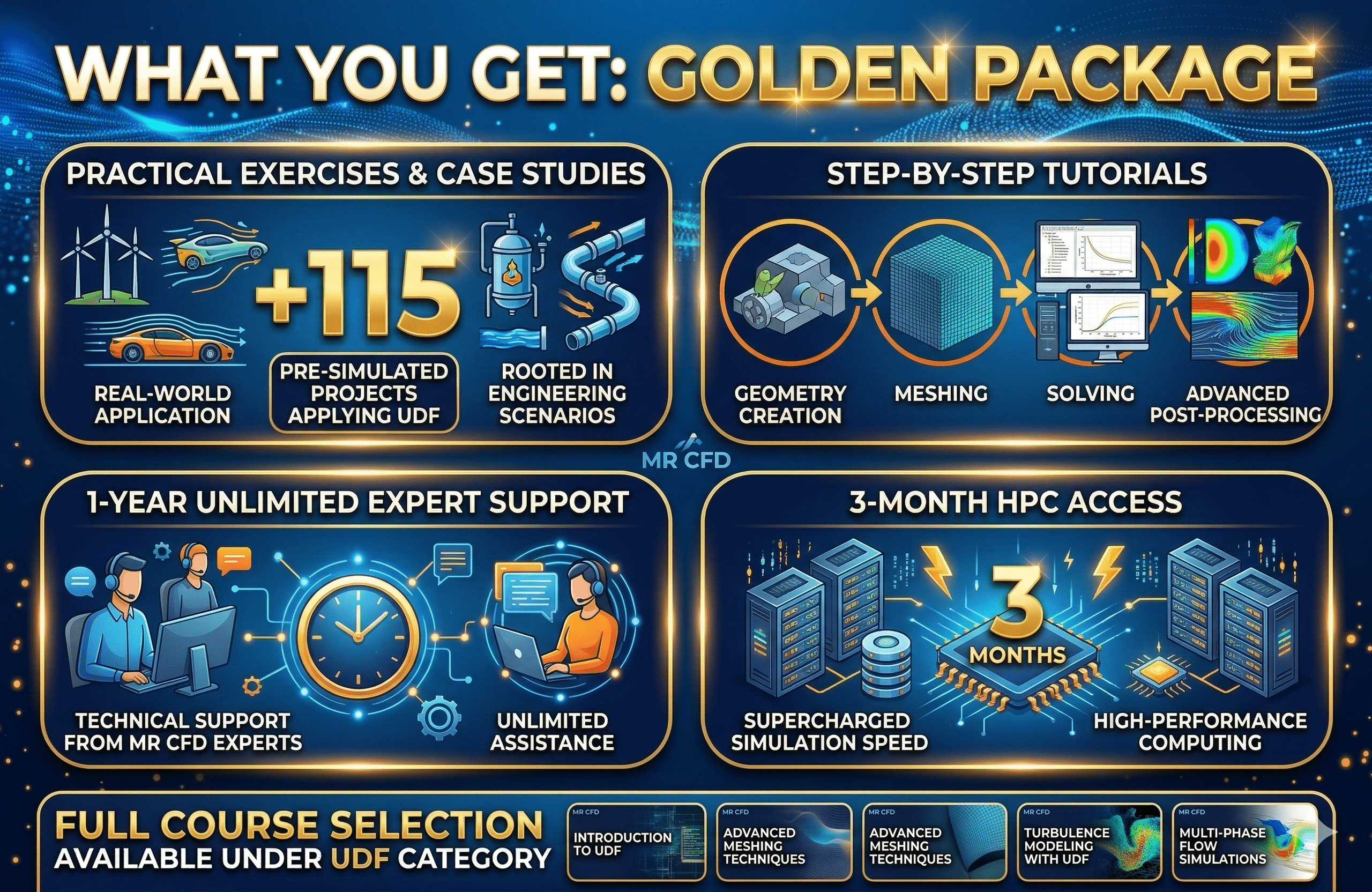 MR CFD’s “UDF GOLDEN Training Package” is a comprehensive ANSYS Fluent training library that turns engineers, students, and technical teams into expert users of User-Defined Functions across real industrial CFD projects. It bundles more than 115 pre-simulated UDF tutorials, one year of expert support, and three months of HPC access to fast‑track onboarding, reduce training costs, and standardize advanced UDF practices across organizations.
