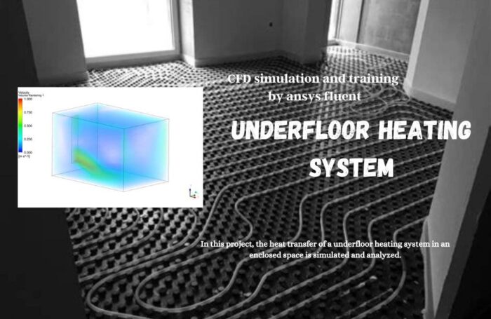 In this project, the heat transfer of an underfloor heating system in an enclosed space was simulated and analyzed by ANSYS Fluent. it is assumed that the underfloor heating system generated heat flux is assigned to the bottom wall (other walls are considered to be adiabatic). Since in this analysis, an underfloor heating system is used to generate heat, no fluid flow inlet is used in this project and only a pressure outlet is defined. The heat transfer is of the free convection type and gravity acceleration must be considered. The energy and k-epsilon Realizable models are used to solve the energy equation, and fluid flow parameters and to thoroughly analyze the effects of buoyancy and volumetric forces resulting from density changes. It should be noted that the ideal gas model has been used to determine the density changes in proportion to temperature.