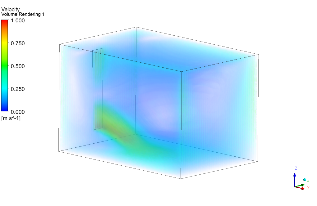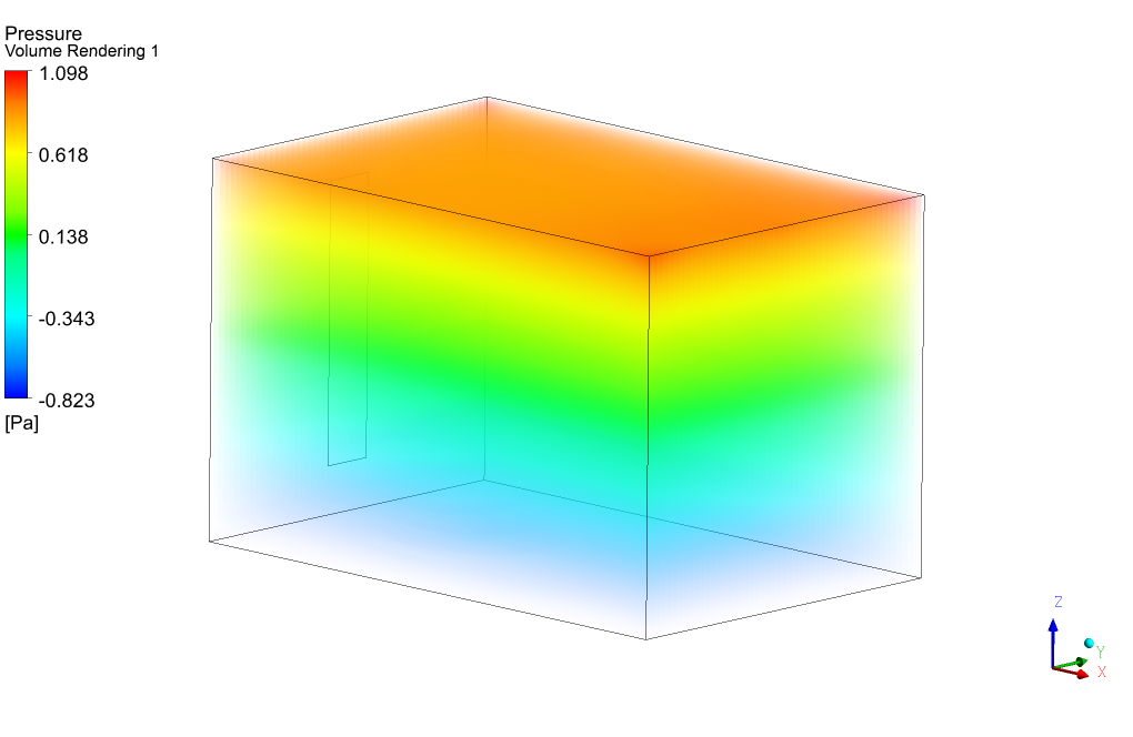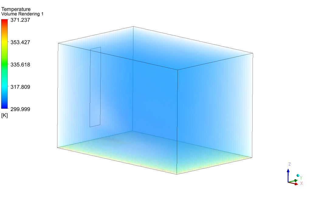In this CFD simulation, buoyancy effects due to temperature variations are accounted for through the use of the ideal gas model, which allows density changes to be calculated in relation to temperature. The k-epsilon realizable model, along with the energy equation, is utilized to thoroughly analyze the effects of buoyancy and volumetric forces that result from these density changes. Additionally, the simulation is configured to include the gravitational acceleration as -9.81 m/s² in the Z direction to ensure that natural convection is driven appropriately within the room.