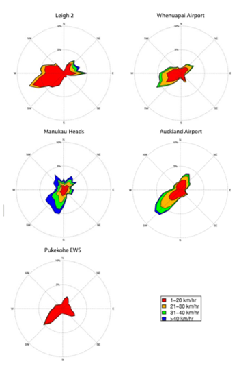 Mean wind speed data (average wind speeds taken over the 10 minutes preceding each hour) are available for several sites in Auckland, illustrating the region’s different wind regimes. Coastal areas (e.g., Auckland Airport) tend to be windier than sheltered inland areas throughout the year.