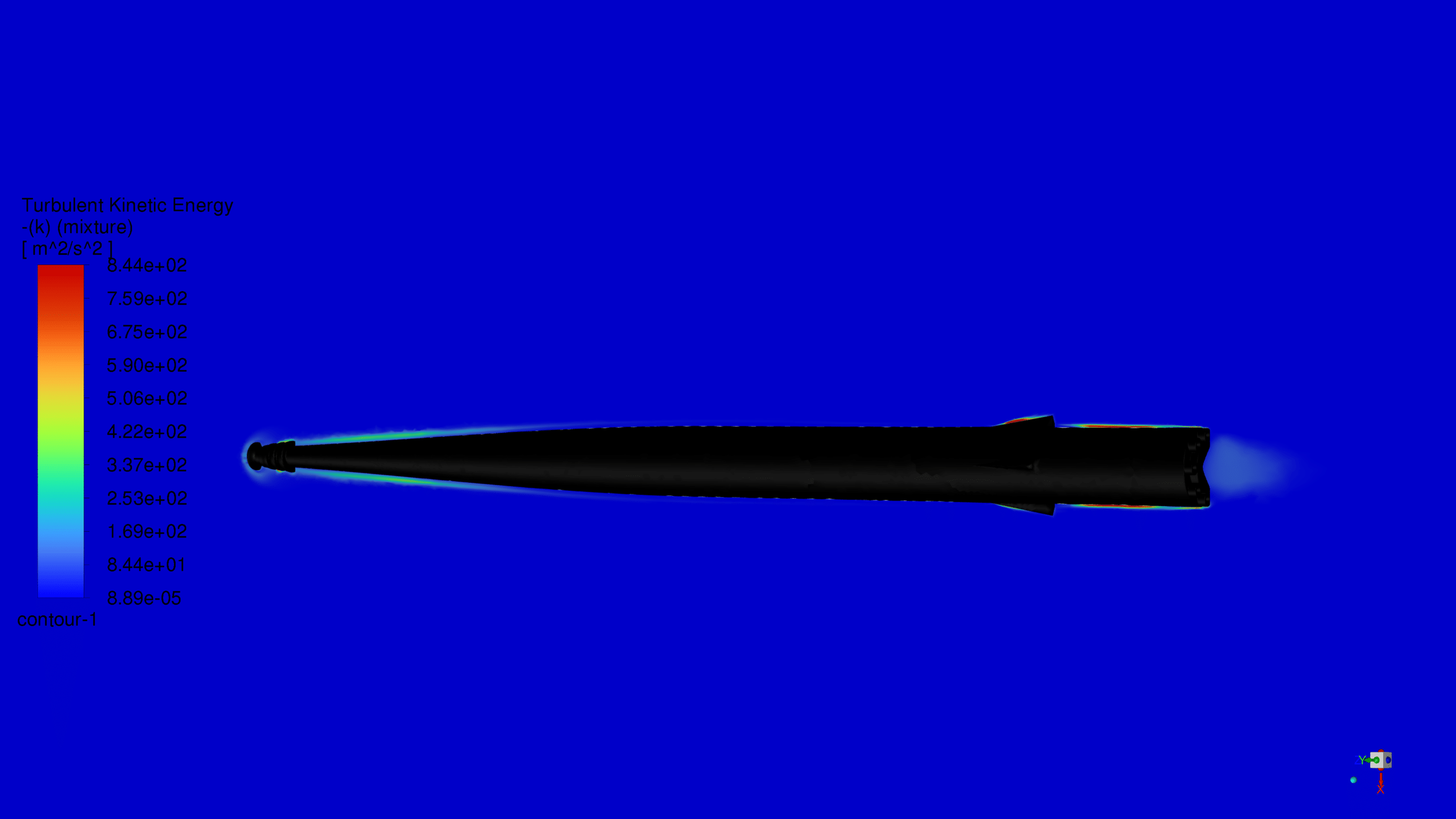 The turbulent kinetic energy contour highlights the increased turbulence levels in the wake region due to the collapse of vapor cavities. This turbulence can contribute to additional drag forces and affect the stability of the rocket.