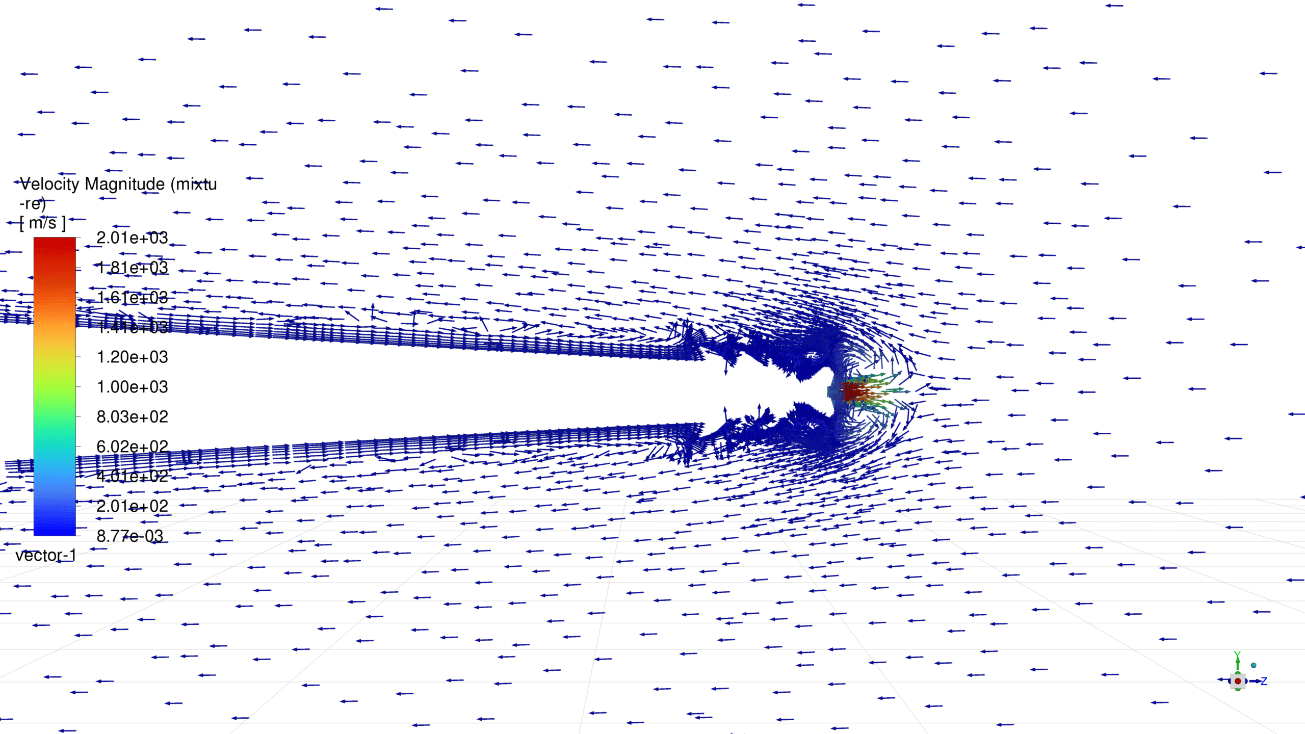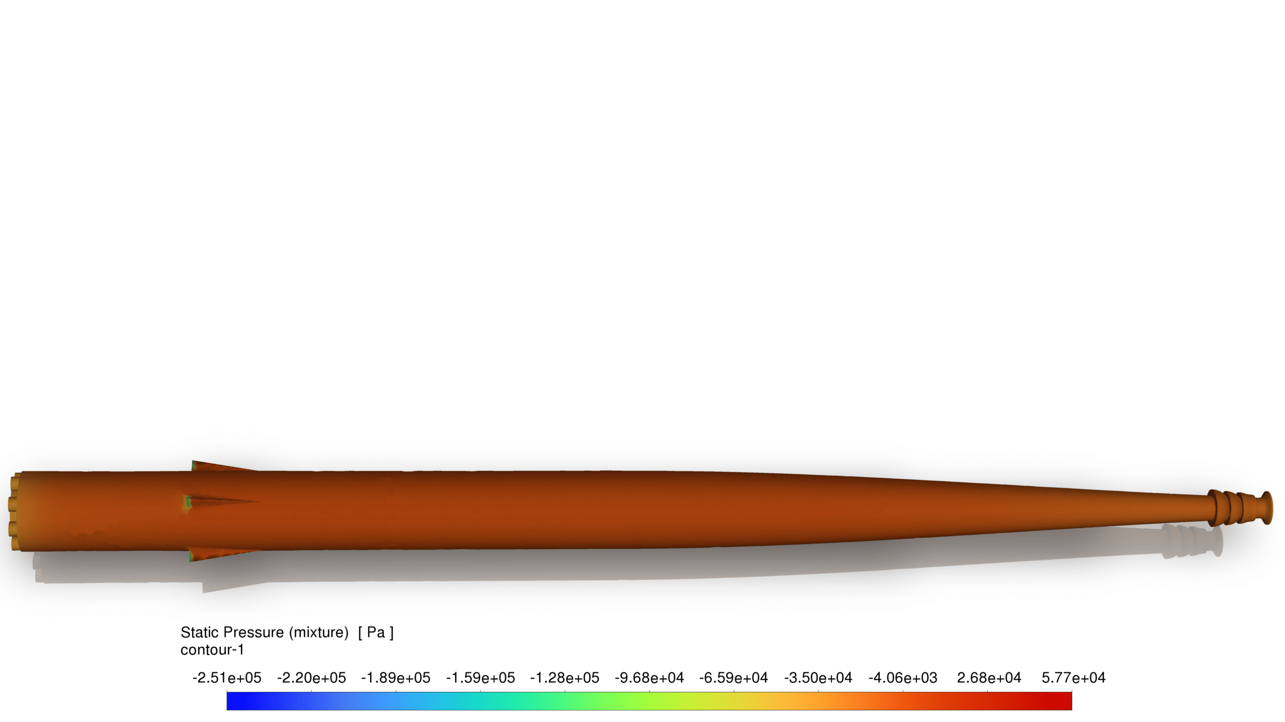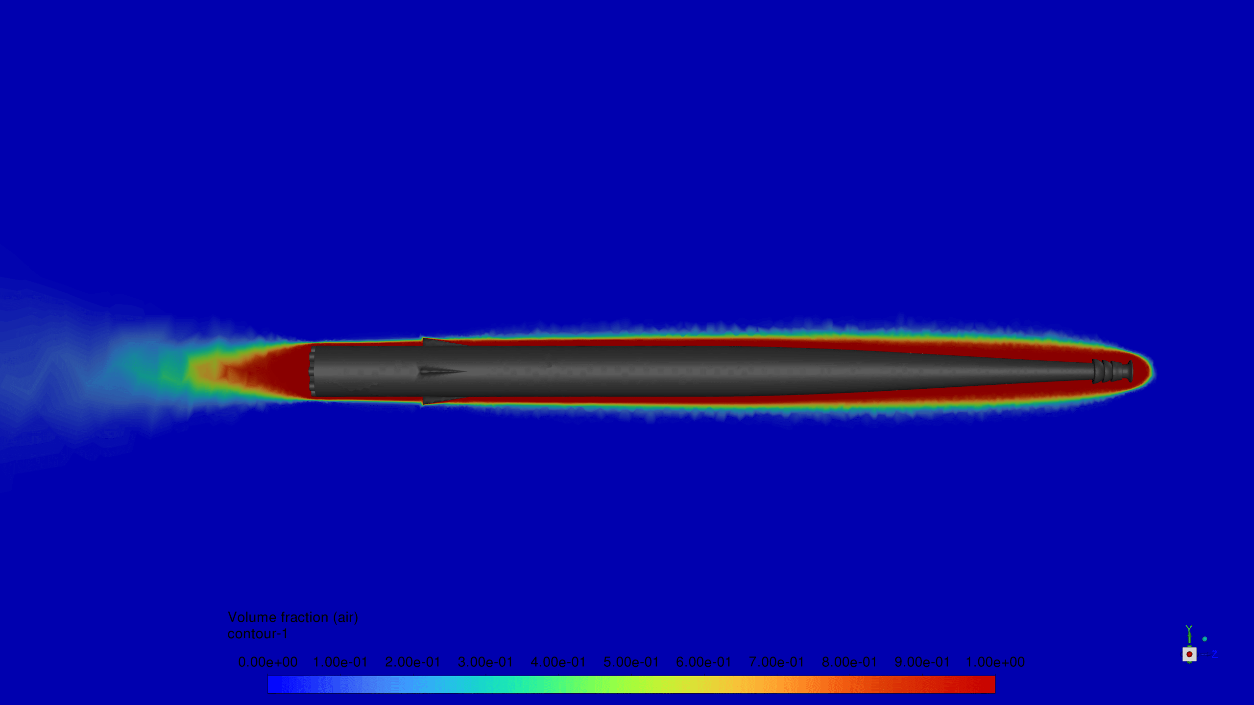 The significant drag reduction observed in the supercavitation case can be attributed to the formation of a vapor cavity around the rocket. When air is injected at a high velocity (2000 m/s in this case), it creates a low-pressure region around the rocket, causing the surrounding water to vaporize and form a cavity. This vapor cavity envelops a large portion of the rocket’s surface, effectively reducing the wetted area and minimizing the direct contact between the rocket and the water.