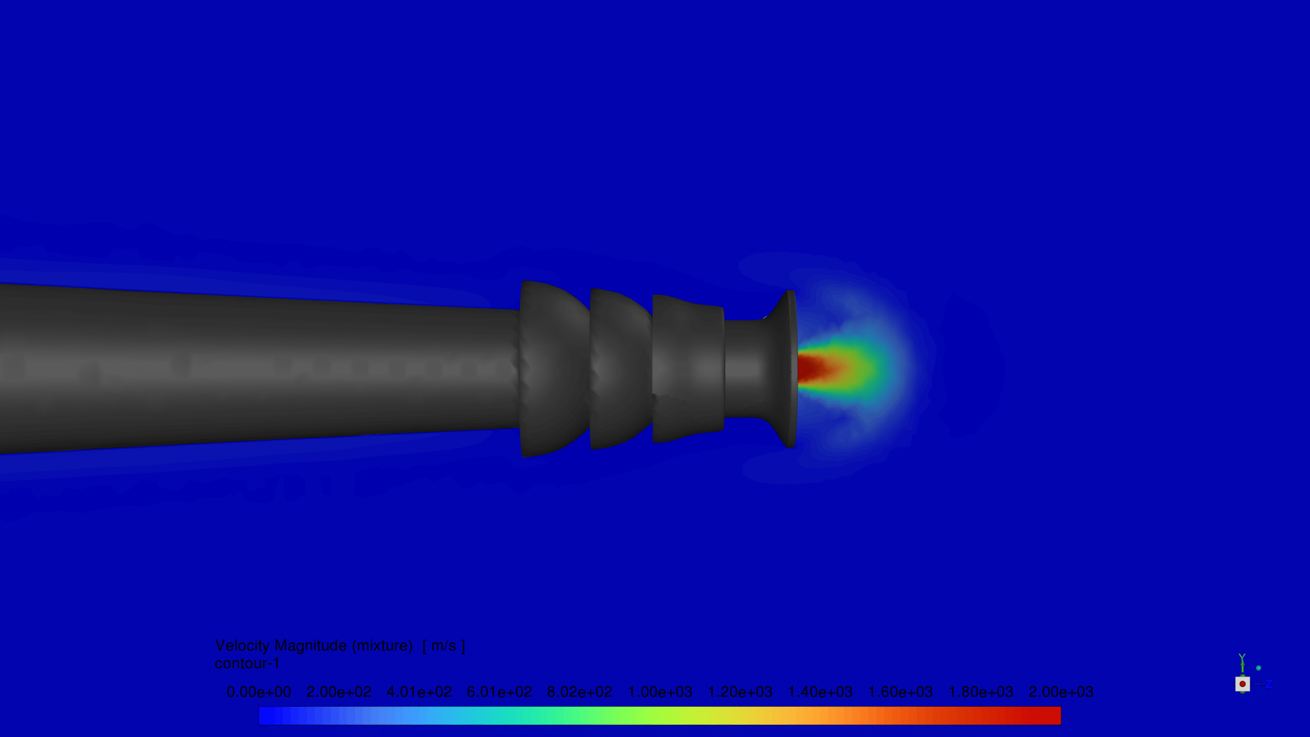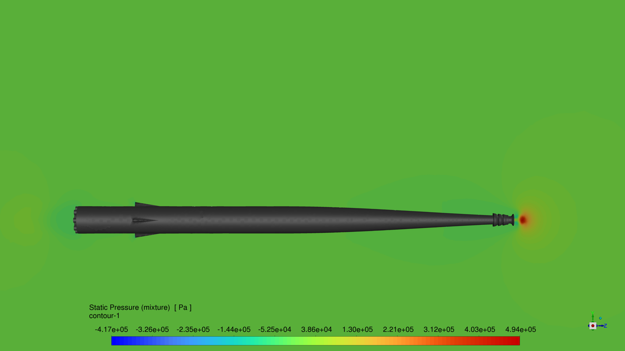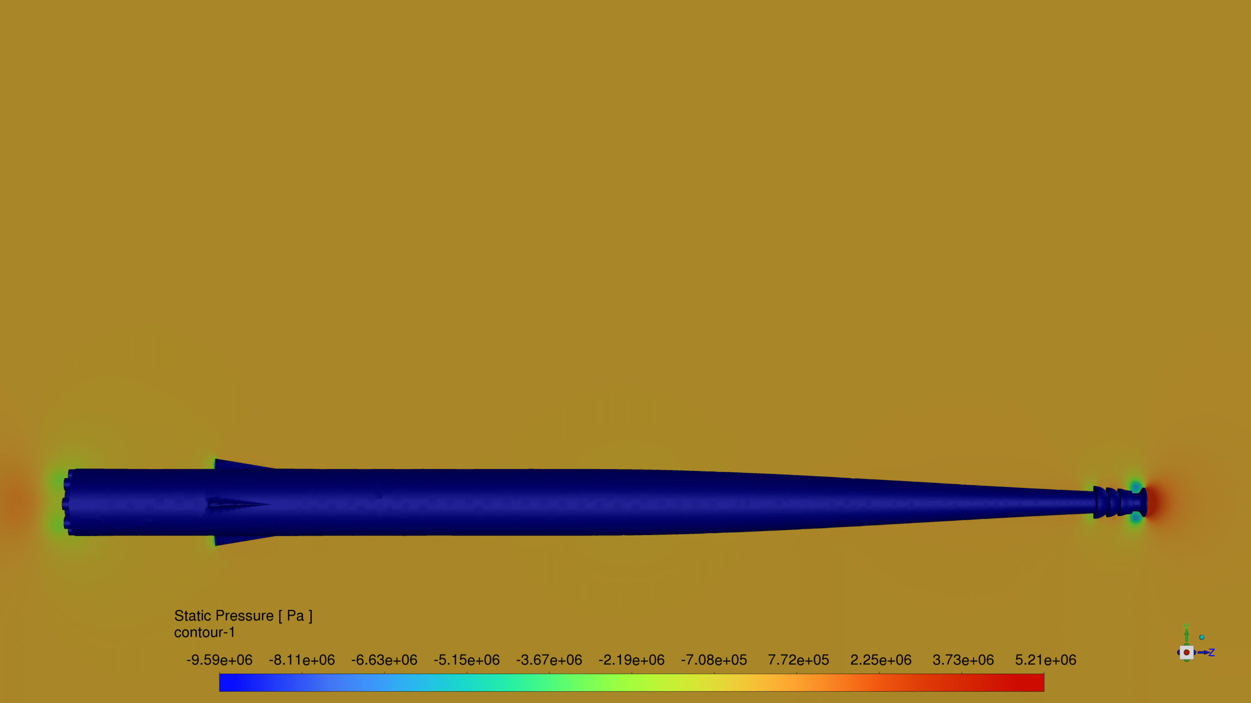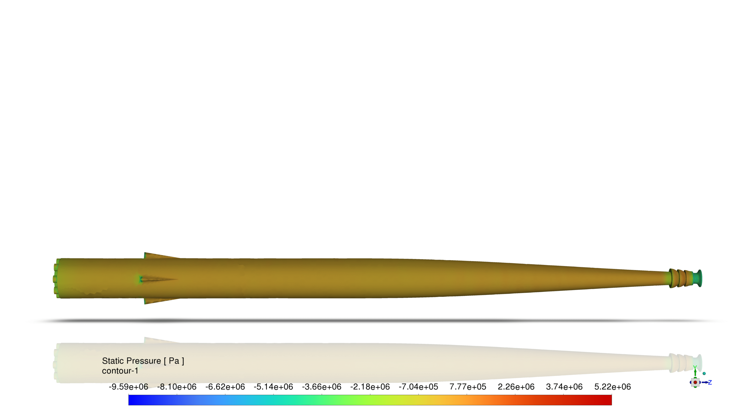 The significant drag reduction observed in the supercavitation case can be attributed to the formation of a vapor cavity around the rocket. When air is injected at a high velocity (2000 m/s in this case), it creates a low-pressure region around the rocket, causing the surrounding water to vaporize and form a cavity. This vapor cavity envelops a large portion of the rocket’s surface, effectively reducing the wetted area and minimizing the direct contact between the rocket and the water.