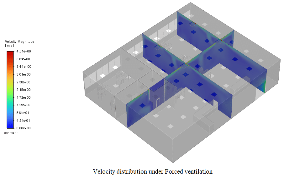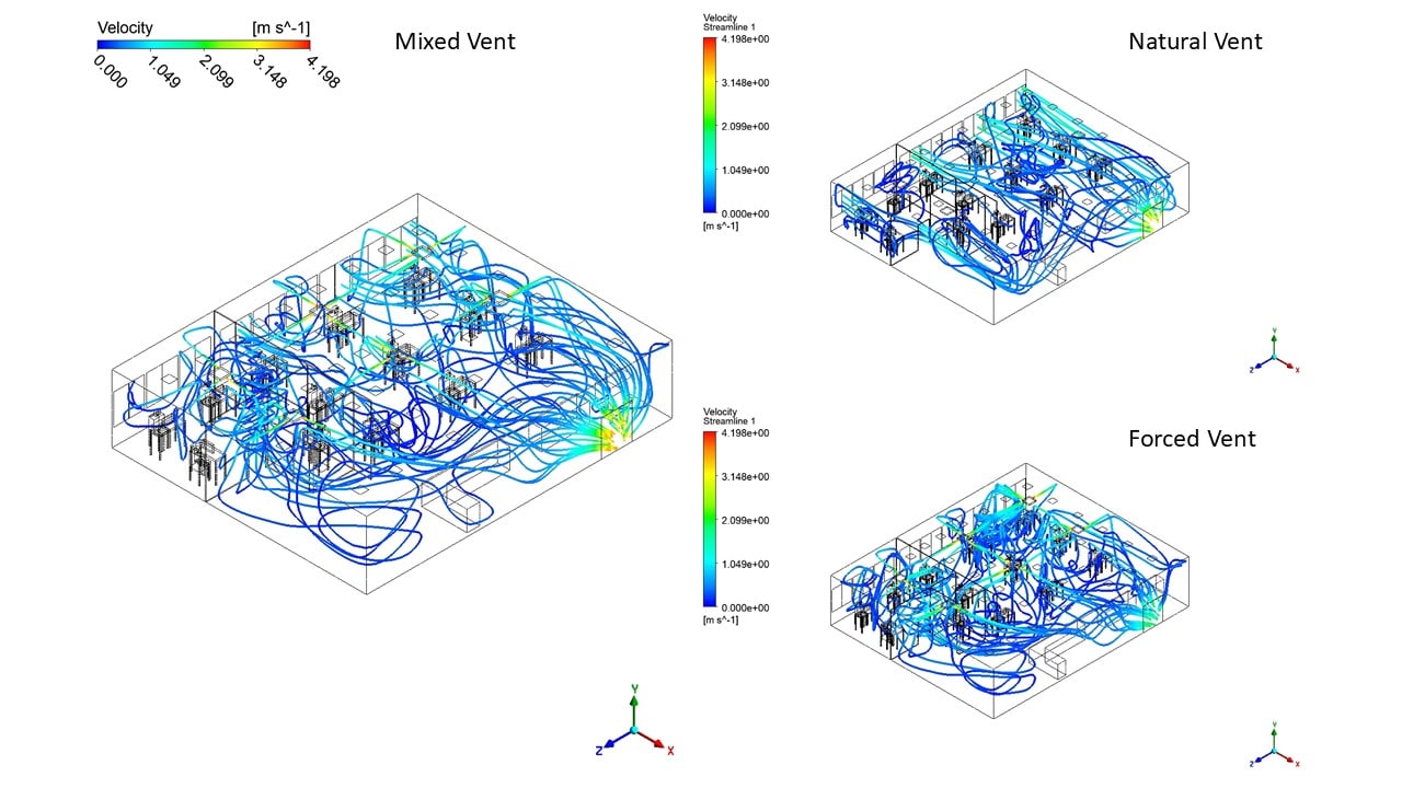 - Focused on understanding airflow patterns and virus dispersion under various scenarios: forced, mixed, and natural ventilation.