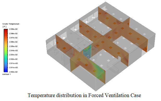 In the new condition, volume average temperature inside the room for natural, forced and mixed ventilation cases reported: 286.7K, 296.37K & 292.34K. As discussed before and seen in the contours, the natural ventilation makes a uniform and better pattern of flow from the windows toward the outlet door. This result in better ventilation and thermal condition inside the room. But when the windows are closed and just fans are working, the temperature increases inside and reach 296.3K. Using both windows and fans for ventilation hastens air circulation and decreases temperature. However, the temperature distribution is uniform in all places of the office in Natural and Forced ventilation cases, but in the mixed ventilation case, it is not uniform and some areas are better ventilated than the others.