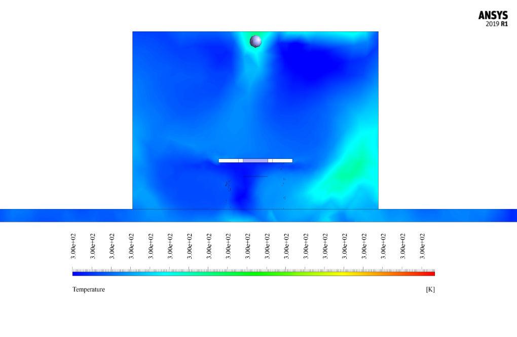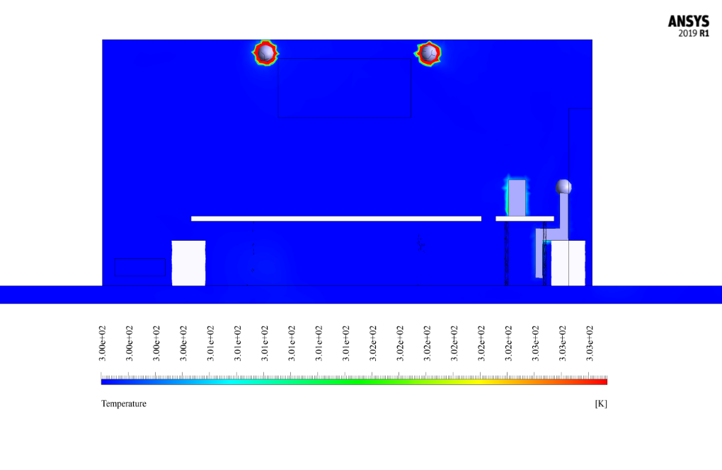 This indicates the proper operation of the air conditioning system to balance the temperature inside the room. Also, the temperature contours show the heat transfer inside the model differently. An increase in temperature is evident around the heat sources.